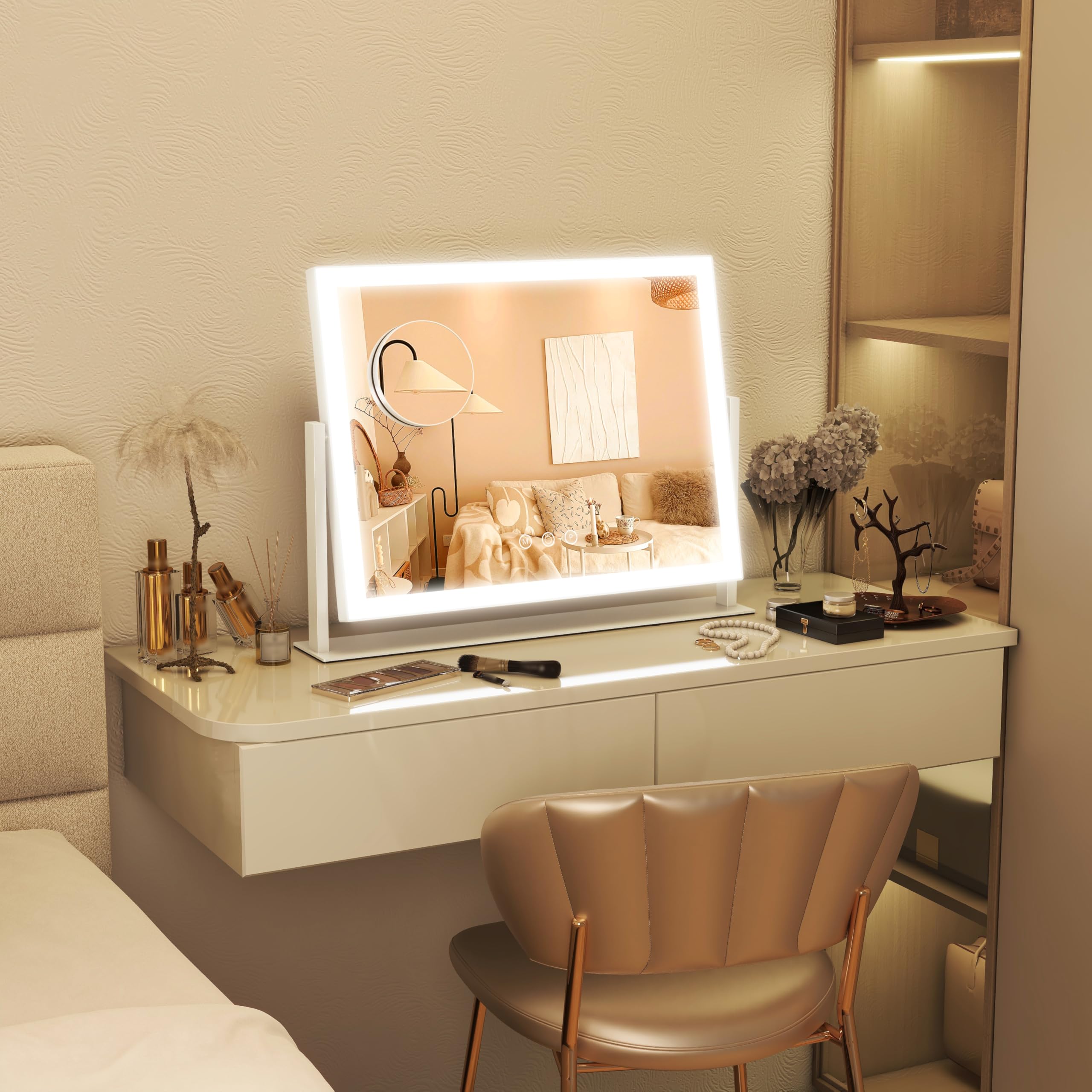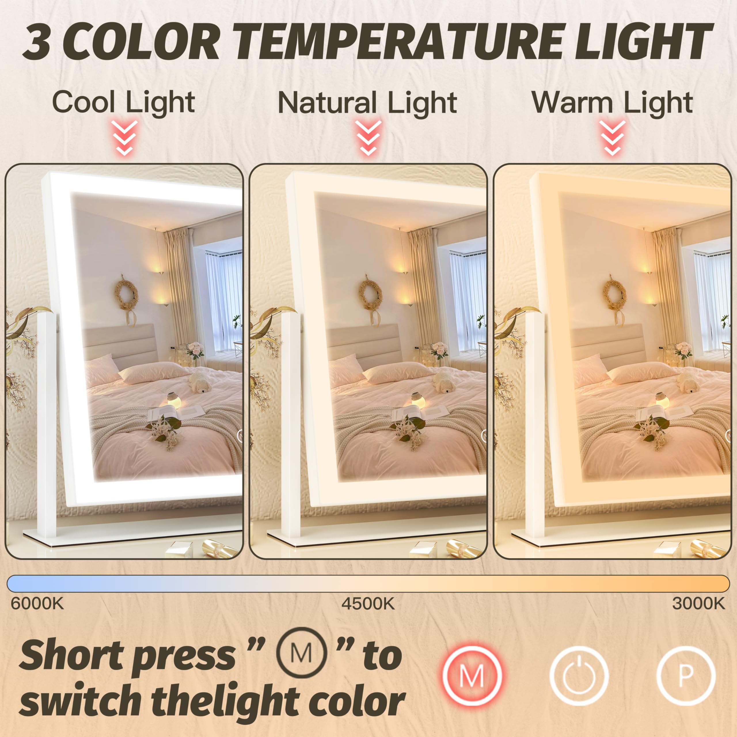 â ăPerfect Size & Minimalistic Square Designă This tabletop vanity mirror with lights is designed to be smaller in size than before, measuring 13"x17", provides a perfect upper body view. 360° rotation LED makeup mirror Adjust the mirror's angle effortlessly with its smooth swivel and tilt mechanism, ensuring you achieve the perfect viewing position every time.