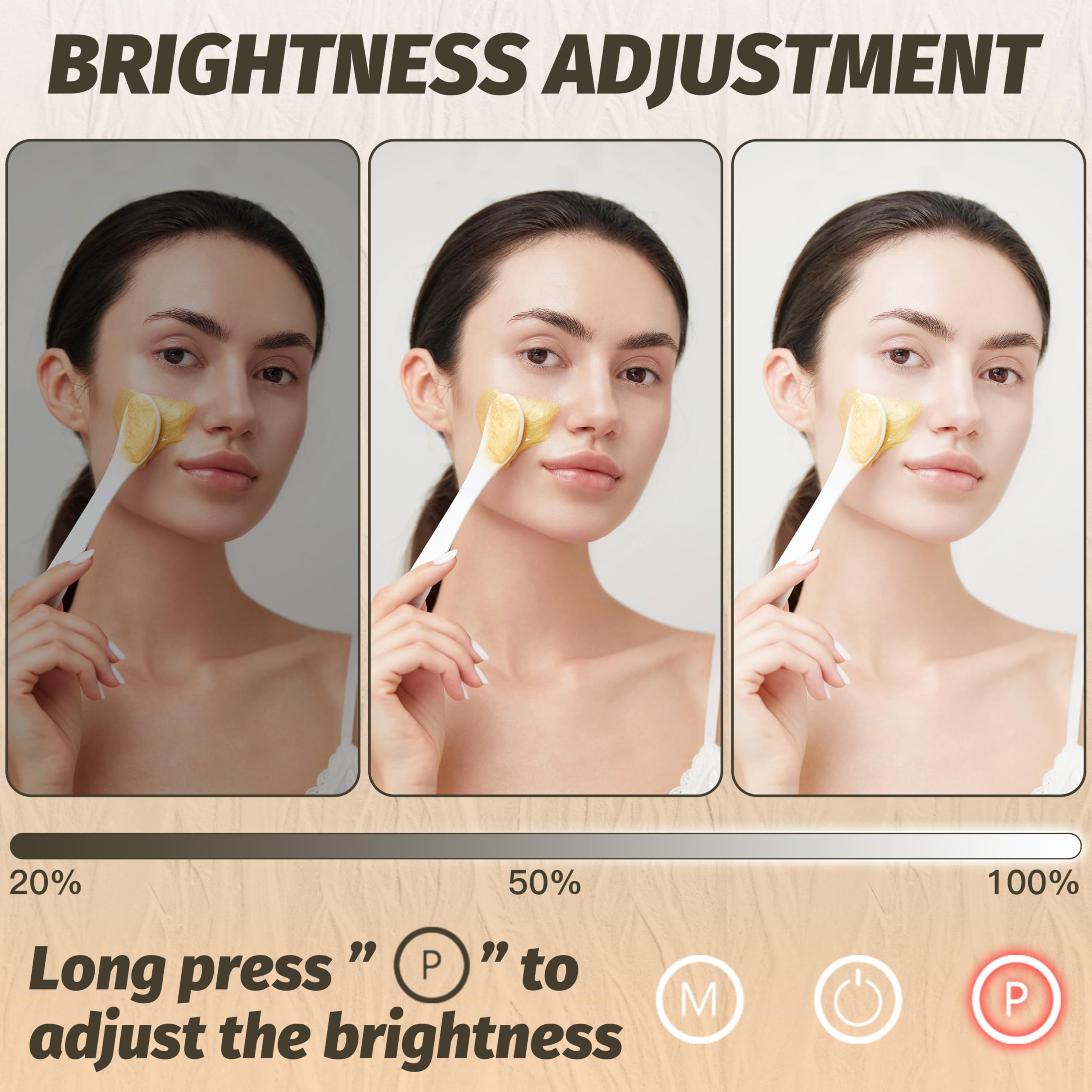 đăAdjustable Brightness & 3-Color Lighting Modesăincluding cold light/daylight/warm light three color settings, the brightness of each color can be adjusted; simulating lighting in various occasions to meet personal makeup needs. "M" button on the left is used to change the light mode, the middle button is used to turn on and off, and the "P" button on the right is used to adjust the brightness.