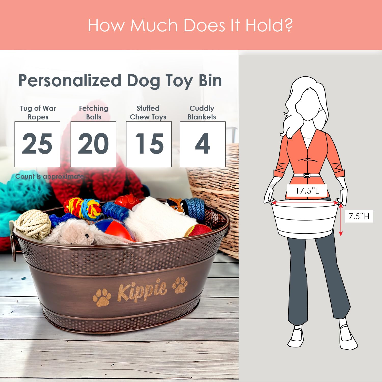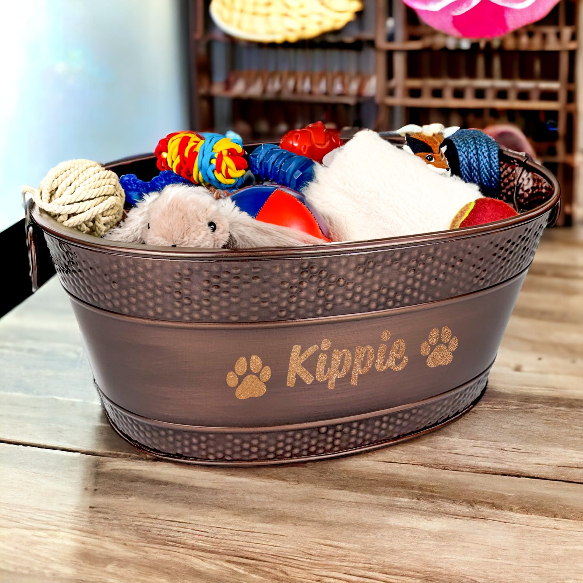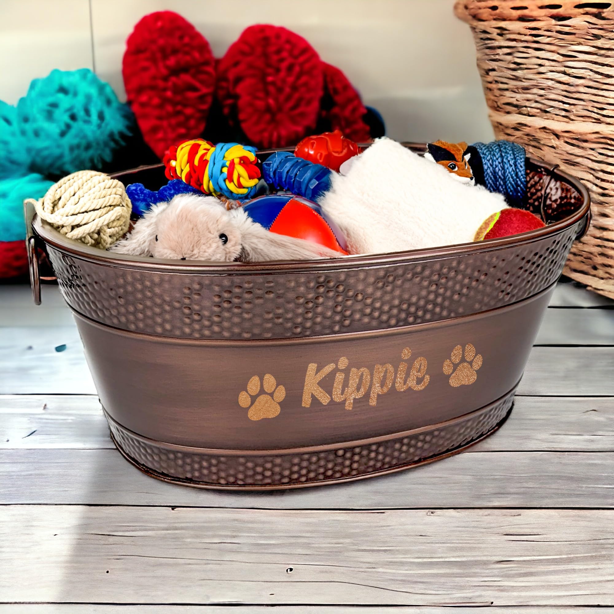 LONG LASTING: The last dog toy bin you'll ever need. Built with a hammered galvanized design, the tub is aesthetically pleasing in any part of your home.