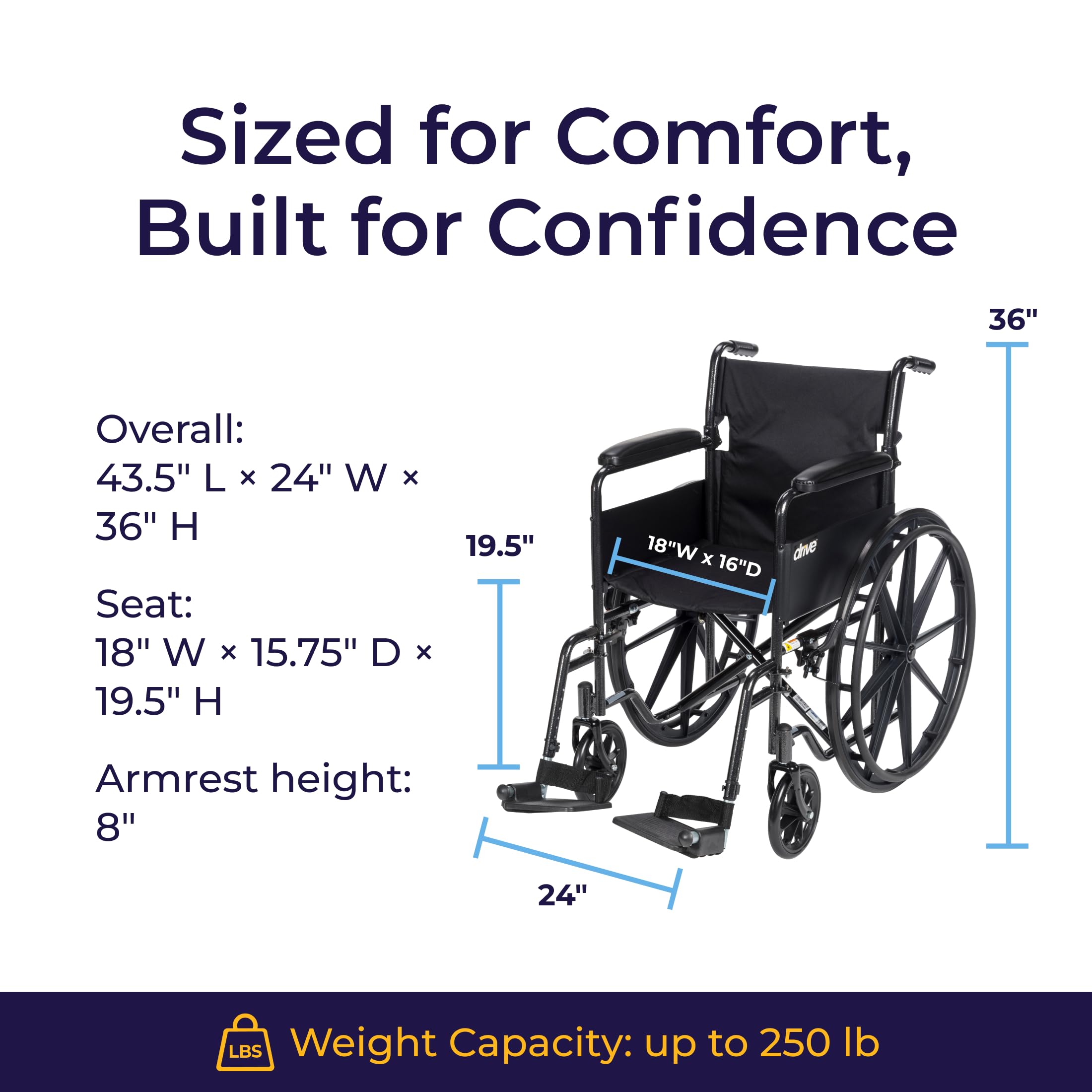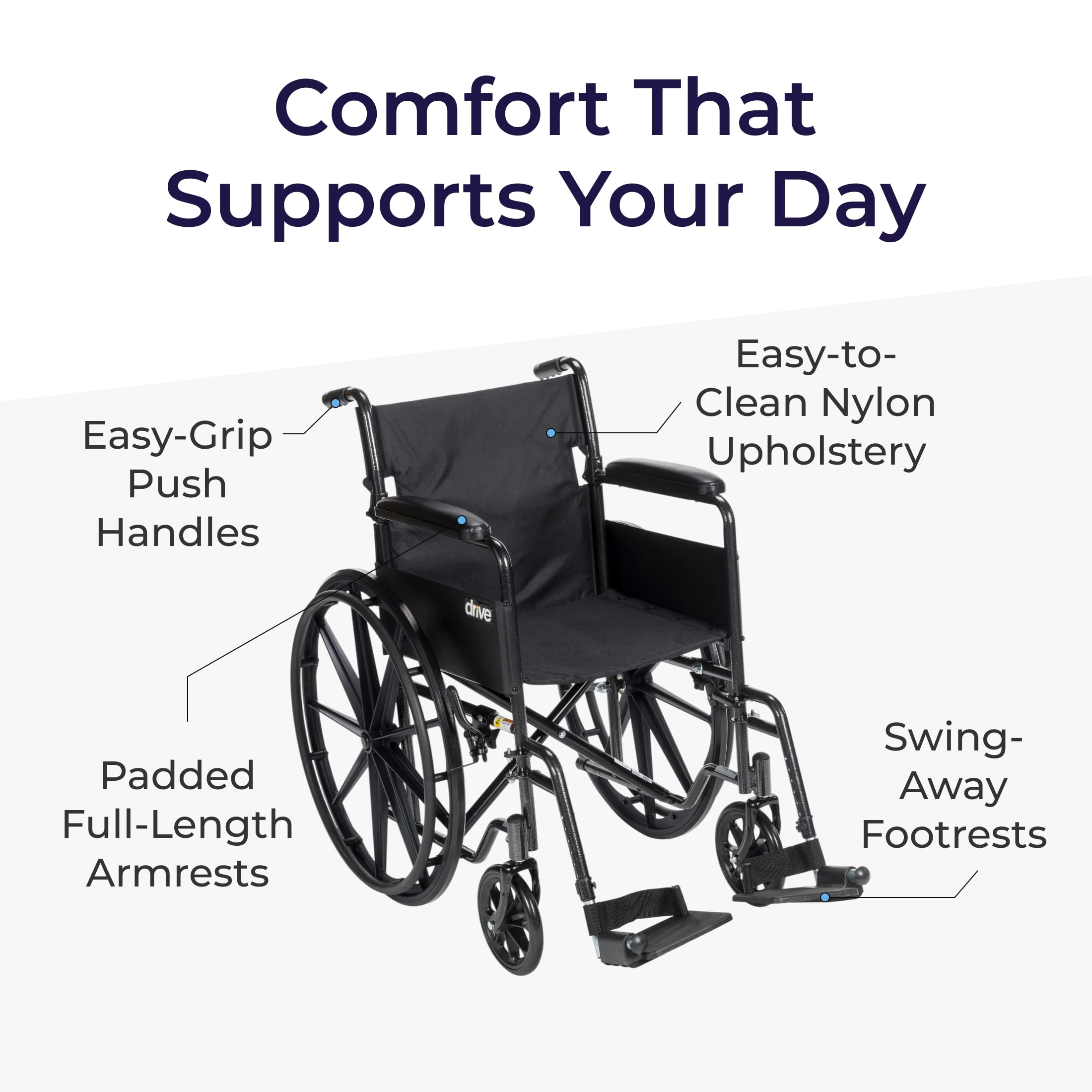 The Drive Medical Silver Sport 1 Folding Transport Wheelchair is designed to provide dependable, comfortable mobility support for adults and seniors who need assistance during travel, appointments, or daily outings. Built with a durable powder-coated silver vein steel frame, this transport chair balances long-lasting strength with user-friendly portability. Weighing just 37.6 lb, it is easy for caregivers to maneuver, fold, and lift into a vehicle, making it a practical option for both short-term recovery and ongoing mobility needs. Comfort is a core feature of the Silver Sport 1. The chair includes full-length padded armrests that offer steady support and reduce pressure on the arms during extended use. Its nylon upholstery is not only supportive and breathable but also simple to maintain and clean. The removable swing-away footrests allow users to position their legs comfortably and enable easy transfers in and out of the chair. When folded, the chair becomes compact, helping save space in storage and ensuring transport remains quick and convenient. With a weight capacity of 250 lb and optimized dimensions that balance comfort and portability, the Silver Sport 1 Transport Wheelchair is an excellent choice for individuals seeking a reliable, easy-to-use mobility solution. Since 2000, Drive Medical has proudly manufactured trusted medical equipment and homecare products that are used in homes and hospitals across the globe. We offer a wide range of products to support your family’s needs, from mobility to bath safety, from patient care to personal care. Our mission is simple: to enhance the lives of our customers with products that support safety, independence, and comfort. When you shop from Drive Medical, you’ll find unmatched quality, cutting-edge innovation, and products designed in partnership with clinical experts.