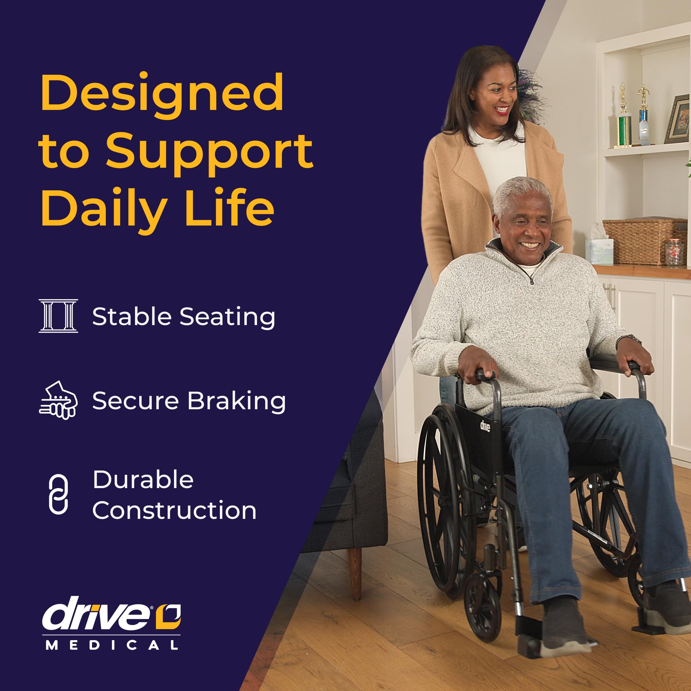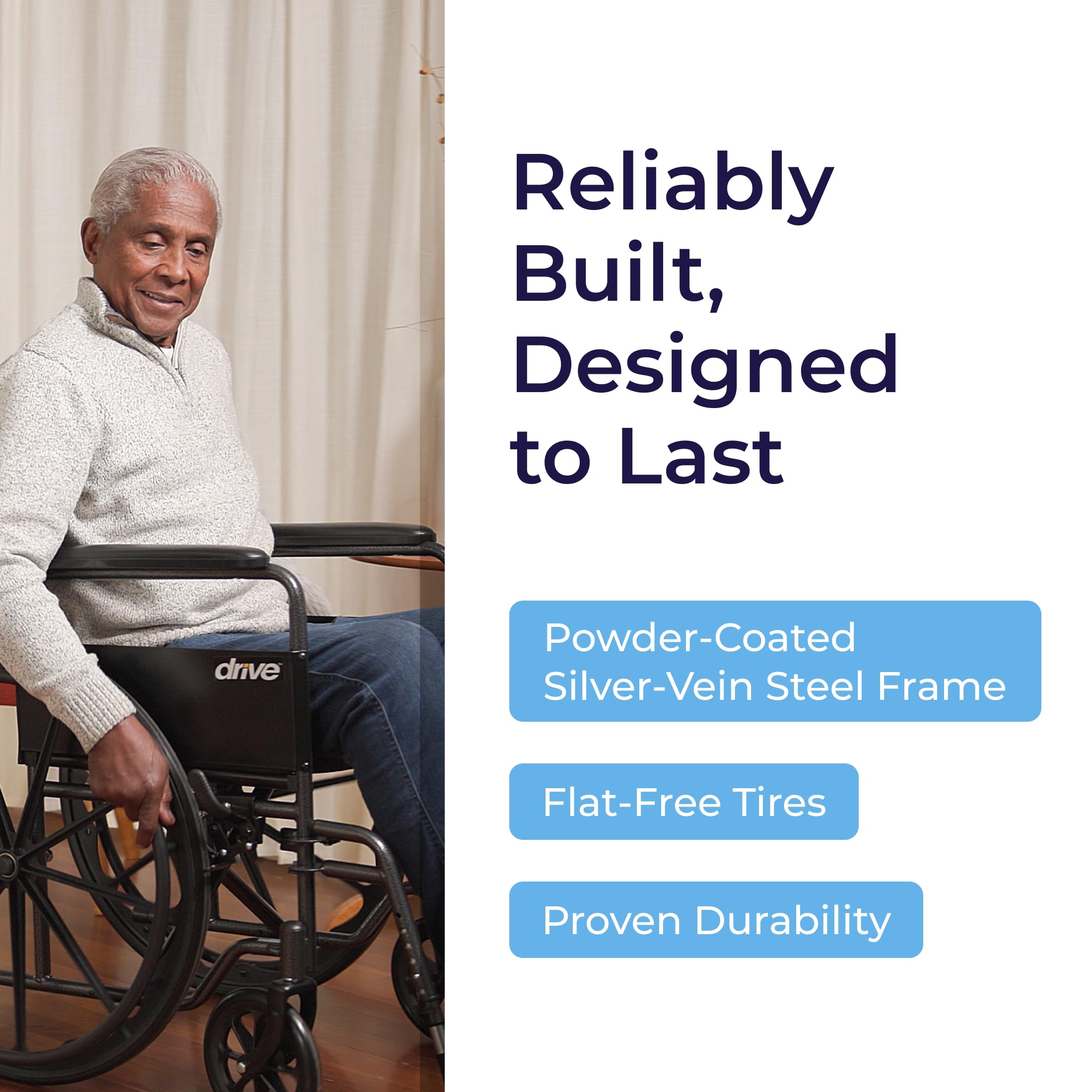 Reliable Low-Maintenance Build: This durable folding wheelchair comes equipped with urethane tires on composite wheels, push-to-lock brakes, and a strong frame supporting up to 250 lb