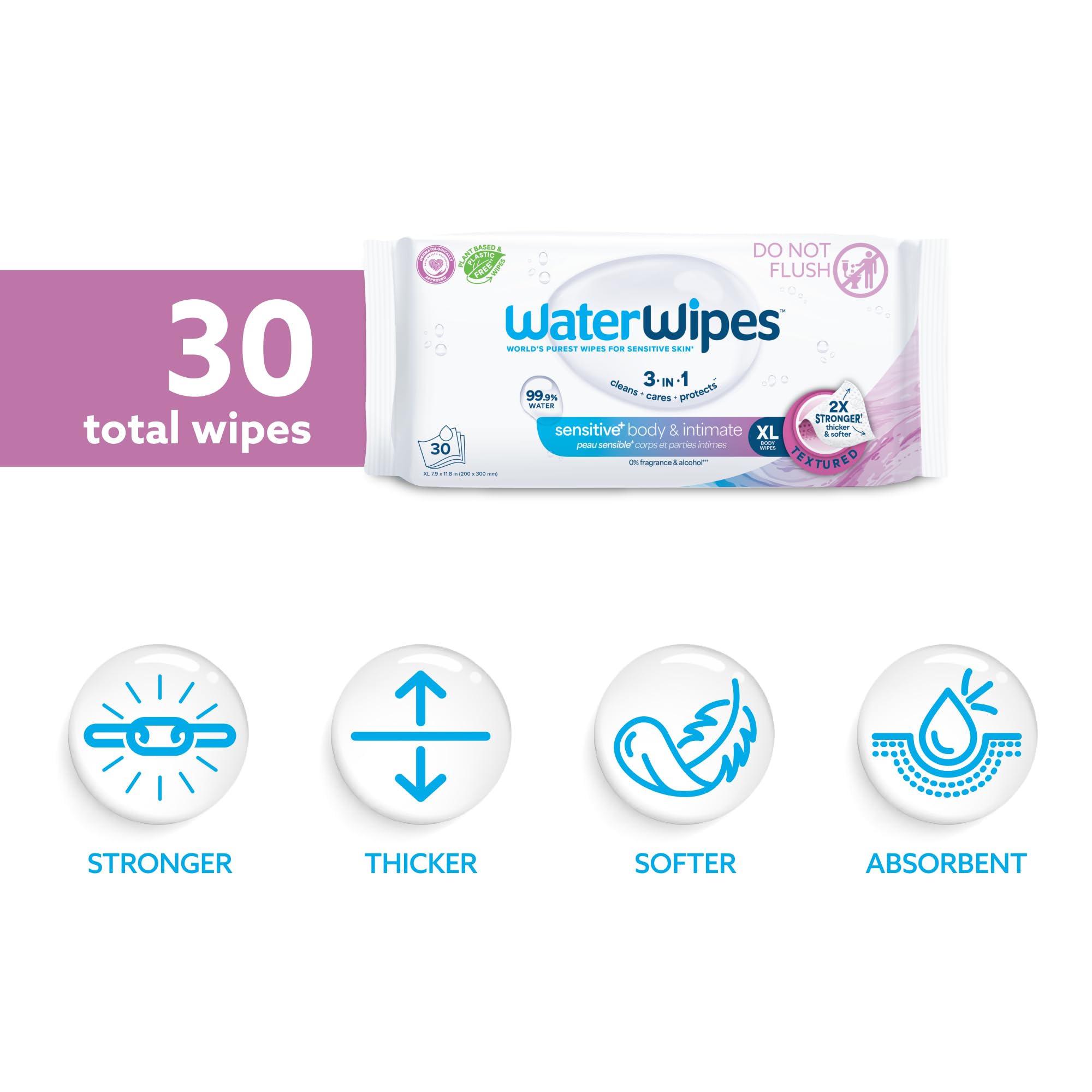 MADE FOR INTIMATE HYGIENE & INCONTINENCE CARE: WaterWipes Sensitive+ Body & Intimate unscented textured wipes gently clean, care and help protect sensitive skin thanks to its 99.9% purified water, plus a drop of fruit extract.
