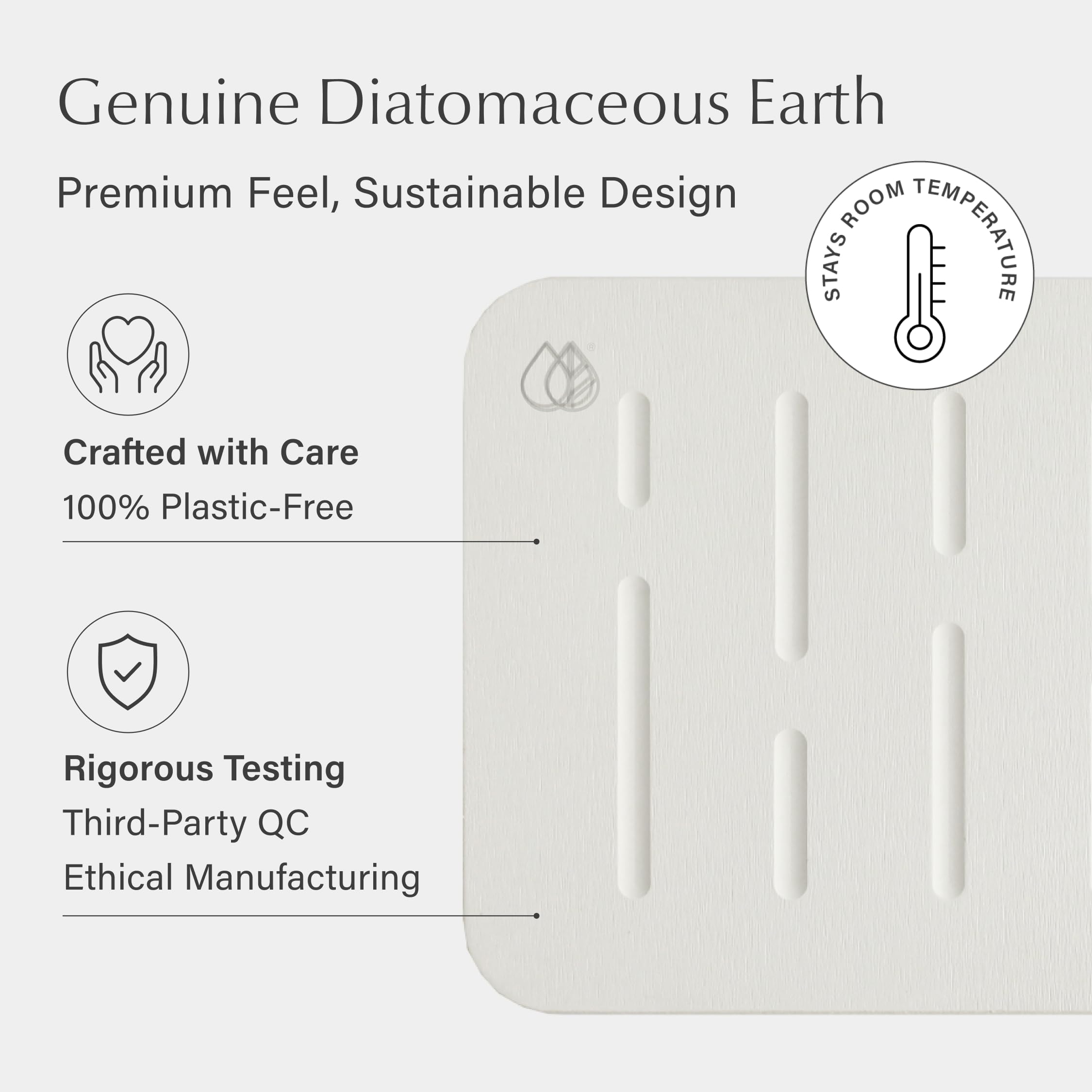 QUICK-DRYING DIATOMACEOUS EARTH: Our Diatomaceous Earth Stone Bath Mat absorbs up to 150% of its weight in moisture that evaporates within seconds. This ceramic-like material feels like natural stone, offering a hygienic and durable alternative to traditional bath mats.
