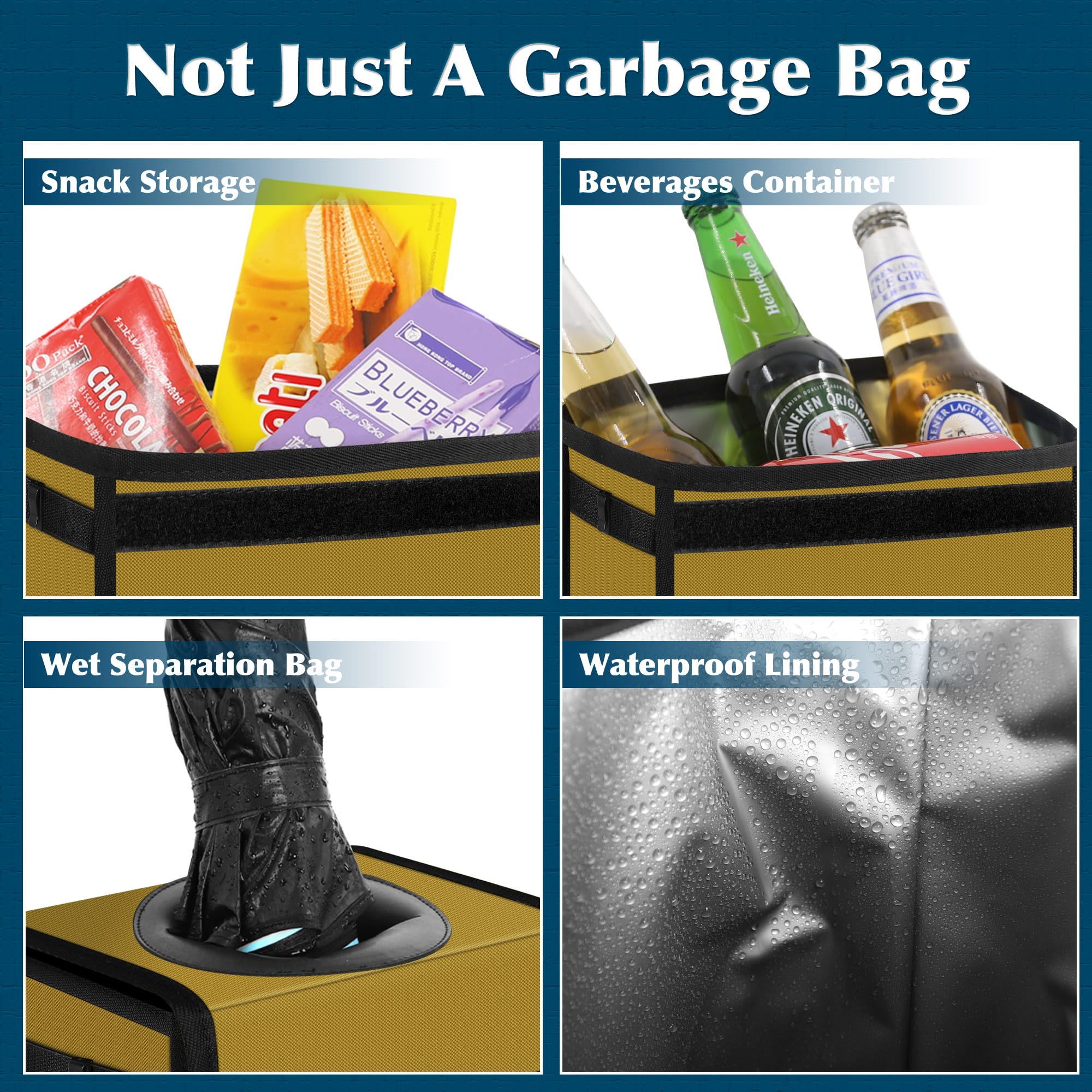 【MULTIPURPOSE 】PEVA lining also has the effect of thermal insulation. This car accessories not only hold garbage, but also a thermal insulation bag. You can put hot food, cold objects, fruits, drinks, snacks in it, and it can keep hot for several hours. The temperature of food and the coolness of drinks can also be used as a storage bag for other small items such as paper towels, toys, bags, snacks, umbrellas and other things you want to pack.