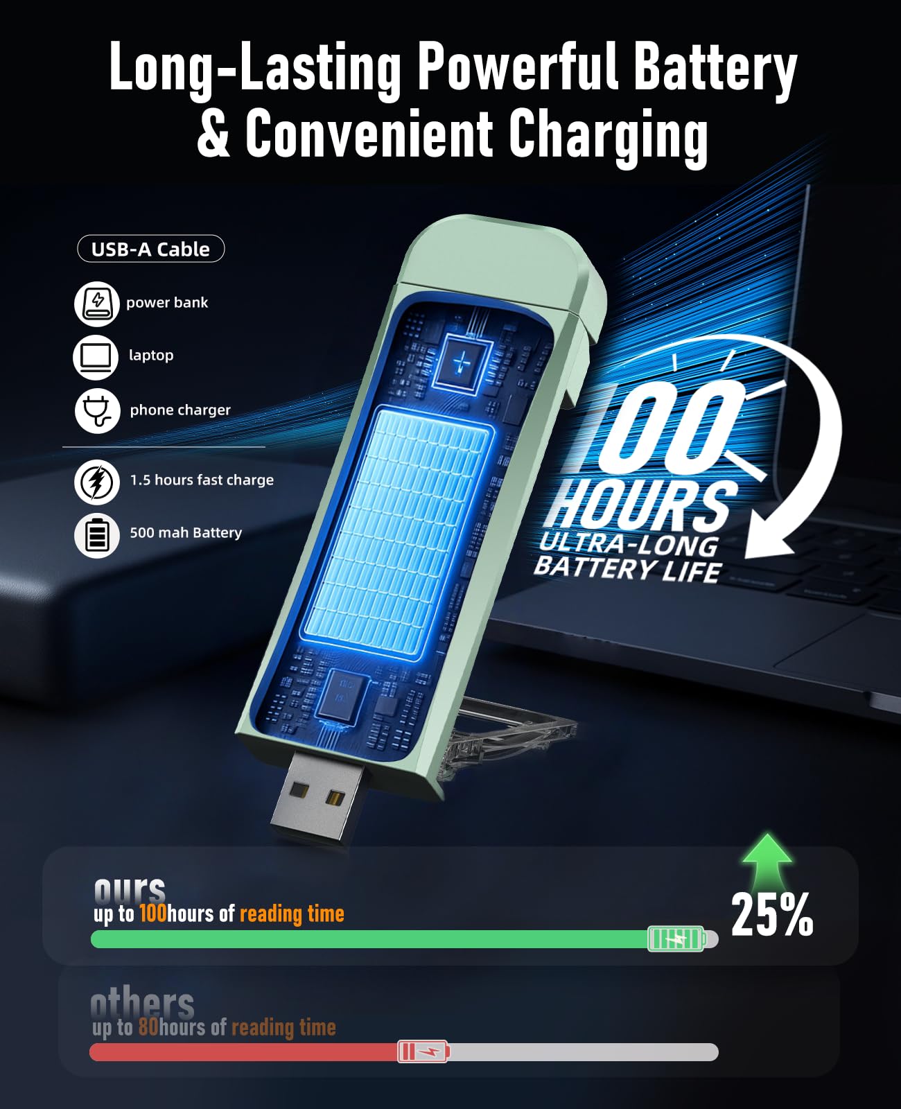 [USB Rechargeable &Long Lasting]:The built-in USB charging port design makes charging very convenient,simply plug it into a power bank,laptop,phone adapter,car charger,etc. This reading lights for books in bed has a 500mAh battery,providing 8-100 hours of reading time (depending on your settings).