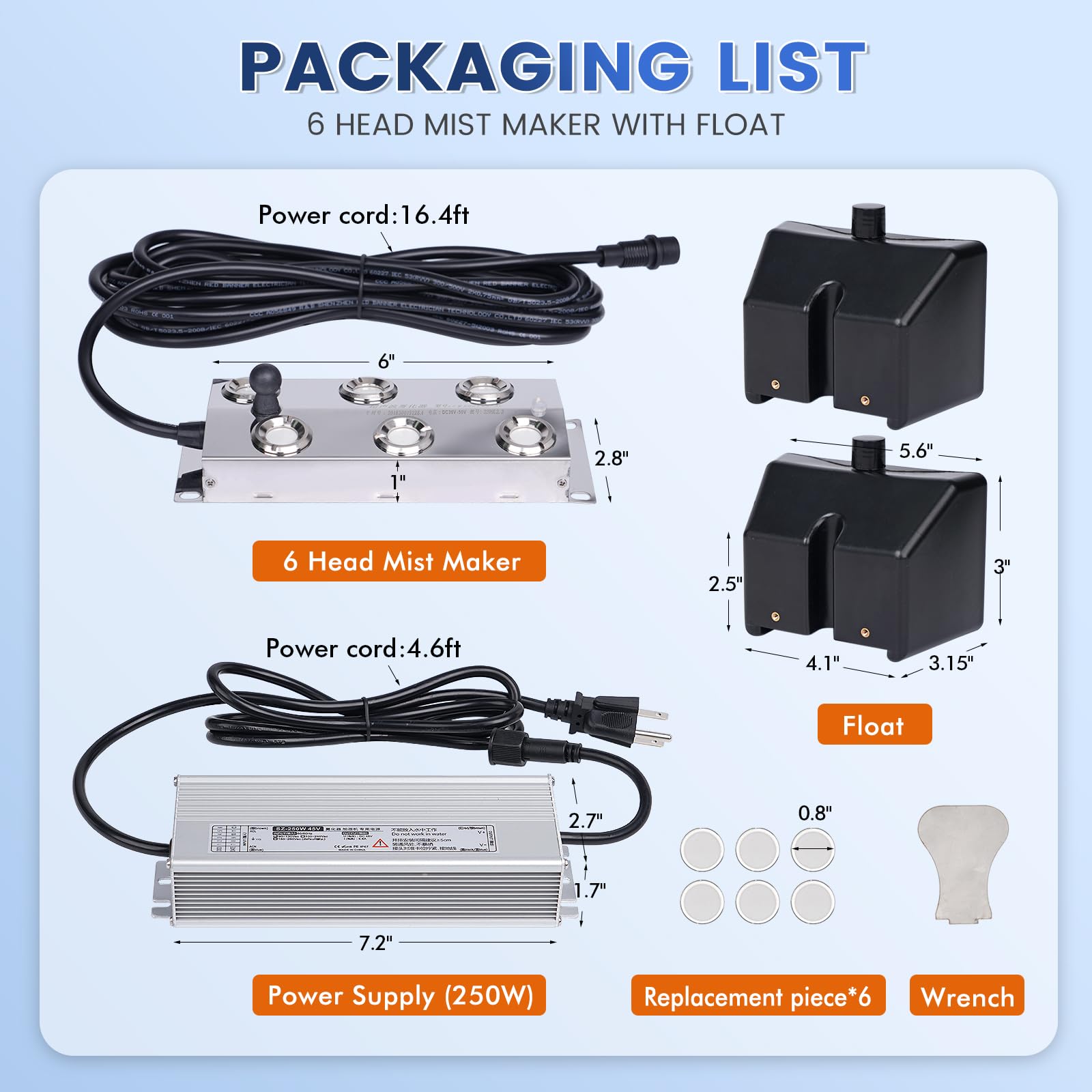 MIST MAKER PARAMETER: 10 mist heads;material: 304 stainless steel; voltage: greater than or equal to dc48v; current: 6. 5a; frequency: 1. 7mhz; power: 312w; mist output: 8. 5kg/h(18. 7lb/h); working water temperature: 33.8℉-131℉