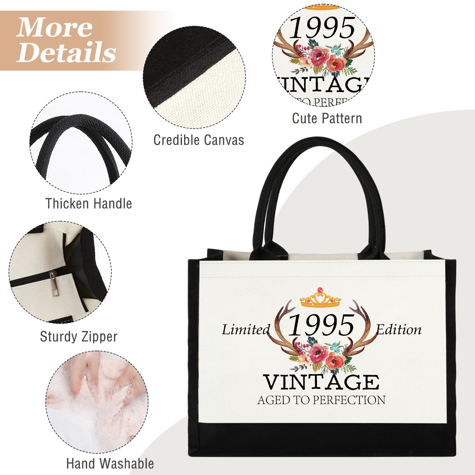Large Capacity 1995 Tote Bag: This canvas tote bag for 30th women is 12.8" L x 5.3" W x 11"H, which is designed to be the ideal size for carrying items without appearing too large or small, roomy enough to hold your daily accessories like iPad, books, phones, cosmetics, clothes, water bottles, etc. Made of high-quality cotton canvas material, Our beach bag can withstand daily wear and tear, all seams are closed with tight thread, ensuring their durability