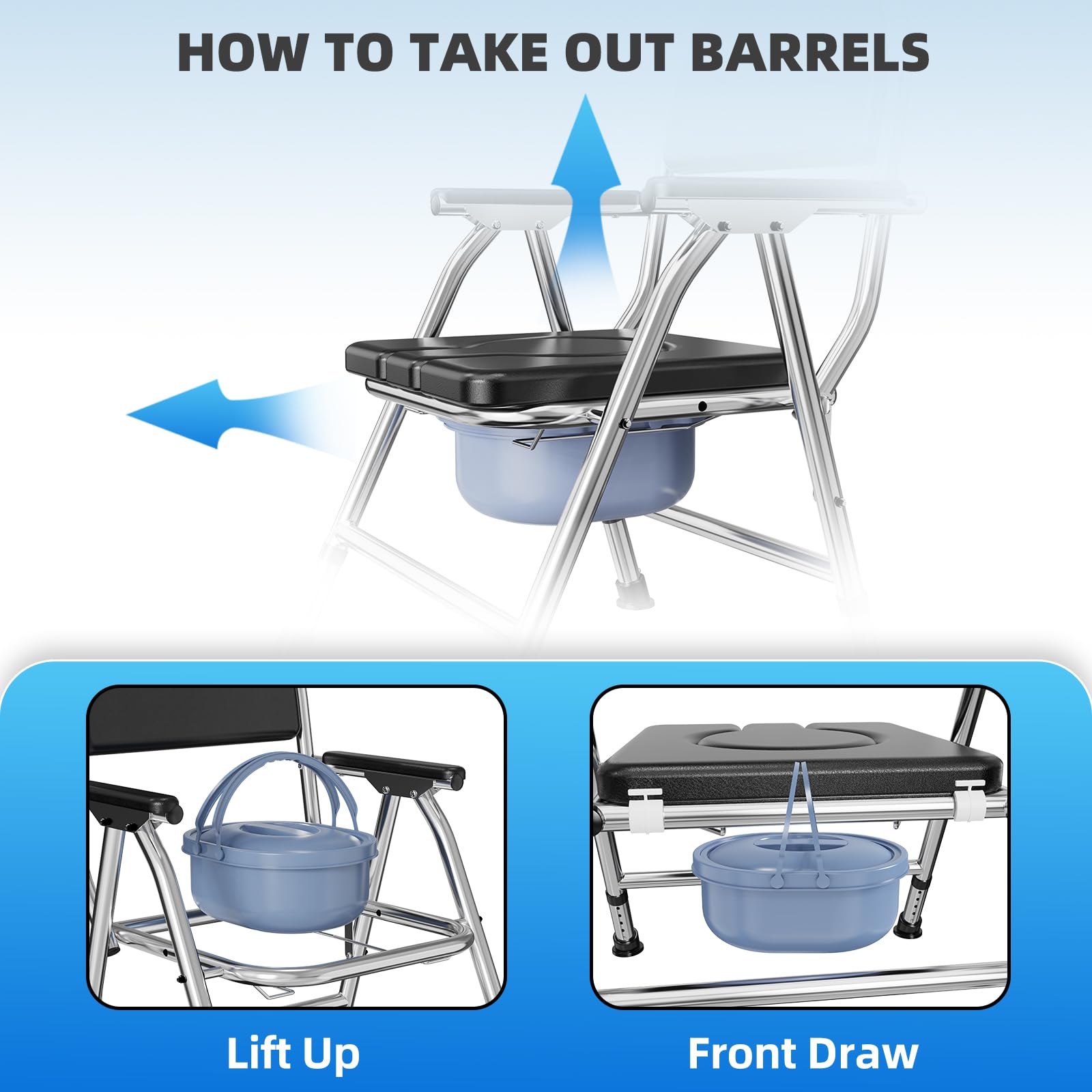 FOLDABLE & SPACE-SAVING DESIGN: Our bedside commode chair features an innovative folding mechanism, allowing it to be easily collapsed and stored when not in use. Push the buckle downward, then secure it into the groove to keep the chair in the open position. Pull the buckle upward to fold the chair. Its compact design is perfect for small bathrooms or limited spaces, making it ideal for individuals with space constraints. The detachable commode bucket can be conveniently pulled out from the front for hassle-free cleaning.