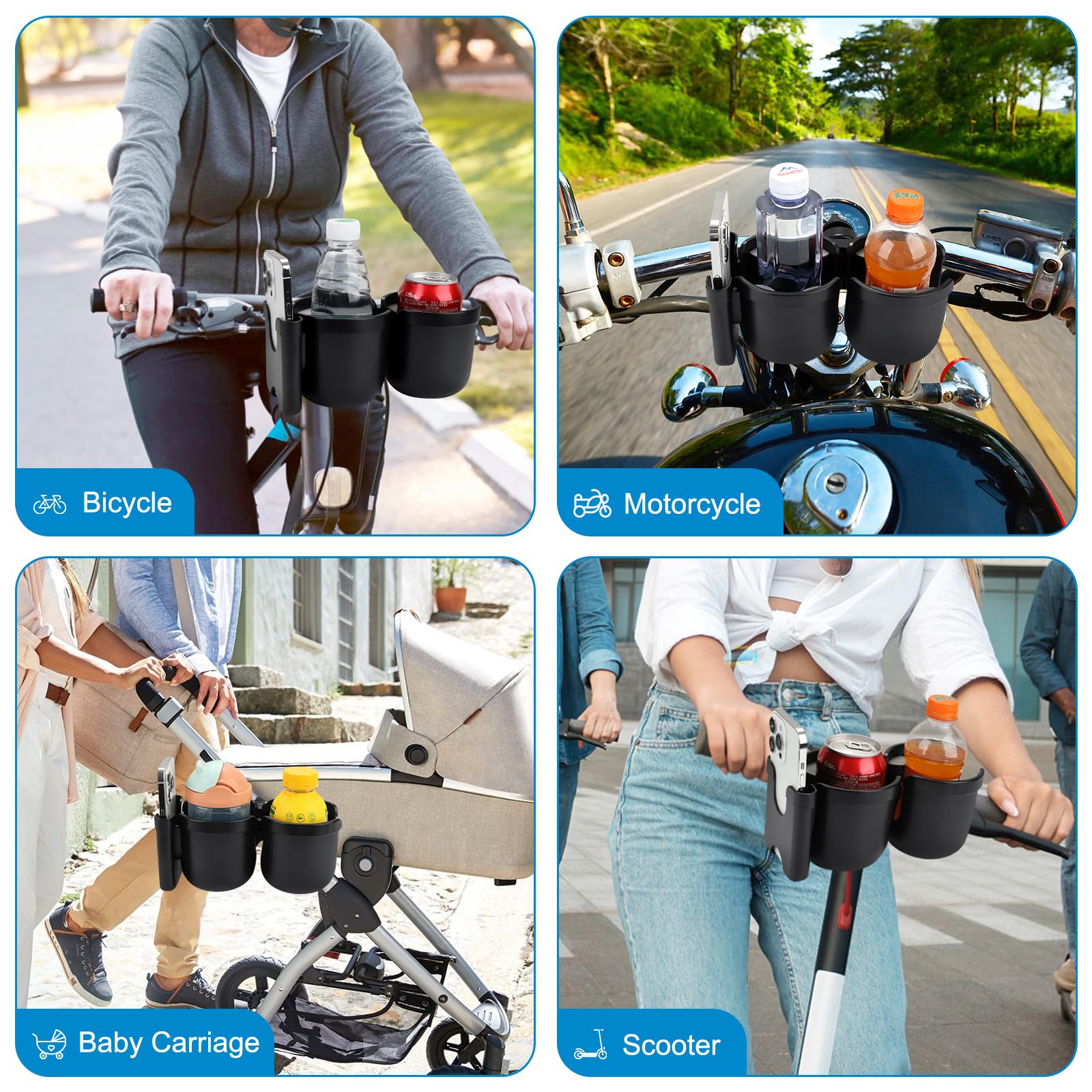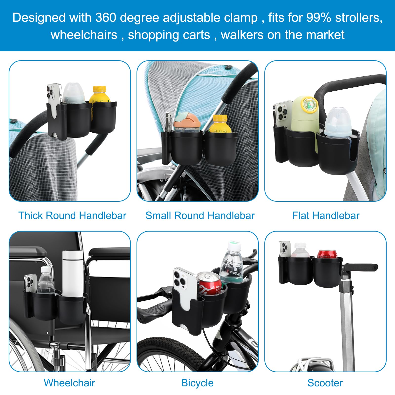 This wheelchair cup holder with phone holder fits for most walkers, wheelchair, scooter, rollator, bicycle, boat handle bar, shopping cart, kayak, ATV, lawnmowers, motorcycle, treadmill etc.