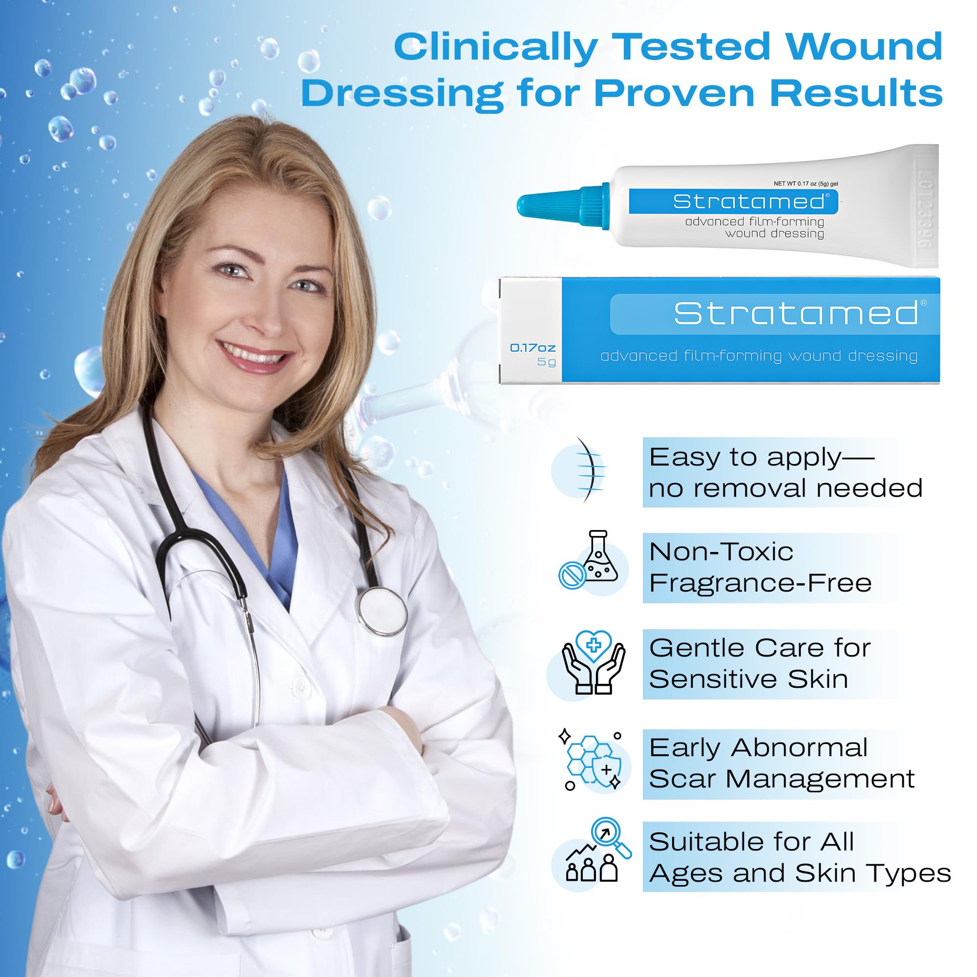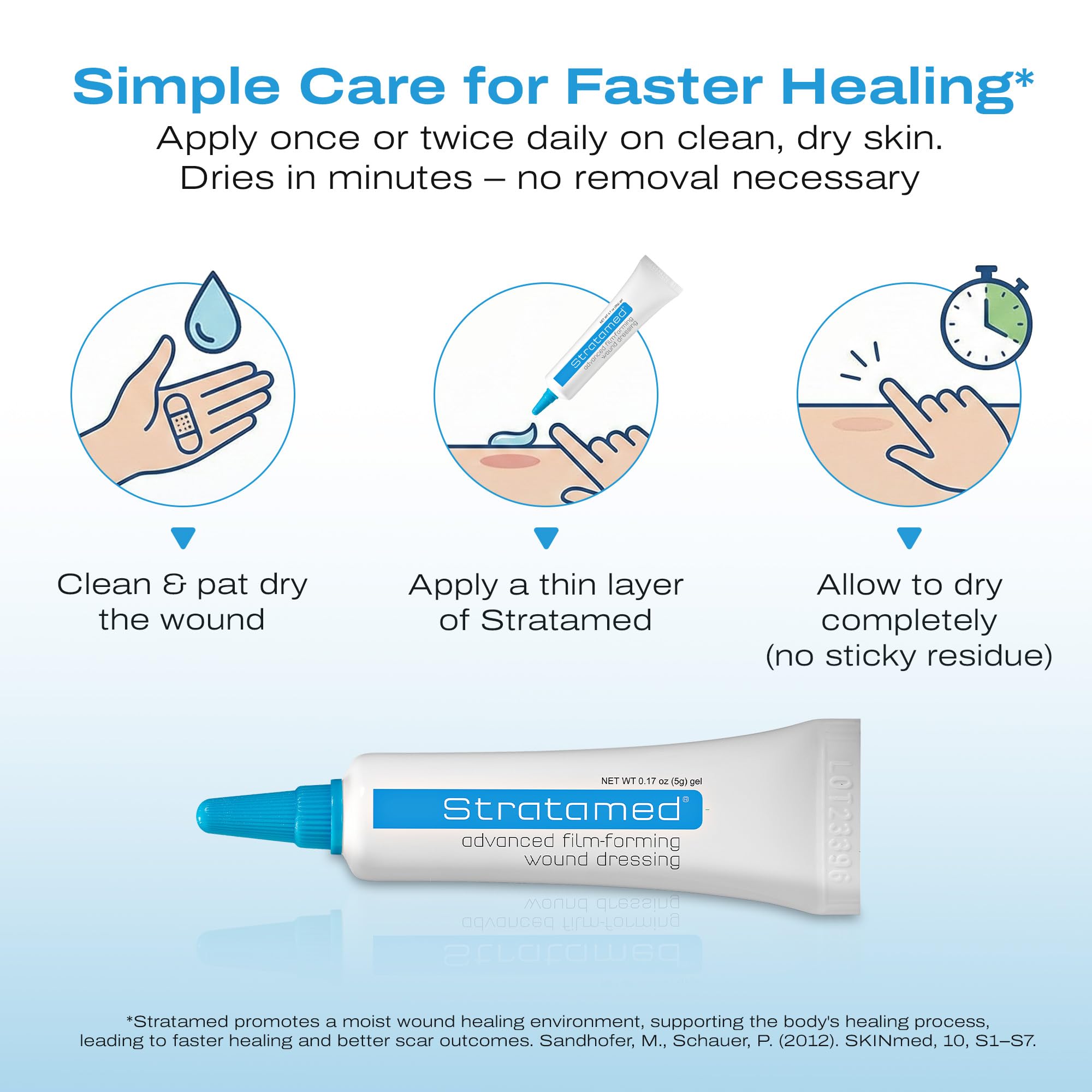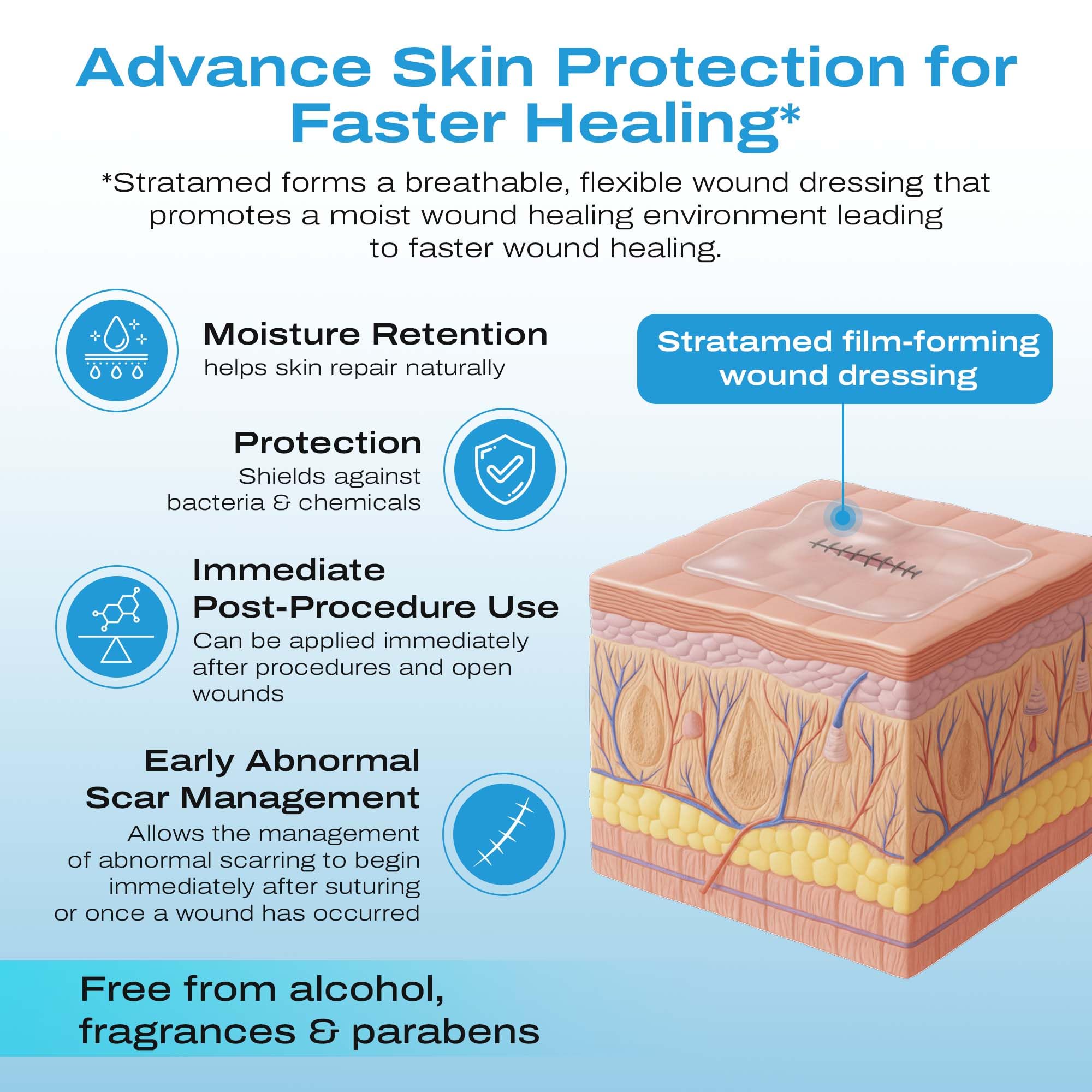 ADVANCED FILM-FORMING WOUND DRESSING | Stratamed Self-Drying Gel Formulation is a Breakthrough in Wound Healing & Abnormal Scar Management | Apply a Thin Layer to Compromised Skin to Protect from Microbial & Chemical Invasion; Maintain a Moist Wound Healing Environment for Faster Healing; & Promote Symptomatic Relief from Itching, Burning & Discomfort