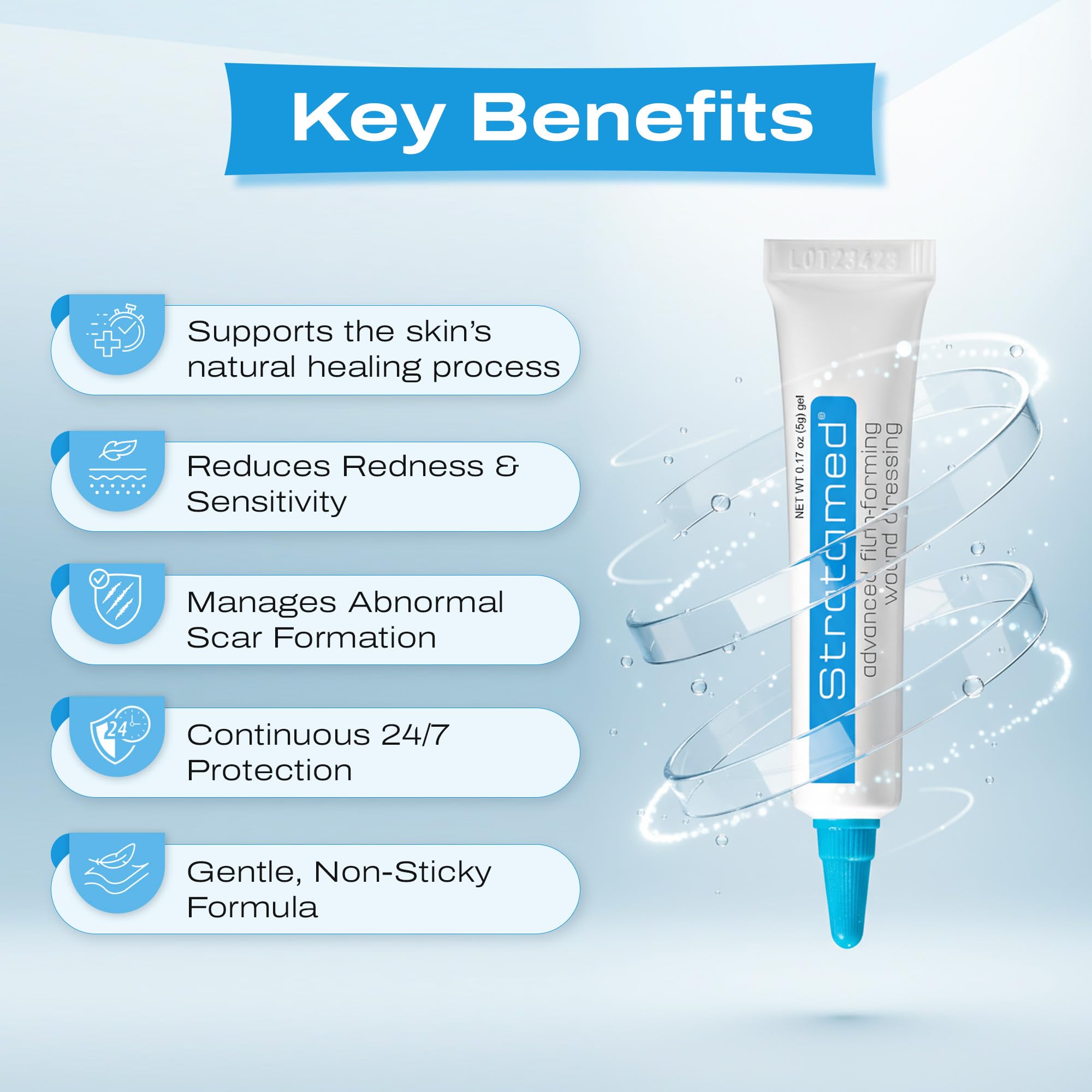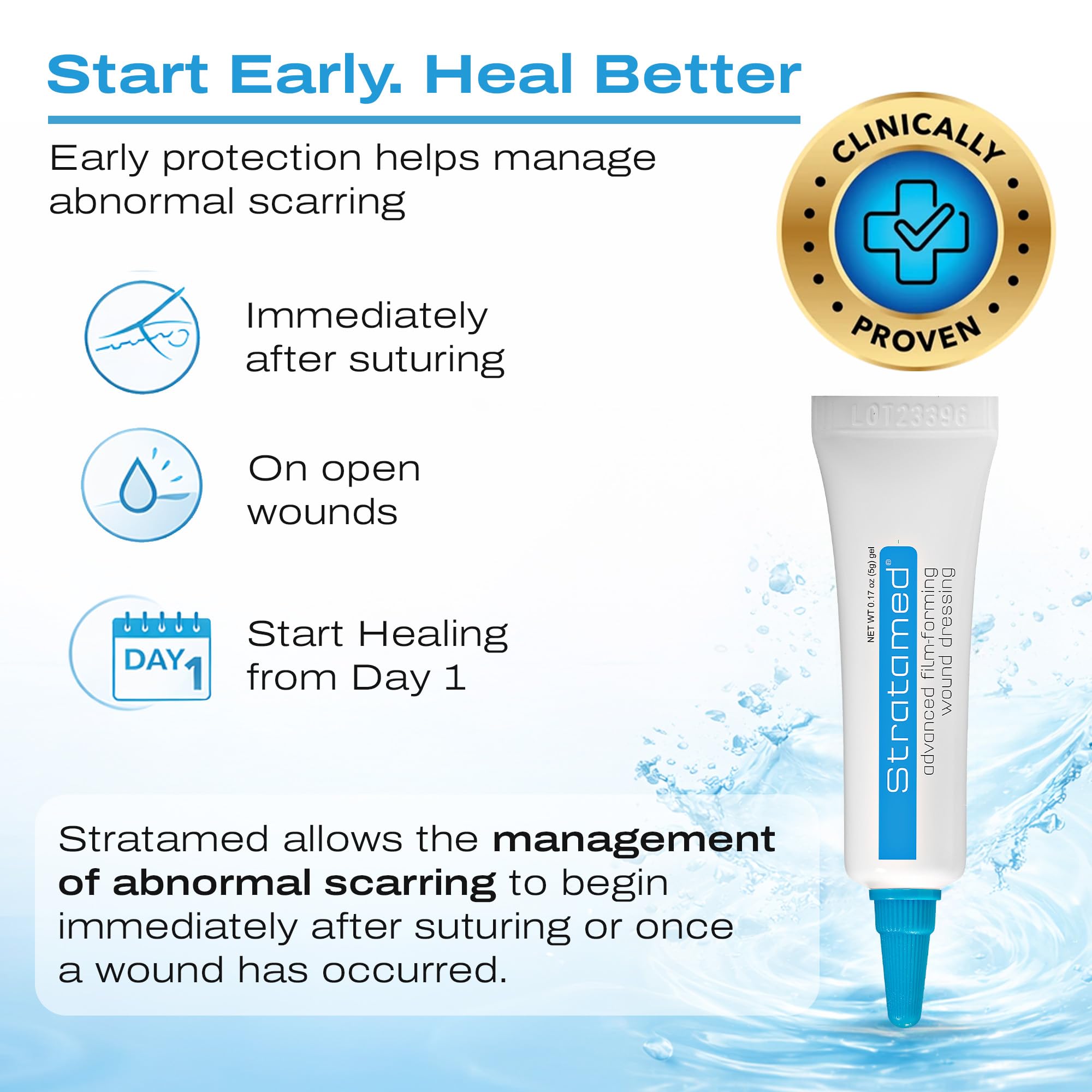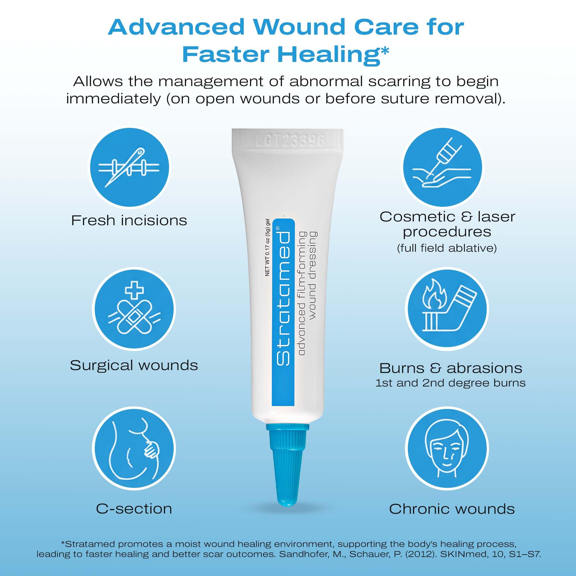 ADVANCED FILM-FORMING WOUND DRESSING | Stratamed Self-Drying Gel Formulation is a Breakthrough in Wound Healing & Abnormal Scar Management | Apply a Thin Layer to Compromised Skin to Protect from Microbial & Chemical Invasion; Maintain a Moist Wound Healing Environment for Faster Healing; & Promote Symptomatic Relief from Itching, Burning & Discomfort