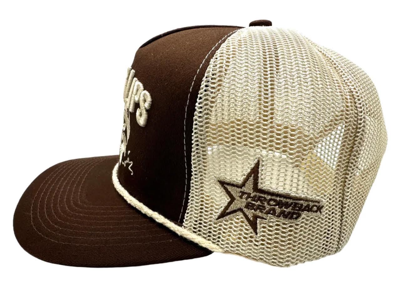 Description This stylish trucker hat is the perfect accessory for any casual outfit. Crafted with a classic mesh design, it features a curved brim and a snapback closure for an adjustable fit. The standout element is the bold 'Rippin' Lips' embroidered design on the front panel, showcasing a catch any fisherman would be proud of. Made from durable polycotton blend, this hat is both comfortable and long-lasting. Whether you're hitting the lake or lounging around, this cap will keep you looking effortlessly cool. With its versatile brown and tan color scheme, it complements a wide range of styles. Grab this eye-catching trucker hat and make a statement wherever you go.