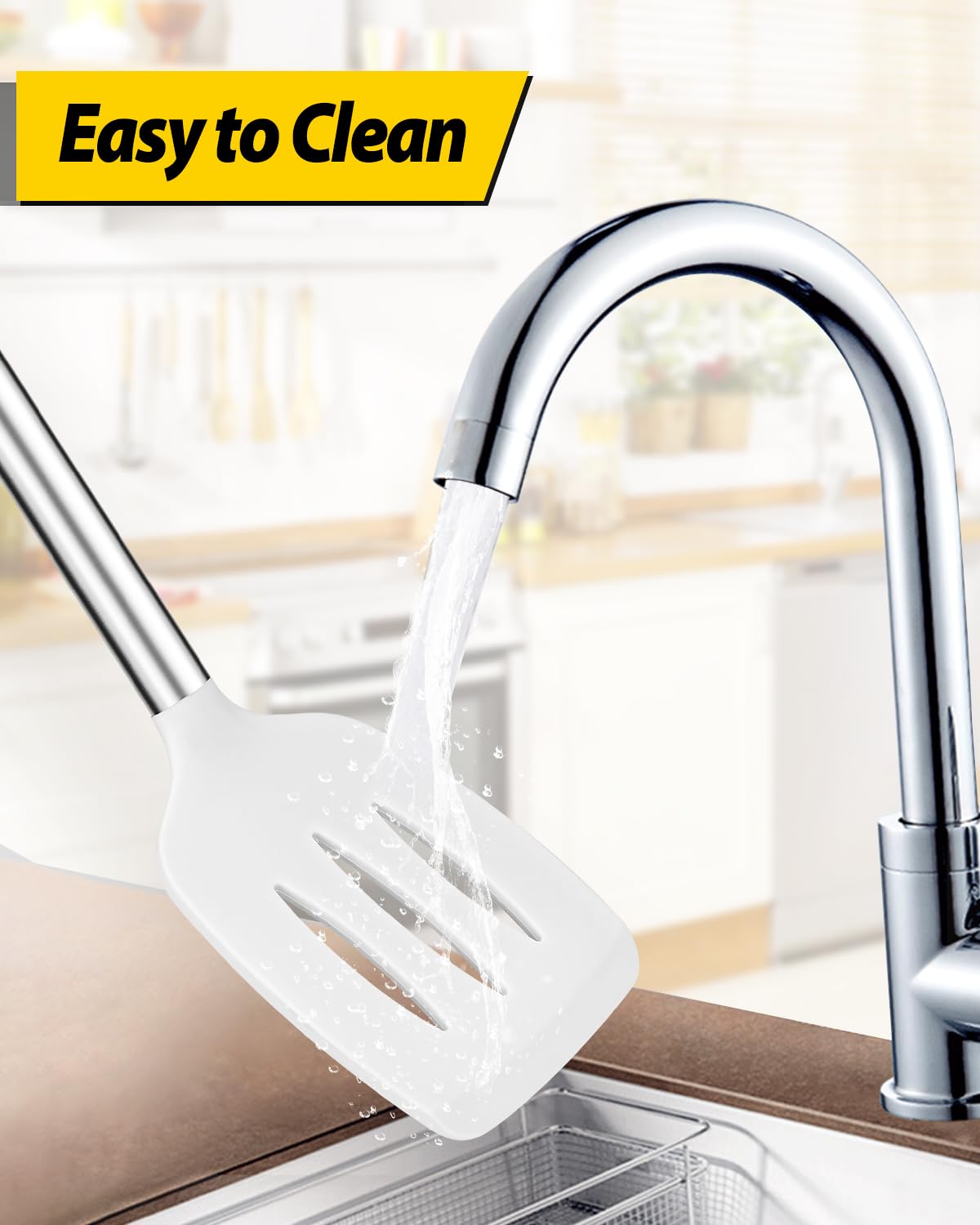 Widely Used : Thin and flexible edge of the silicone turner is ideal for flipping,frying and turning food; Large capacity design of cooking spoon, used to hold food more convenient; Slotted Spoon can quickly drain the water