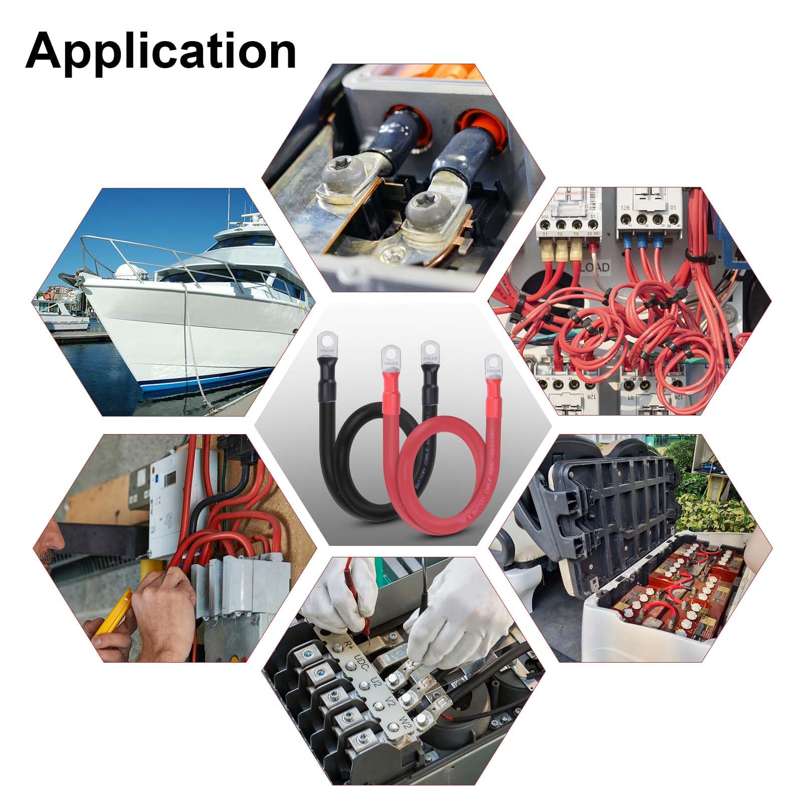 【Easy to Use】: Each cable have 2 pcs 3/8" (M10) round center hole terminals (already crimped) on both ends and 3:1 Dual Wall Adhesive Heat Shrink Tubing Tube, thick and sturdy than 2:1 shrink tube, fit for 3/8" (M10) stud
