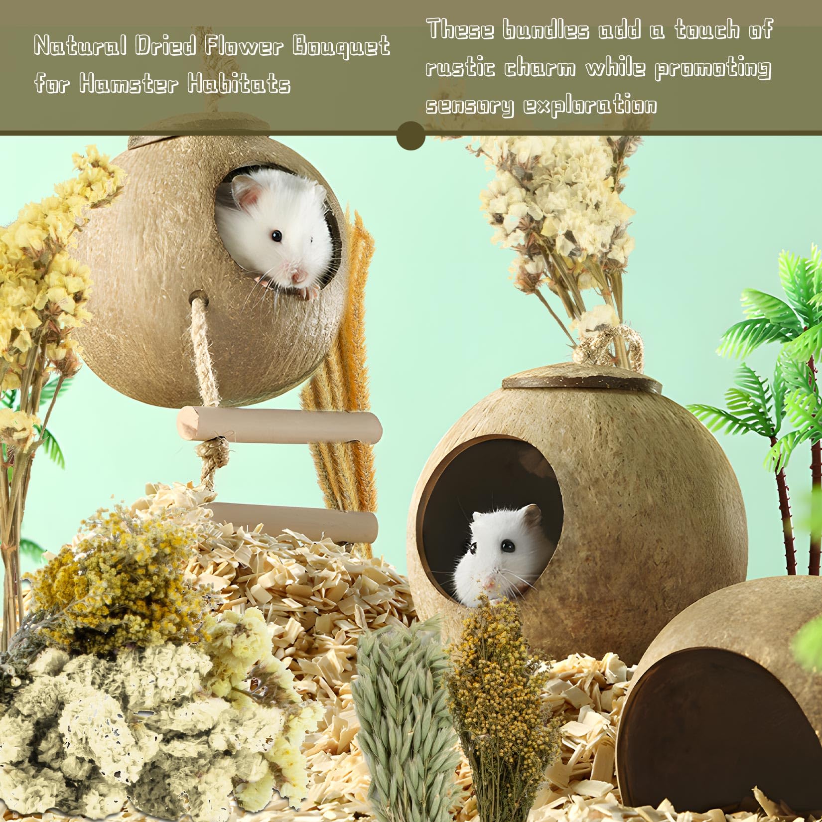 Natural and Pure Ingredients: Contains yellow and white forget-me-nots, yellow warbler flowers, oats, flax, and small yellow grass; naturally air-dried and free from additives; suitable for small pets like hamsters and rabbits; can be used as a perch or occasional snack Immersive Natural Experience: The colorful combination of flowers, plants, and grains mimics the wild grassland environment; Satisfies small pets’ instincts to explore, dig, and burrow; Creates a comfortable and natural habitat for them Physical and Mental Enrichment: Branches, oats, and flax offer pets opportunities to climb, chew, and grasp; Promotes movement and coordination; Keeps pets’ minds active while helping with teeth grinding Comfortable and Private Resting Space: Arrange around the food bowl or nest to create a quiet, semi-enclosed area; Reduces external distractions and provides a sense of security for pets; Helps them rest and eat peacefully