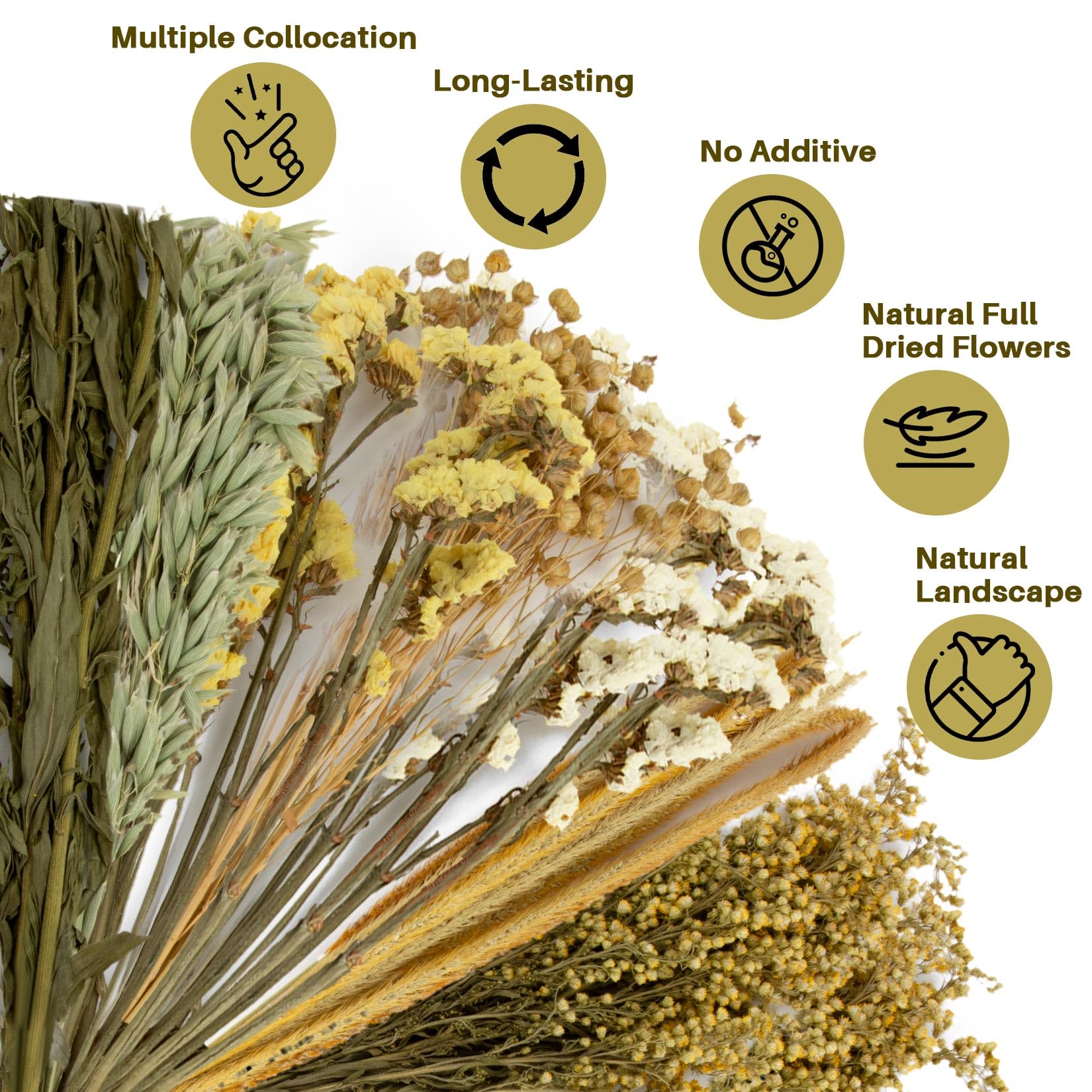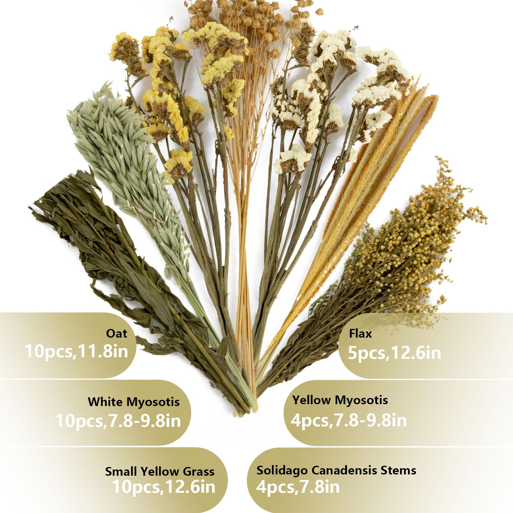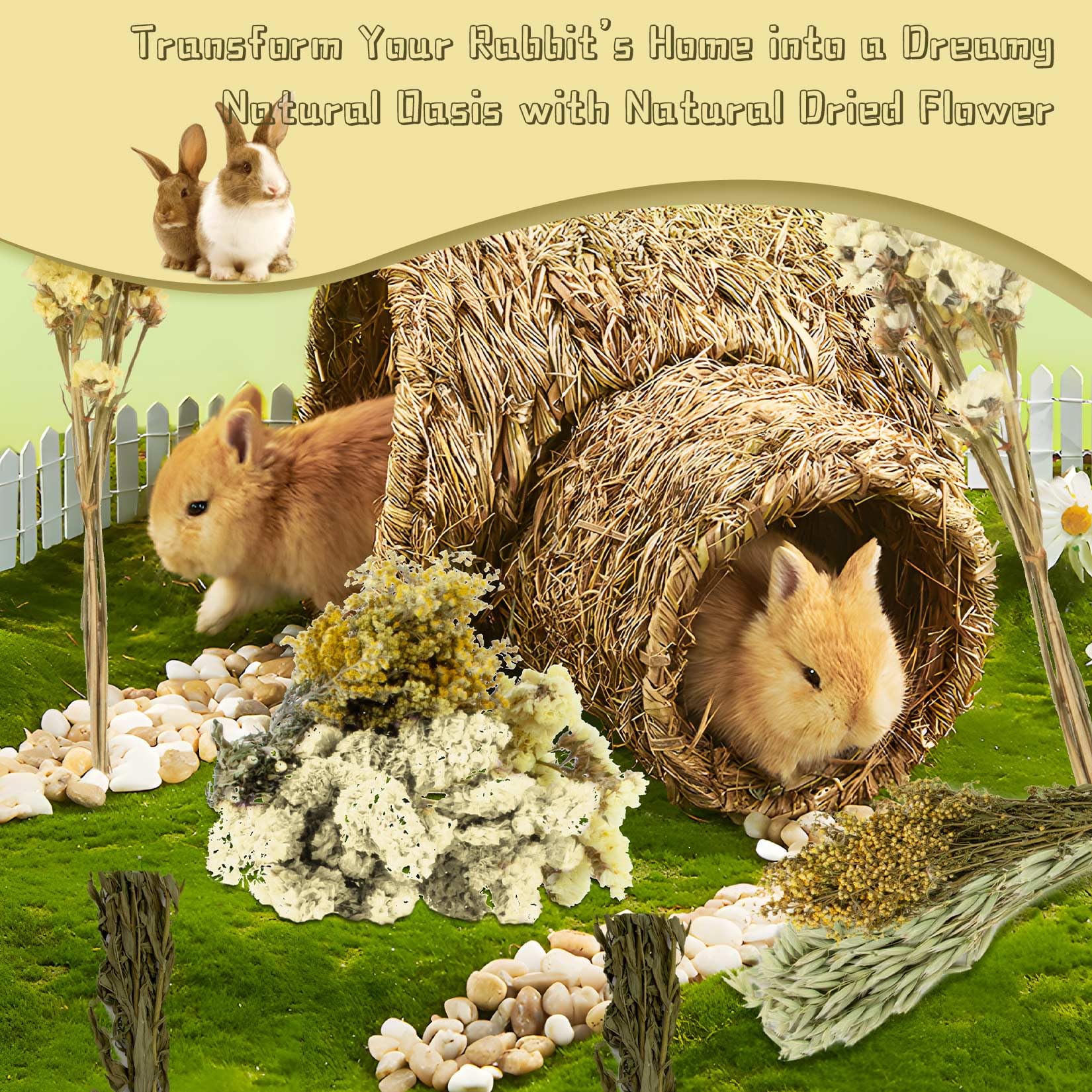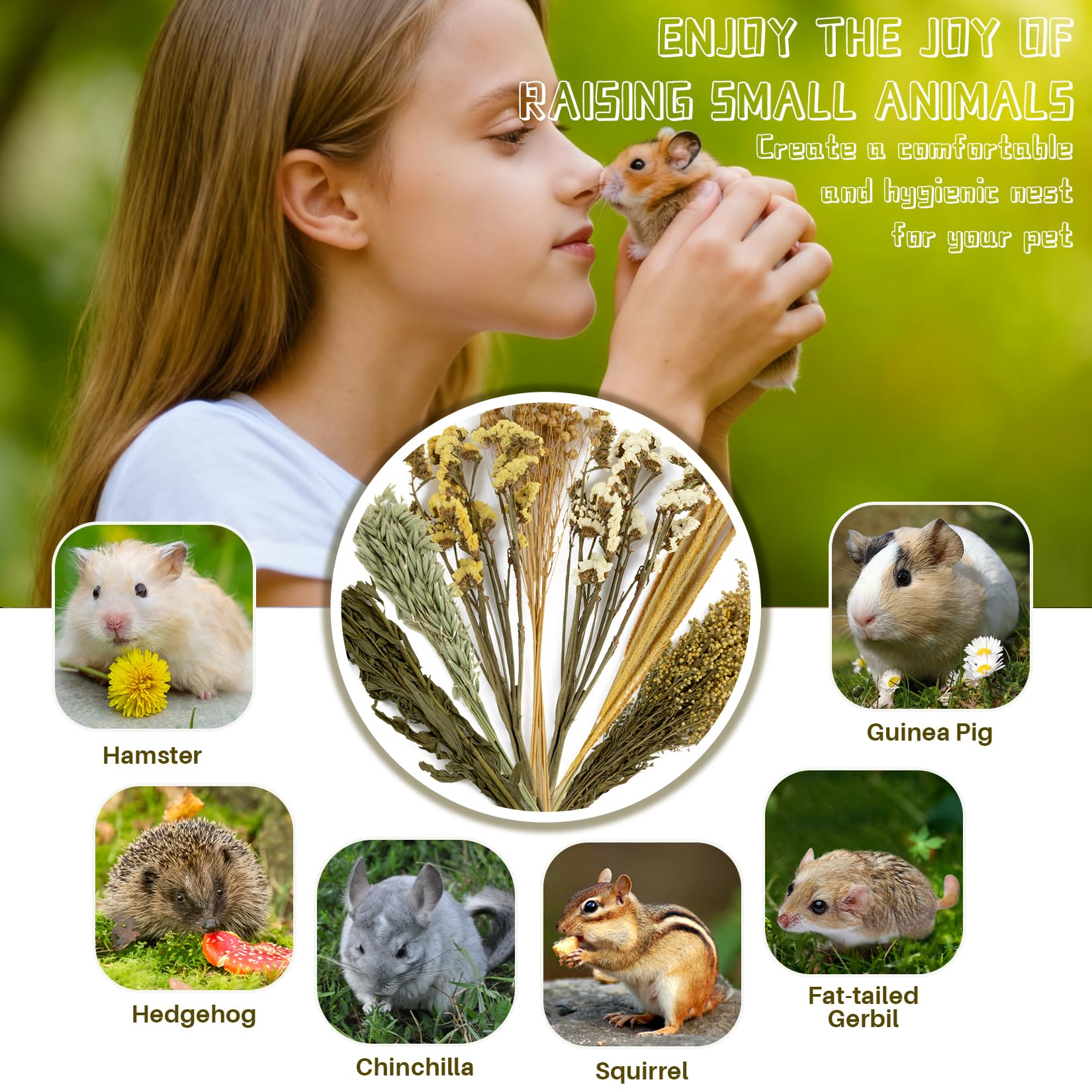 Natural and Pure Raw Materials: Includes yellow and white forget-me-nots, yellow warbler flowers, oats, flax, and small yellow grass; Naturally air-dried; Gentle and suitable for small pets like hamsters and rabbits; Ideal for habitat bedding or occasional snacks