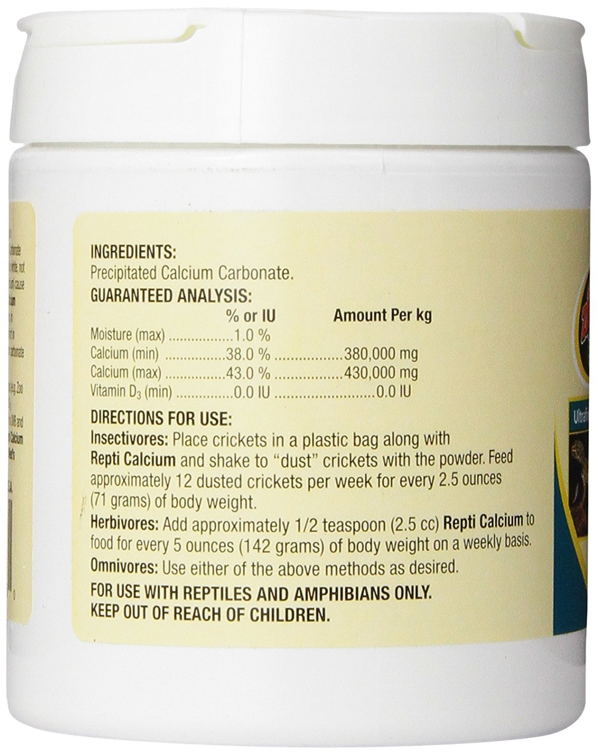 Zoo Med Reptile Calcium without Vitamin D3, 8-Ounce. Reptile Calcium is an ultra fine Precipitated Calcium Carbonate Supplement. It is a phosphorus-free calcium supplement for reptiles and amphibians. It has a unique shape/high surface area per gram resulting in increased calcium bioavailability.