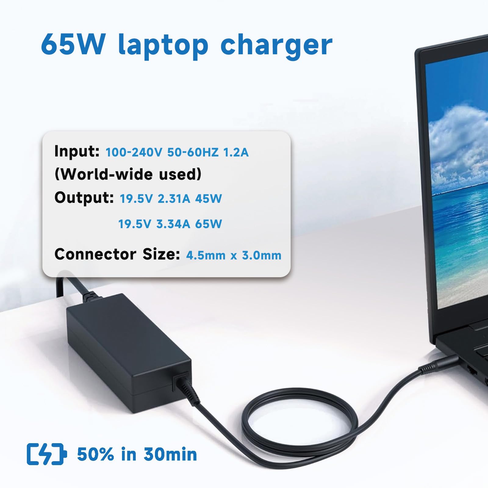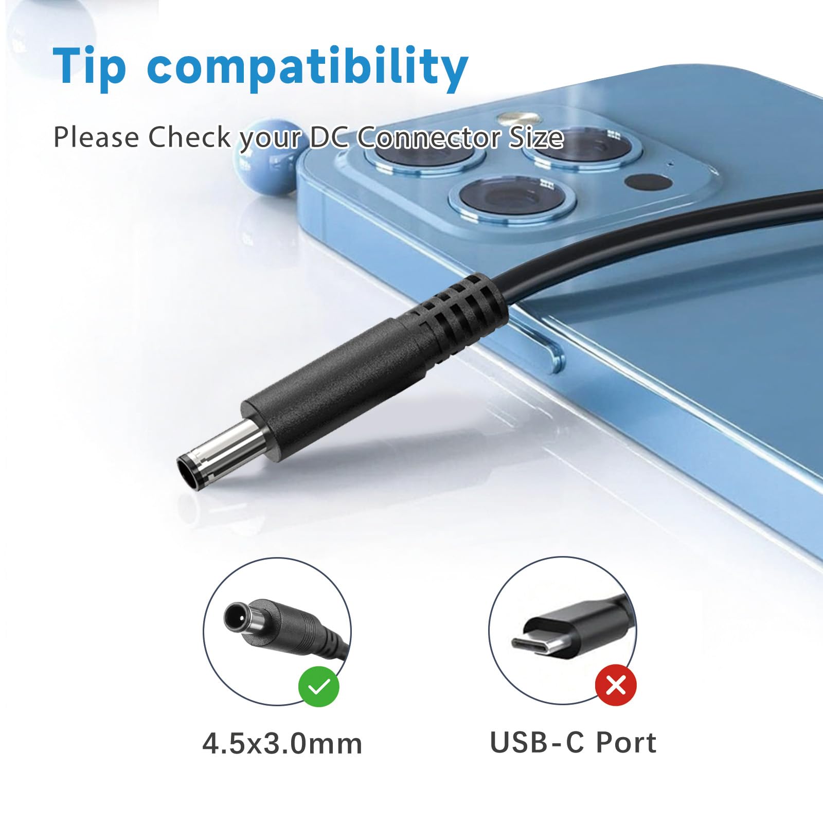 [Exact 4.5mm Black Tip] Output: 19.5V 3.34A 65W (Backward compatible with 45W 19.5V 2.31A). Connector Size: 4.5mm * 3.0mm Small Black Tip (with internal center pin). Note: This is NOT the 7.4mm large connector and NOT a USB-C charger.