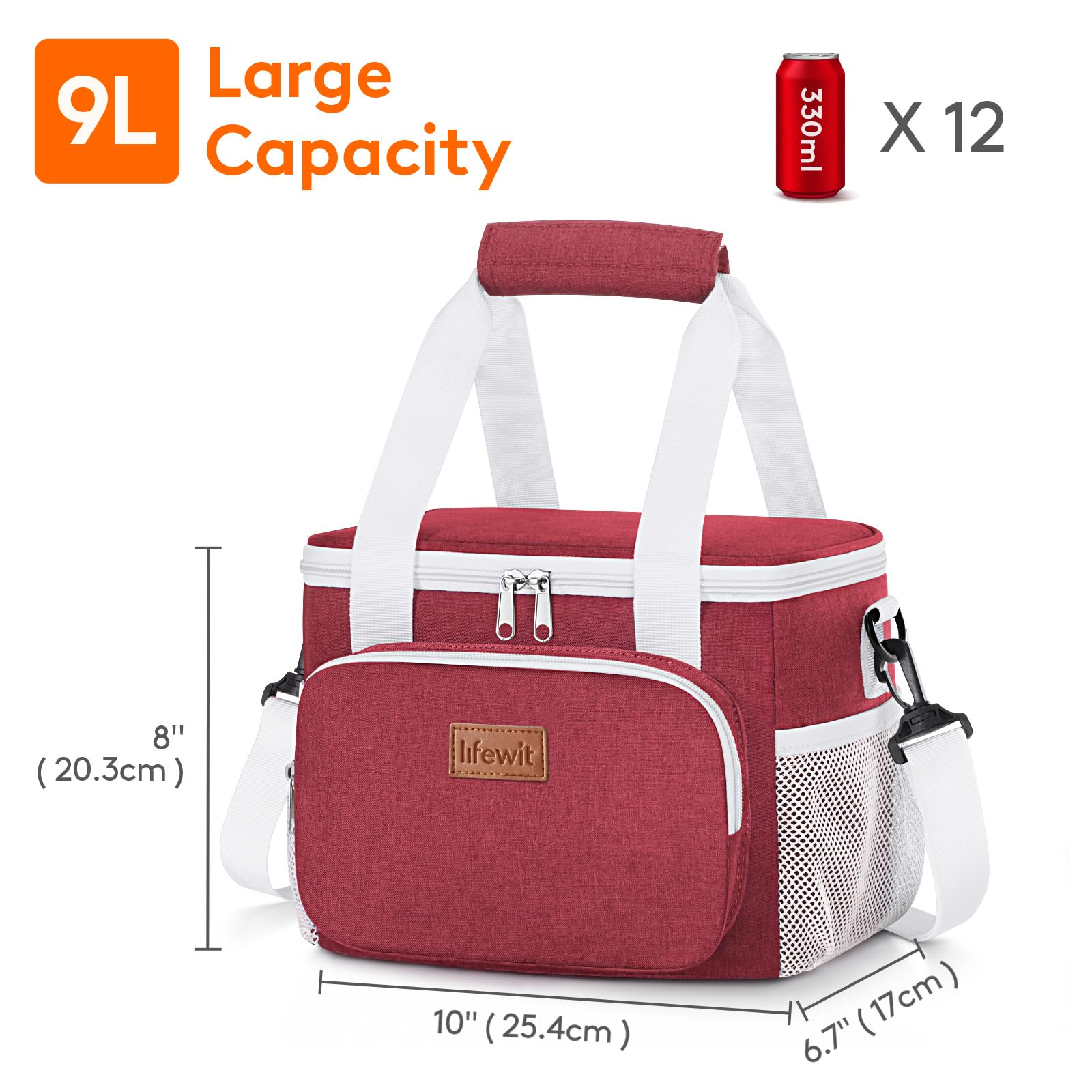 Large Capacity: Dimensions - 10" ( 25.4cm ) × 6.7" ( 17cm ) × 8" ( 20.3cm ). The maximum capacity of lunchbox for adults is 9L, and is spacious enough to store 12 cans of coke (330ml), or your lunch such as sandwiches, salad, snacks, drinks and fruits and so on. It is suitable for office, for work, picnic, beach, trip.