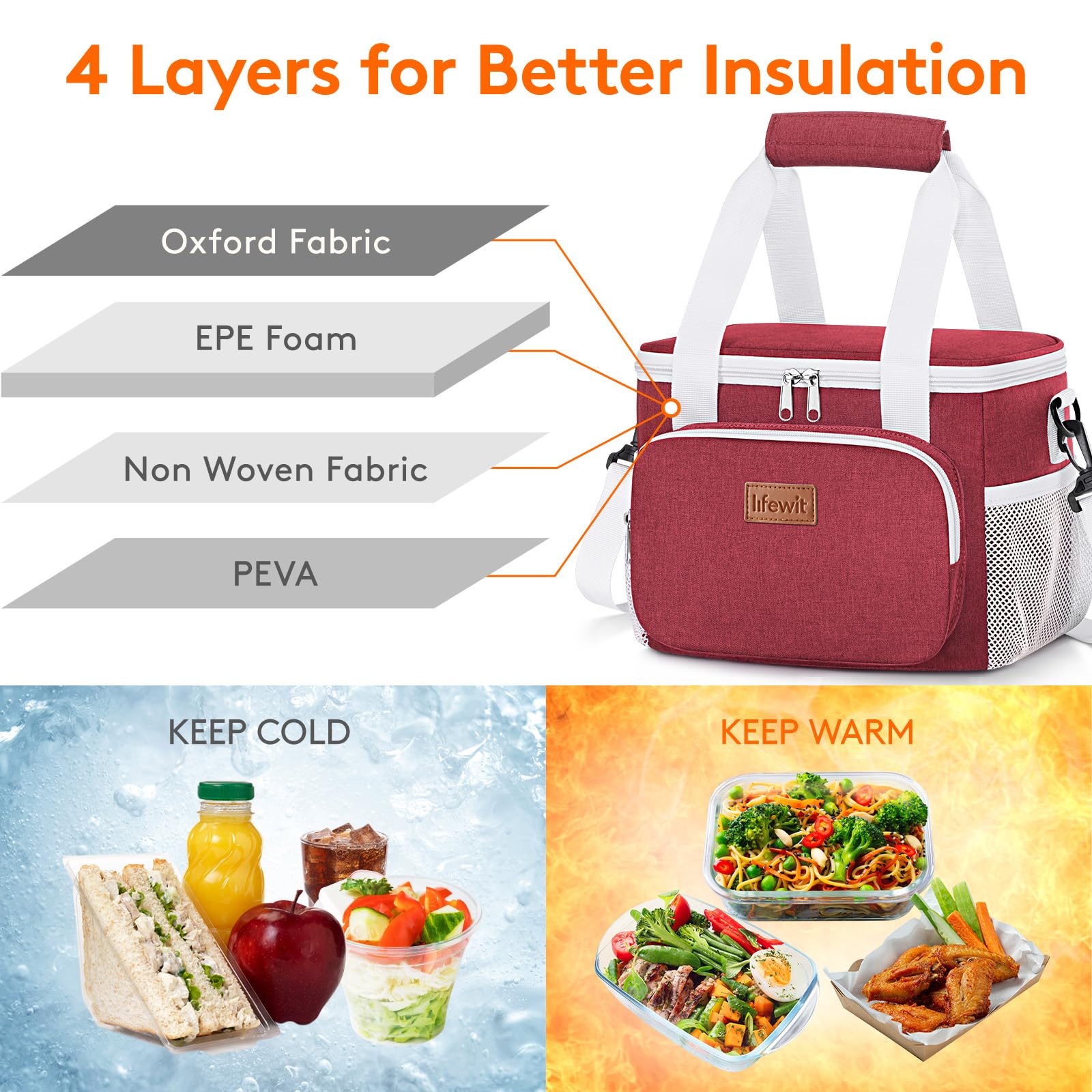 Thermal Insulated: The lunch bag is made of insulated material which can keep food and drinks cool or warm for more than 4.5 hours. Besides, the interior lining is made of food grade PEVA foil so you can put your food into the bag directly without any worry. The built-in 2 mm EPE foam provides great protection to your containers, food and drinks