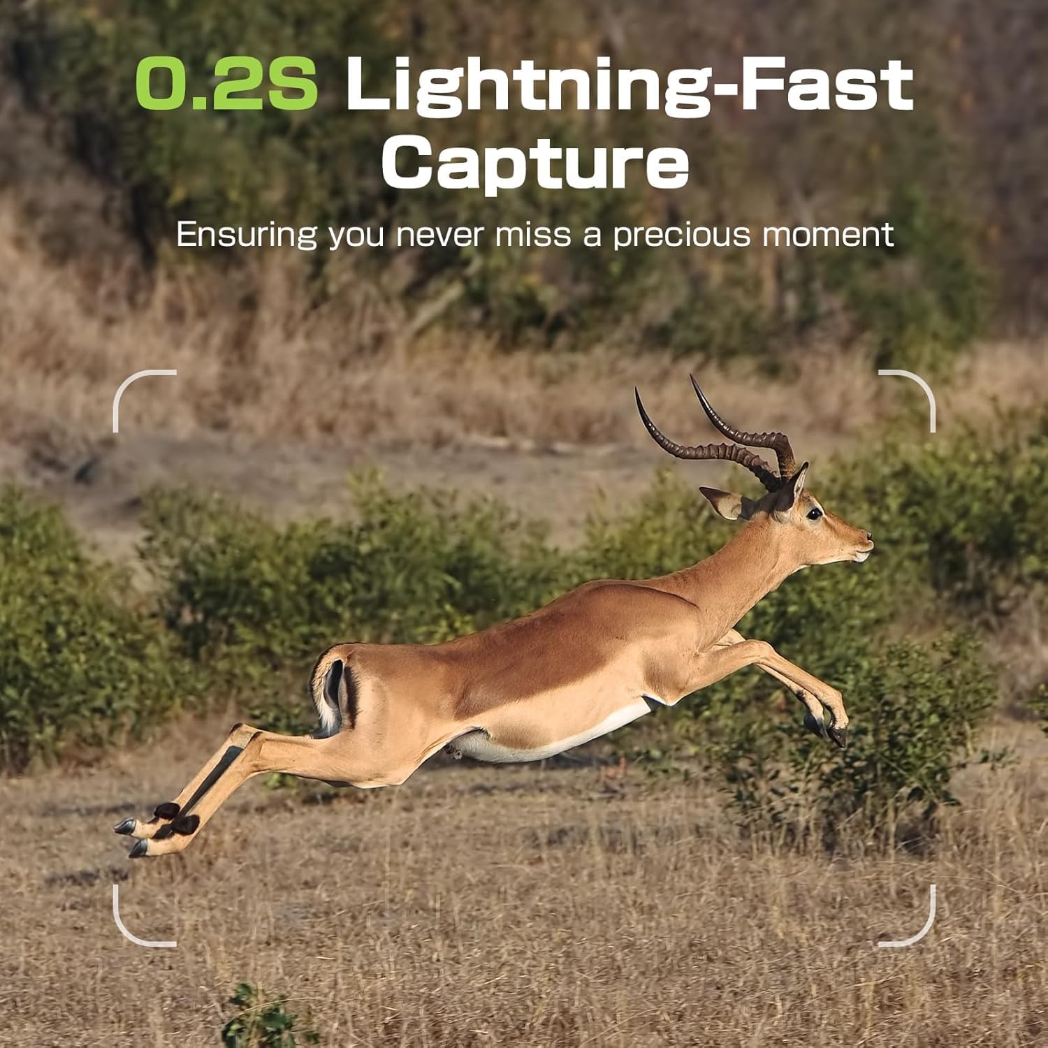 【0.2s Trigger Speed & No Glow Night Vision】Tkenpro game camera boasts the PIR sensor and wake up within 0.2s after capturing animals, ensuring precise tracking, fewer false alarms, extended coverage, real-time feedback in both photos and videos. Besides,game cameras with night vision activated waterproof captures every detail without disturbing animals at night, while delivering stunning real-time video to your smartphone.