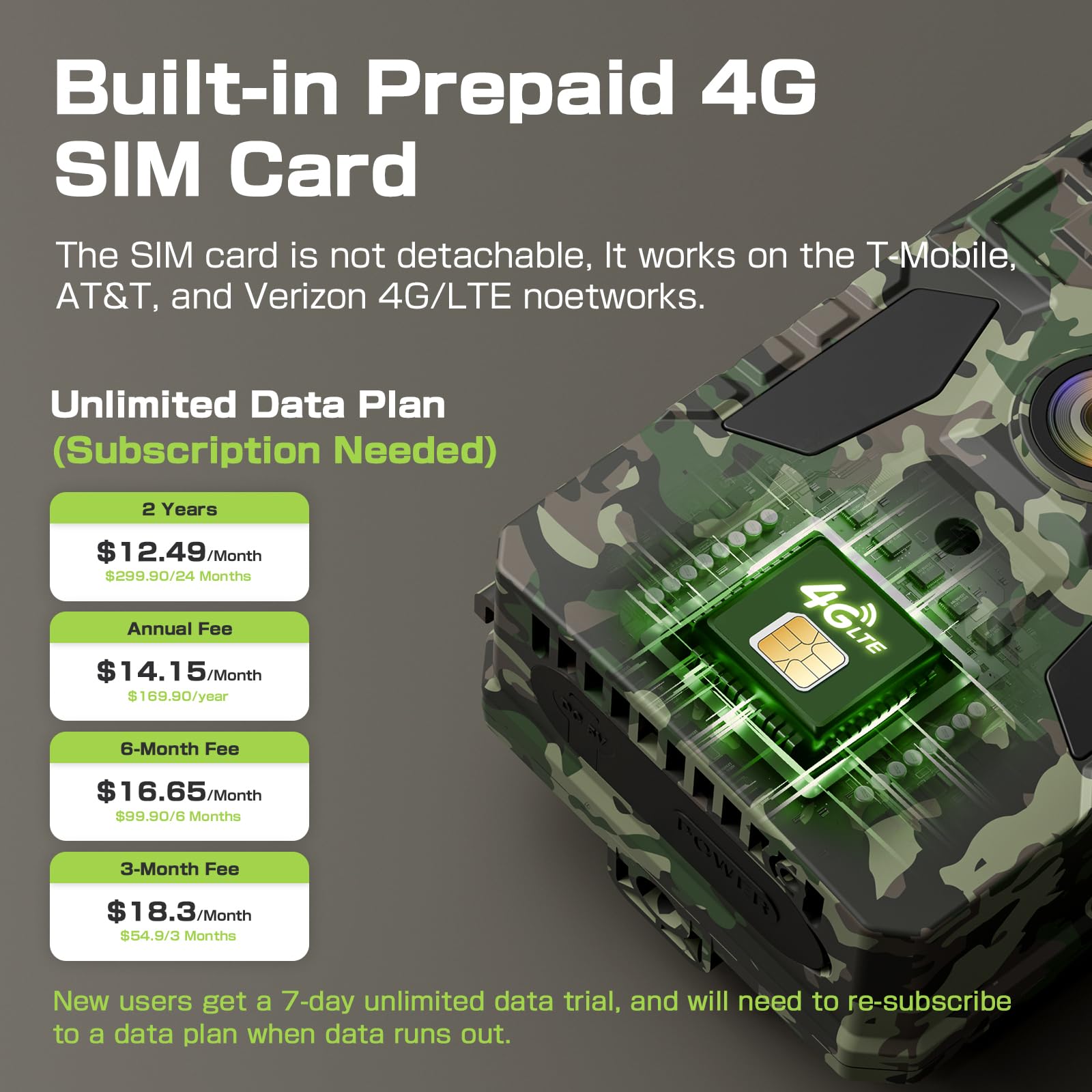 【Built in SIM Card & Unlitimed Data Plan】 The 4G Cellular Trail Camera built-in SIM card can effectively identify the strength of signals from various communication providers(Verizon、T-Mobile and AT&T), ensuring device compatibility and stability. New users get a 7-day unlimited data trial, and will need to re-subscribe to a data plan when data runs out. You can renew an unlimited cellular plan for $54.9/ 3 months to $169.9 per year on the app.Each camera requires a separate data plan subscription and cannot be shared. Note: ONLY the SIM card that comes with the camera can be applied (SIM card is not detachable), and Wi-Fi connection is not supported.