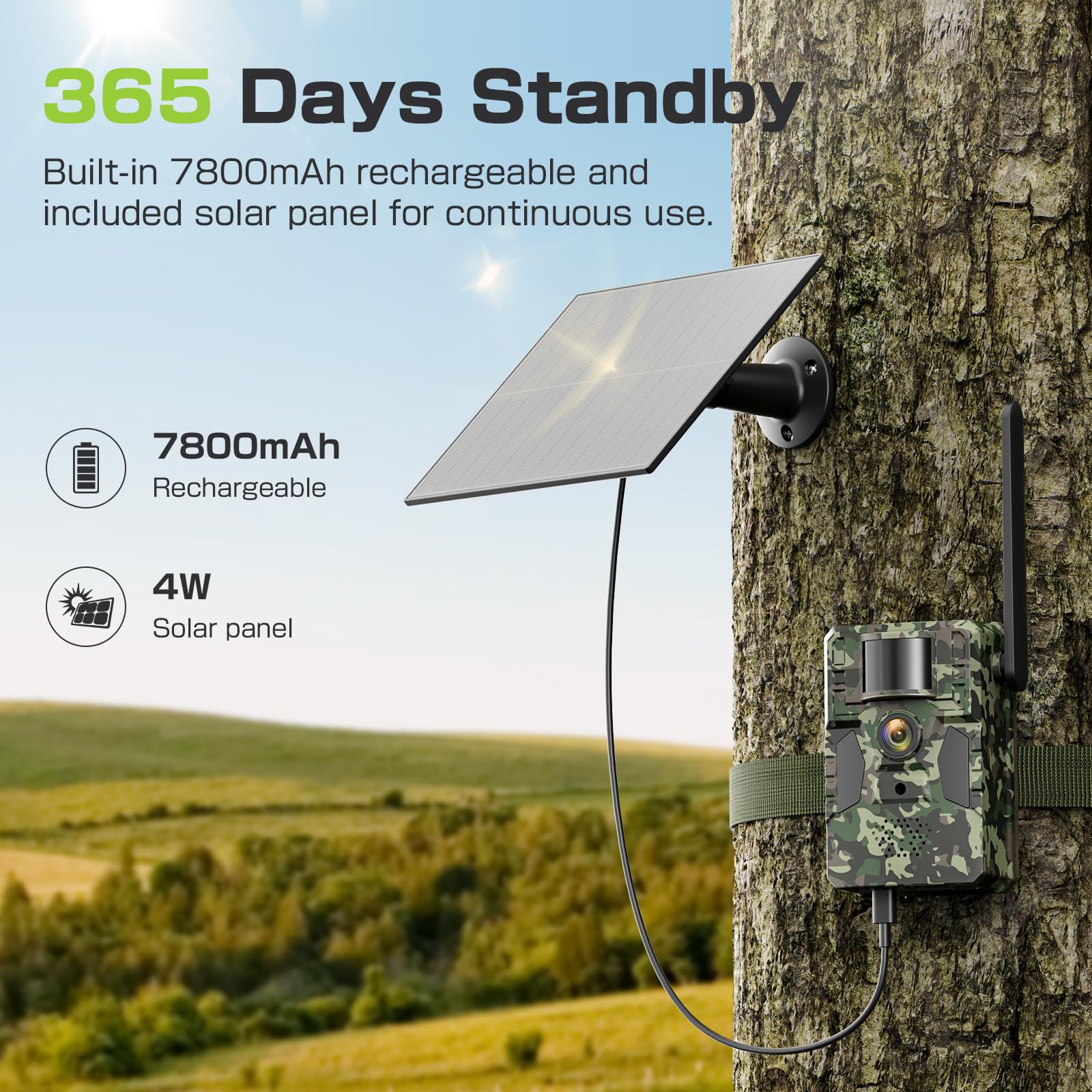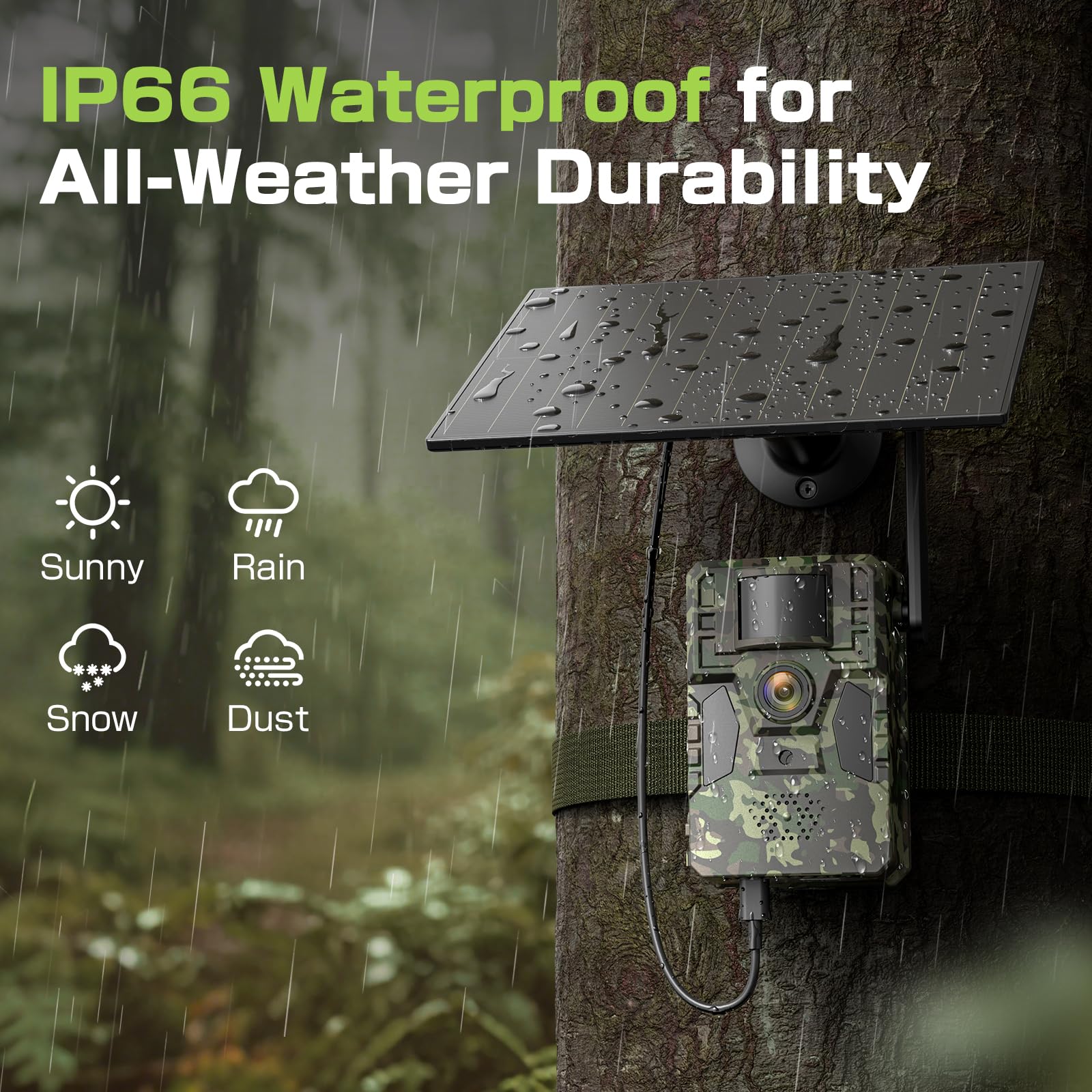 【Sustainable Power and IP66 Rugged Durability】The solar trail camera includes a 4W solar panel and a 7800mAh rechargeable, forming a dual power supply system offers a long-lasting power solution. IP66 Waterproof trail cameras built to withstand rain, dust, and extreme weather, the trail camera is reliable year-round, perfect for forests, farms, and outdoor surveillance.
