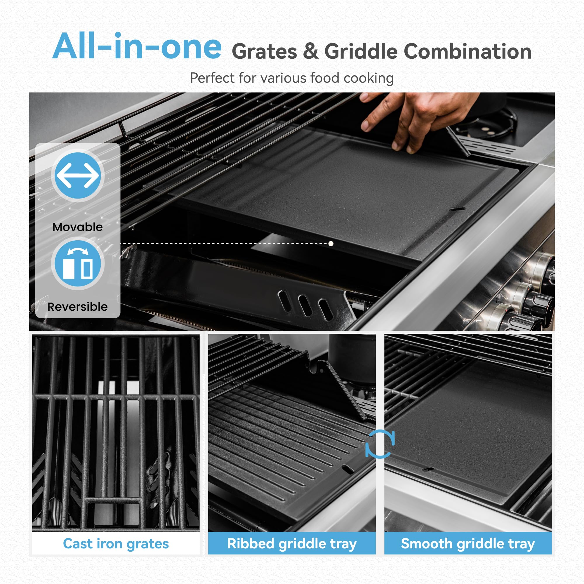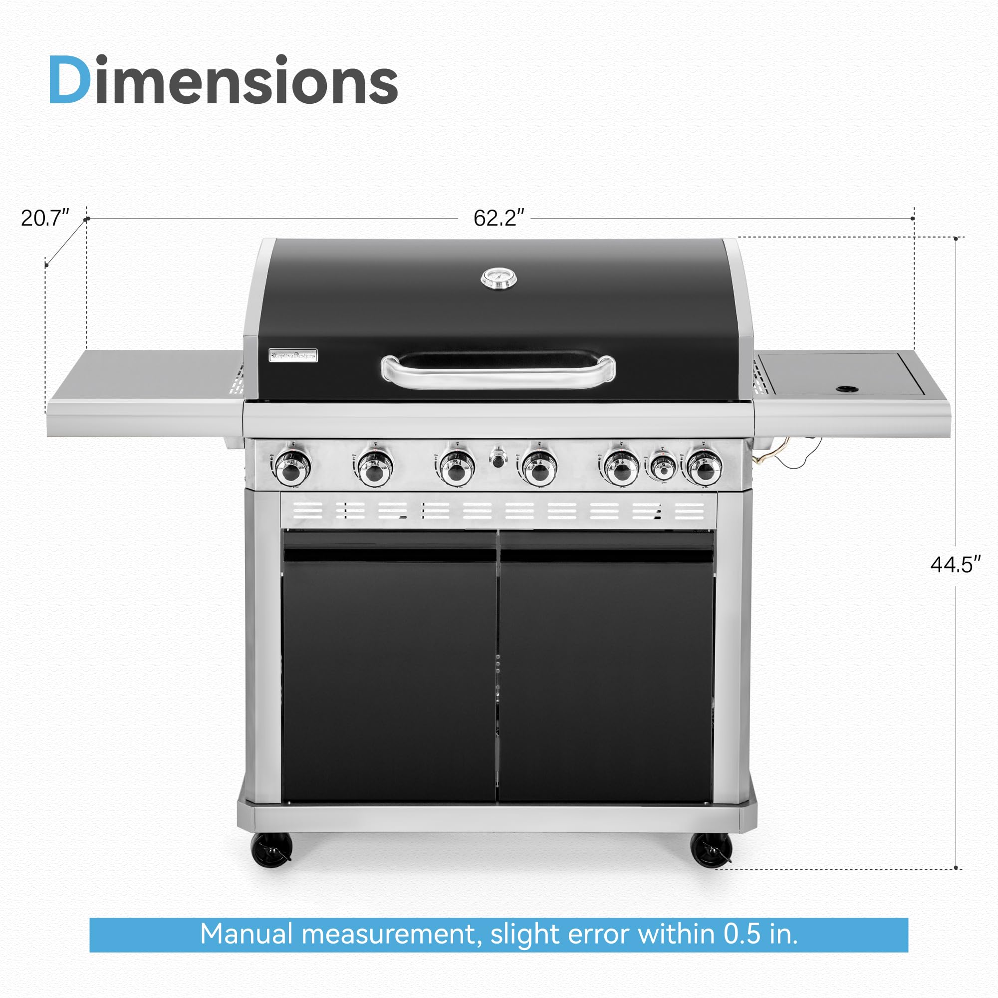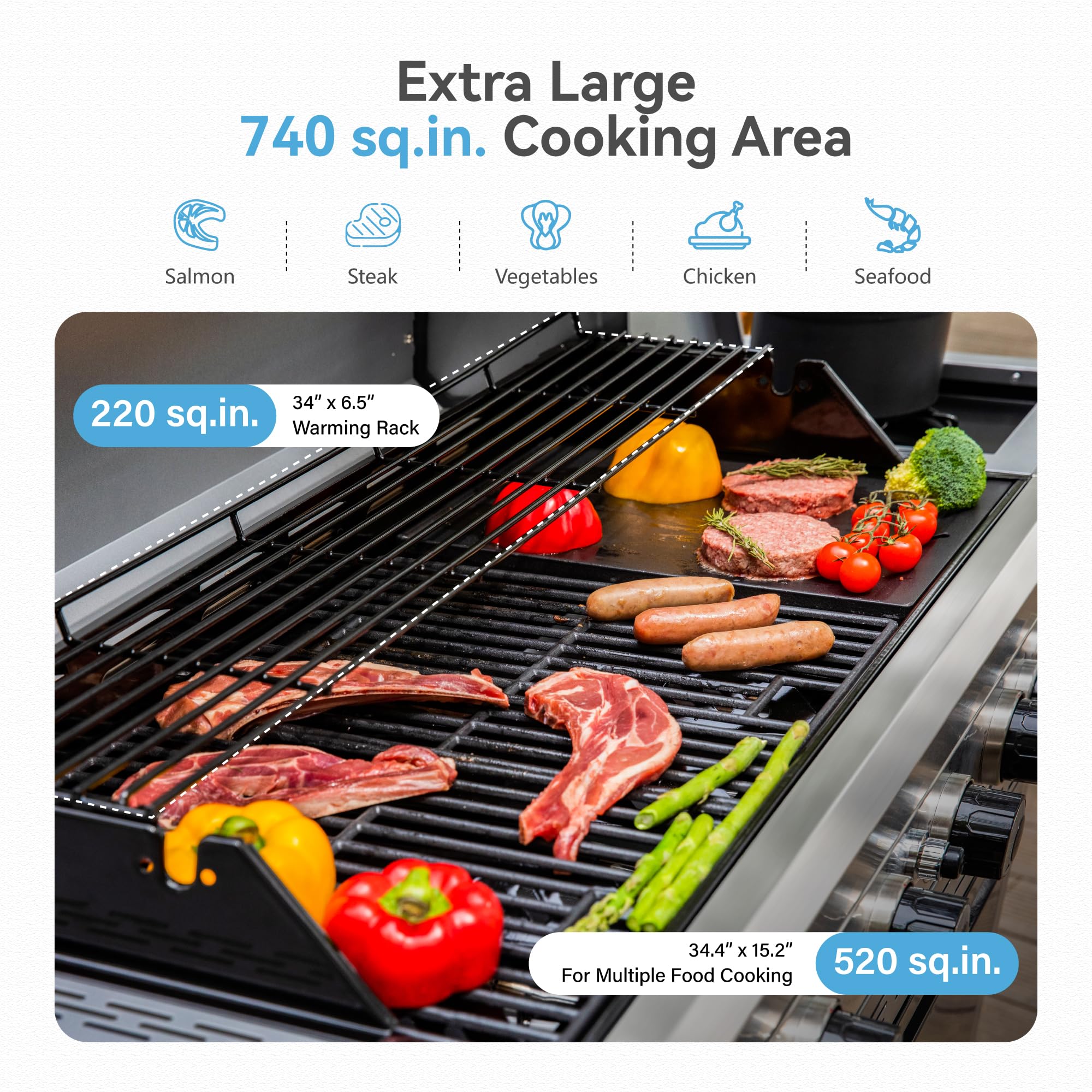 【LARGE COOKING AREA】The gas grill's 6 stainless steel tube burners deliver 42,000 BTU of cooking power with a wide temperature range. Offering 520 sq. in. of cooking area over the porcelain-enameled cast iron grill grates and plate, and 220 sq. in. of warming rack area. TOTAL 740 sq. in.offers the room to cook lots of food for big groups