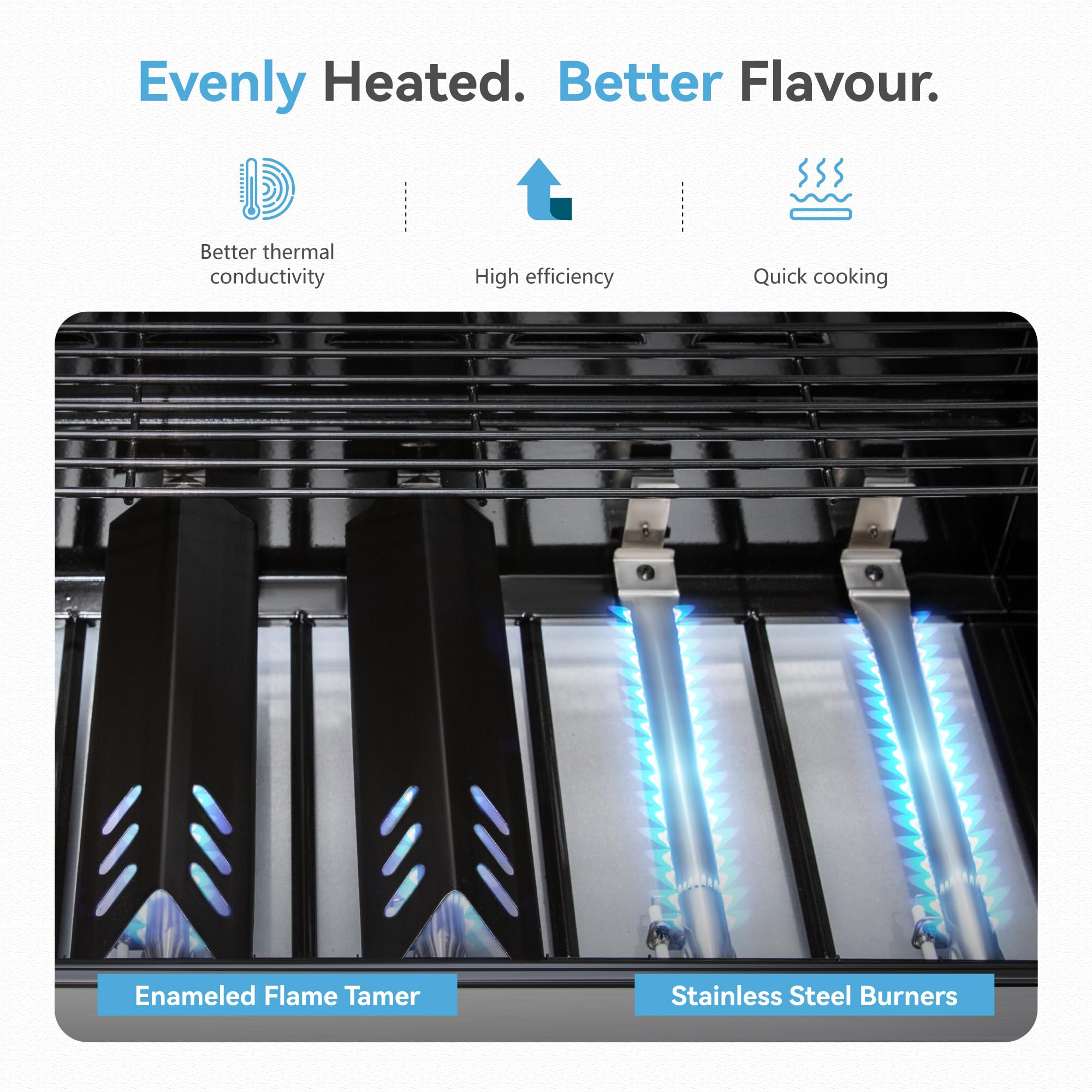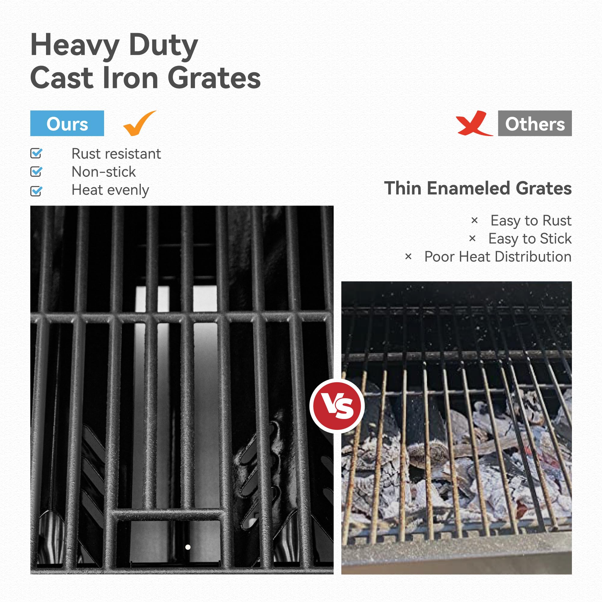 【PORCELAIN-ENAMELED CAST IRON GRILL GRATES & PLATE】 Porcelain-Enameled Cast Iron Grill Grates & Plate is your best choice for long-term durability and for making the best-grilled food. It provide a nonstick surface for cooking when properly seasoned and cared for. Cast Iron withstands high temperatures like a champ, providing fantastic searing. They retain heat and distribute it evenly