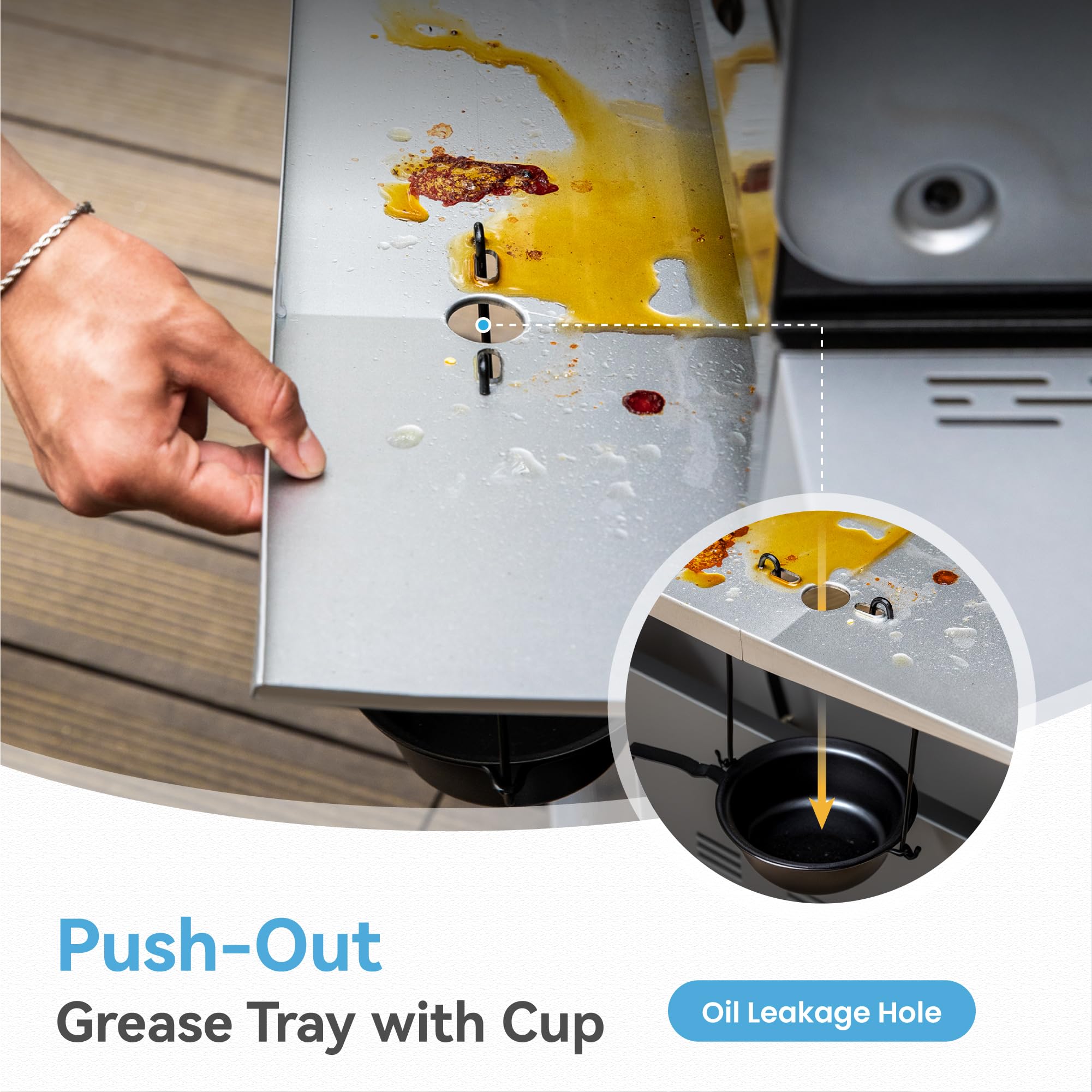 【EASY CLEANUP AND MAINTENANCE】Porcelain-enamel finish prevents sticking and allows for easy clean-up. Also experience the ease of post-BBQ cleaning with our full-sized, slide-out grease tray. Simply slide out to remove grease and residues, making cleanup a breeze and keeping your grill ready for the next delicious meal