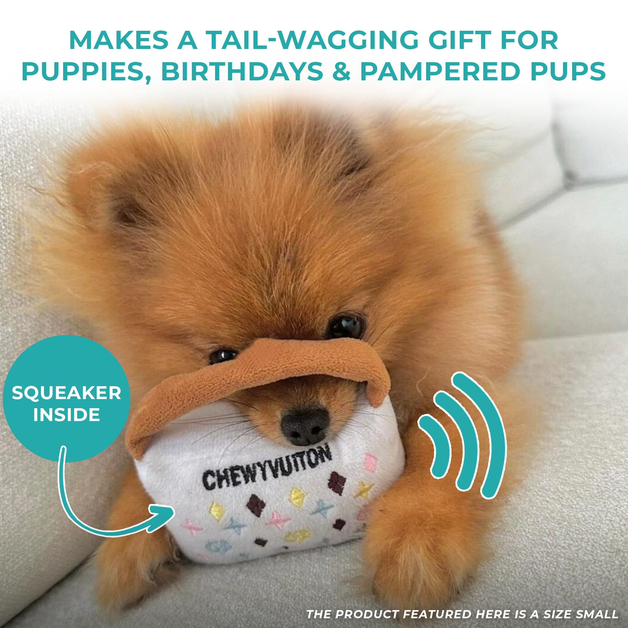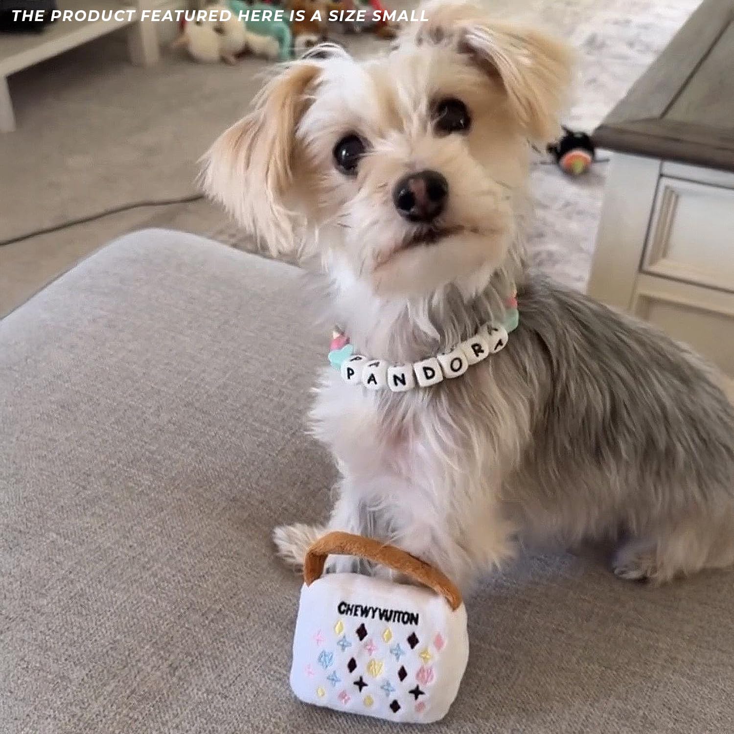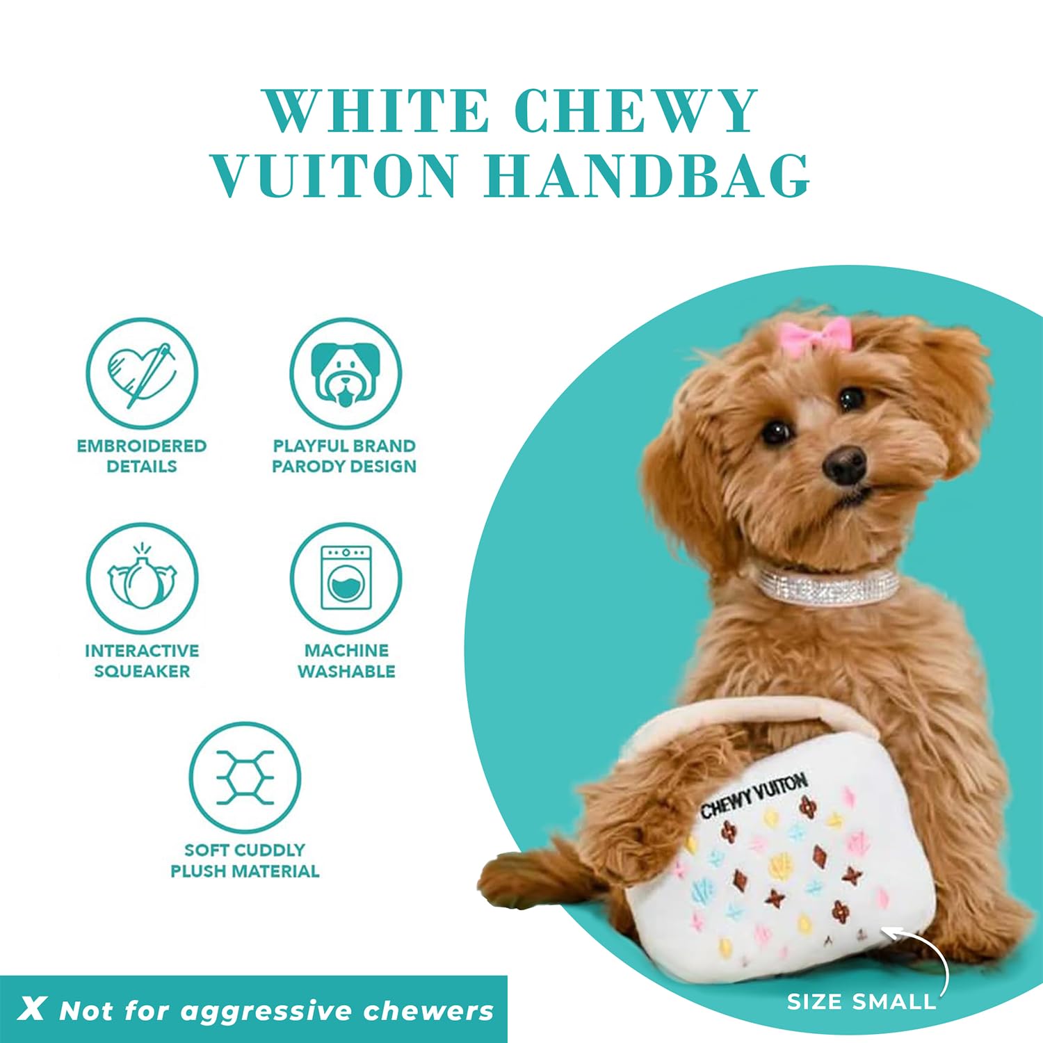 Funny Parody Plush Dog Toy: Let your furry fashionista fetch some fashion-forward fun with this White Chewy Vuiton Handbag dog plush toy, featuring an iconic white with a multicolor monogram pattern on the soft plush exterior and a built-in squeaker hidden inside; it’s a playful, cute squeaky dog toy that combines style and fun, measuring 3"x5”x1.5”