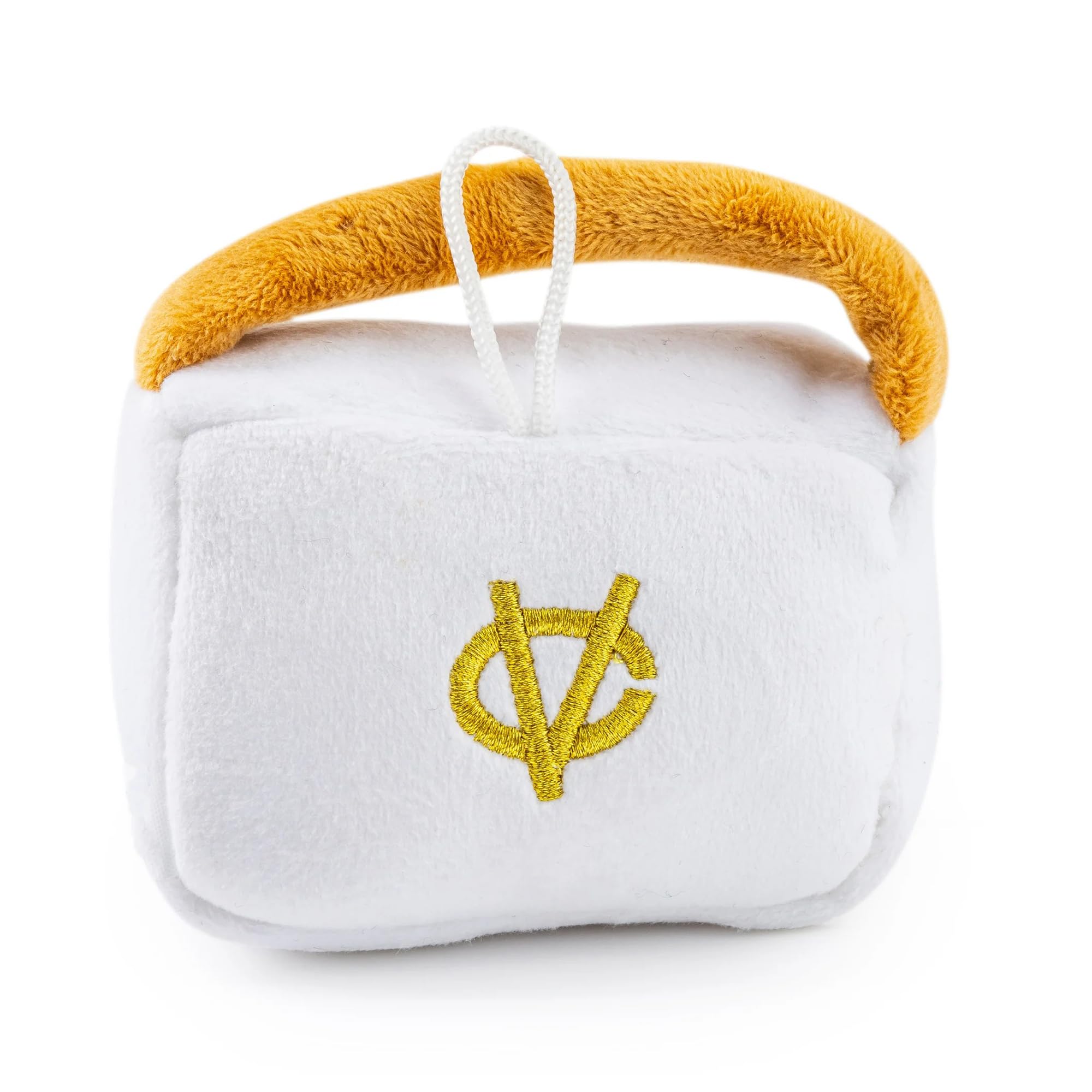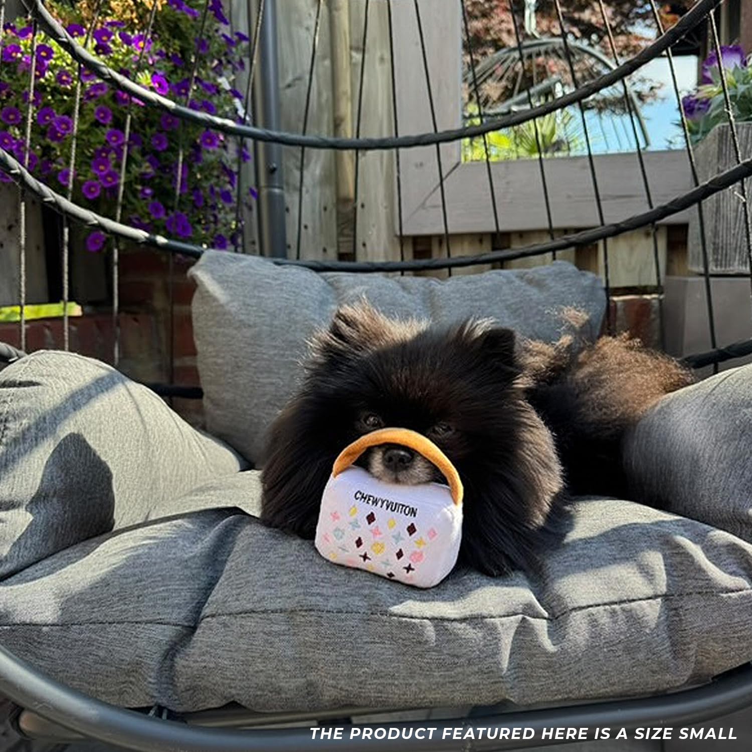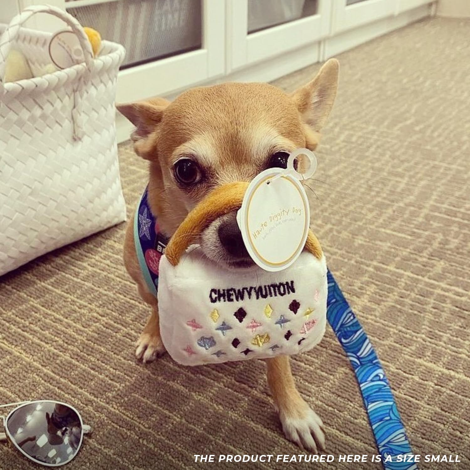 Funny Parody Plush Dog Toy: Let your furry fashionista fetch some fashion-forward fun with this White Chewy Vuiton Handbag dog plush toy, featuring an iconic white with a multicolor monogram pattern on the soft plush exterior and a built-in squeaker hidden inside; it’s a playful, cute squeaky dog toy that combines style and fun, measuring 3"x5”x1.5”