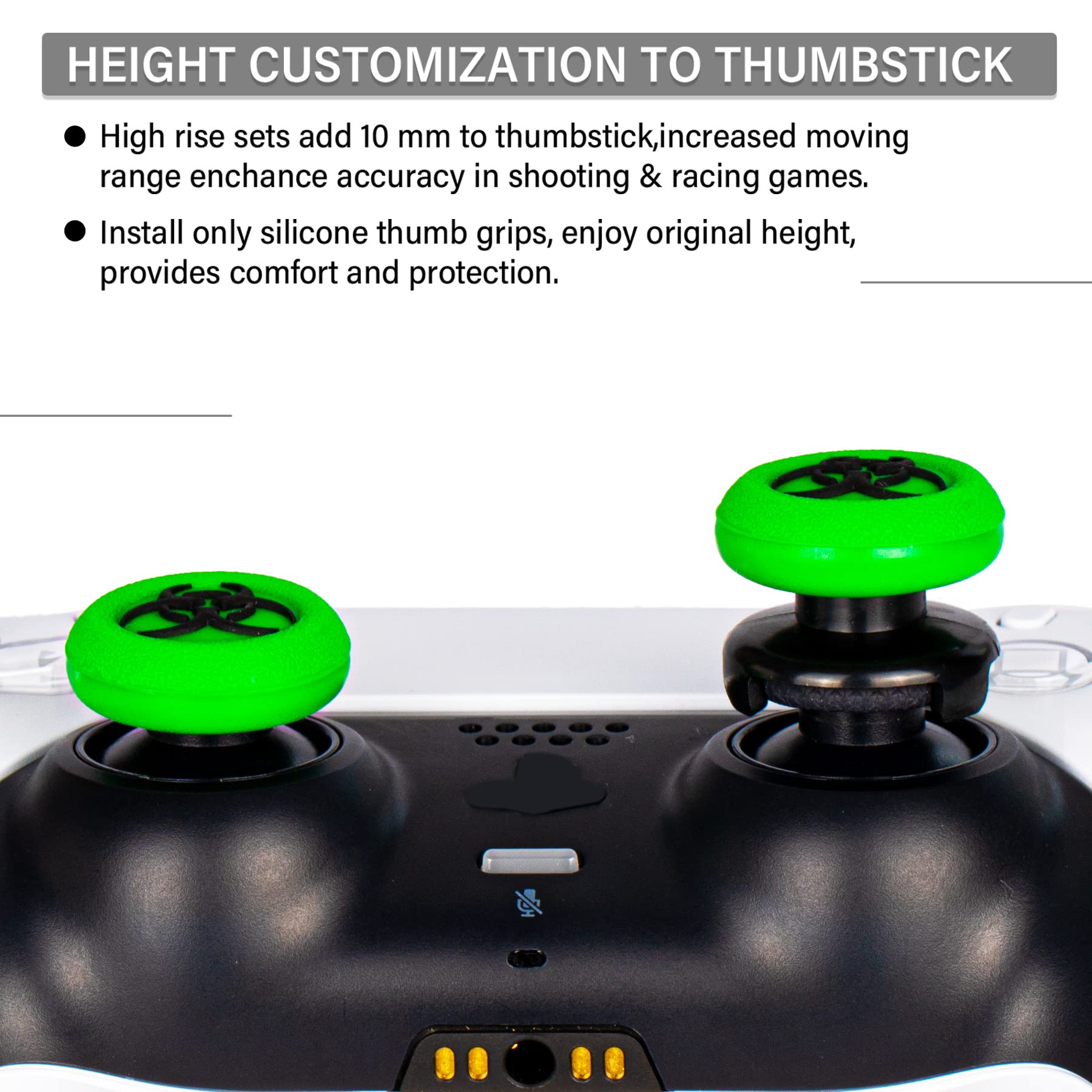 Different Height Options - Install extender & grips sets adds 10 mm height to the stick, enhances precision in shooting, racing games. Install only silicone thumb grips, enjoy original height and ideal comfort and protection;