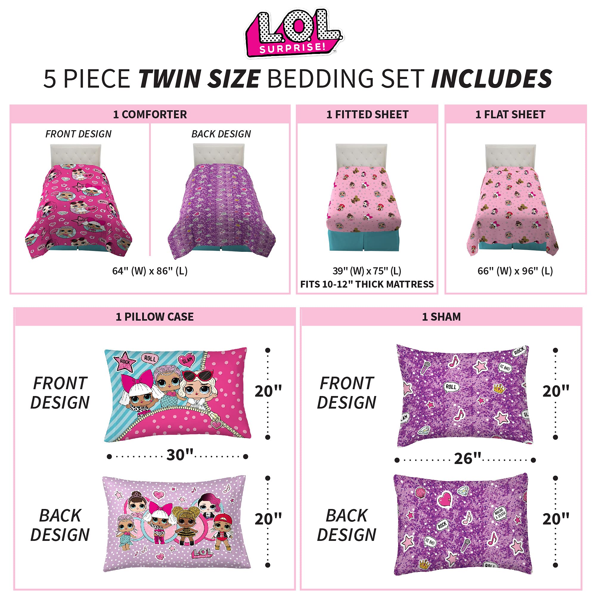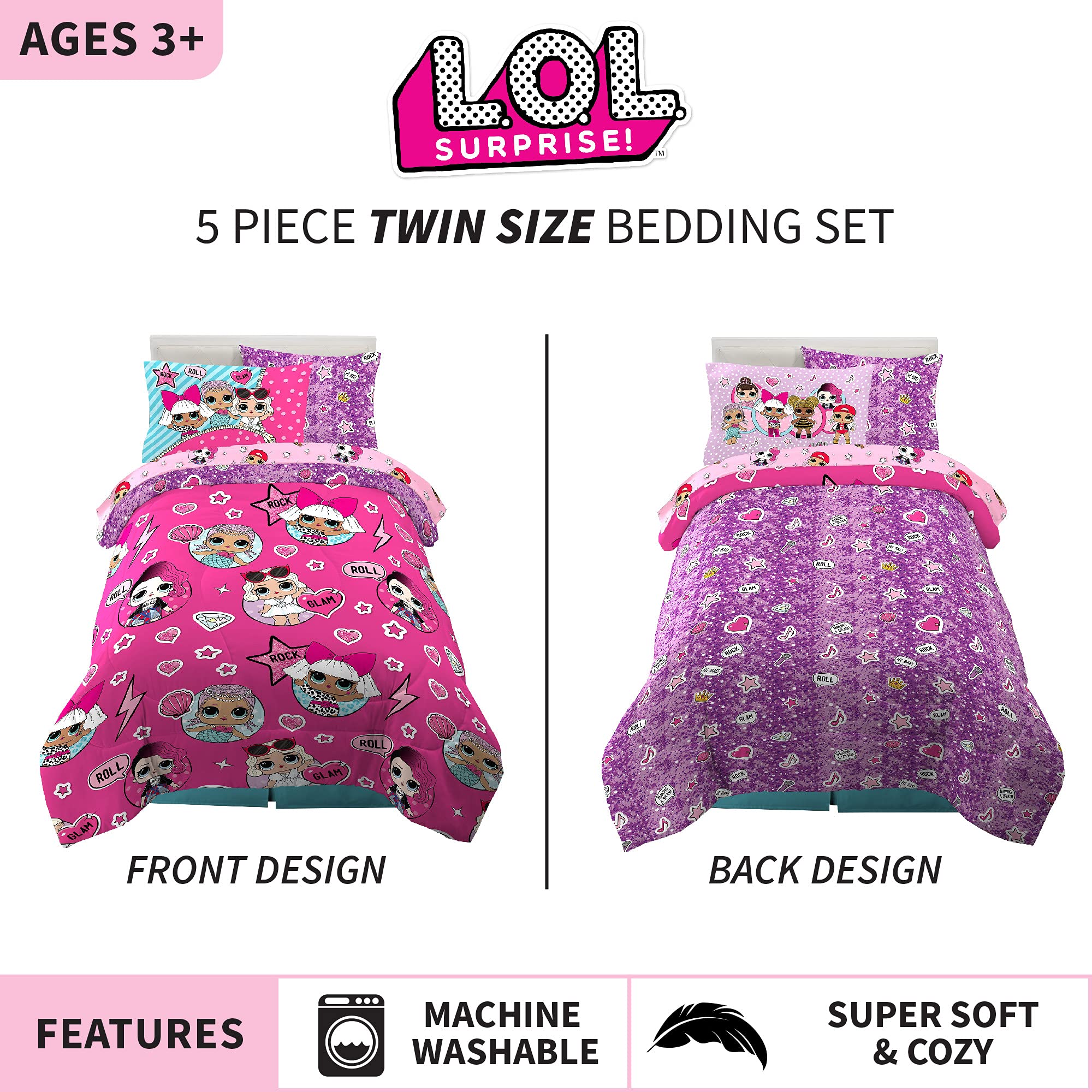 LOL SURPRISE DESIGN: Give her bedroom a rock-and-roll makeover with colorful bedding featuring the adorable LOL Surprise dolls. Diva, Rocker, MC Swag, Queen Bee, Merbaby, and Fancy deliver a dynamic performance on this animated bedding set.