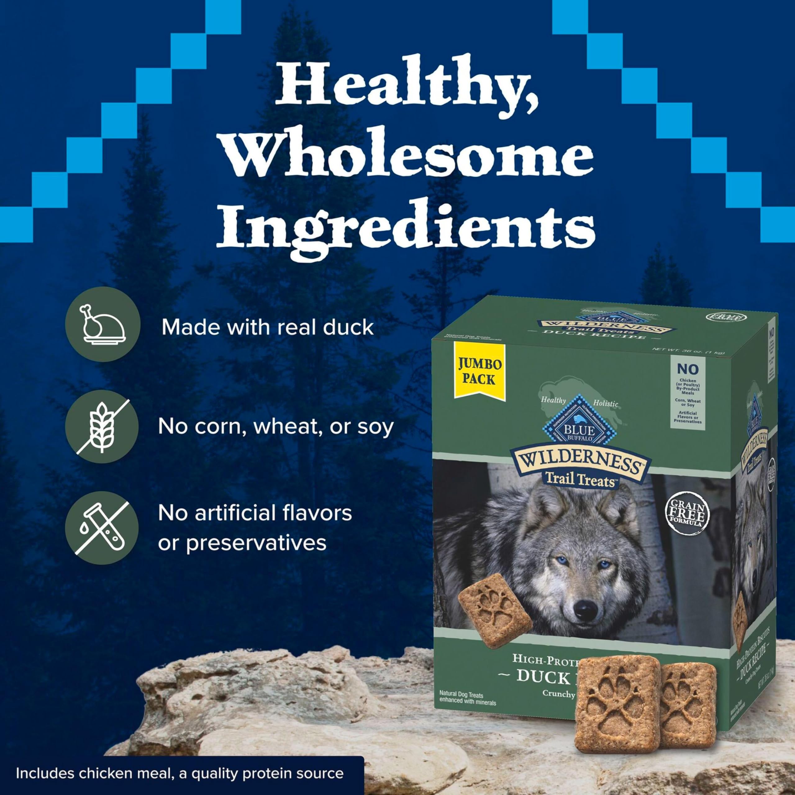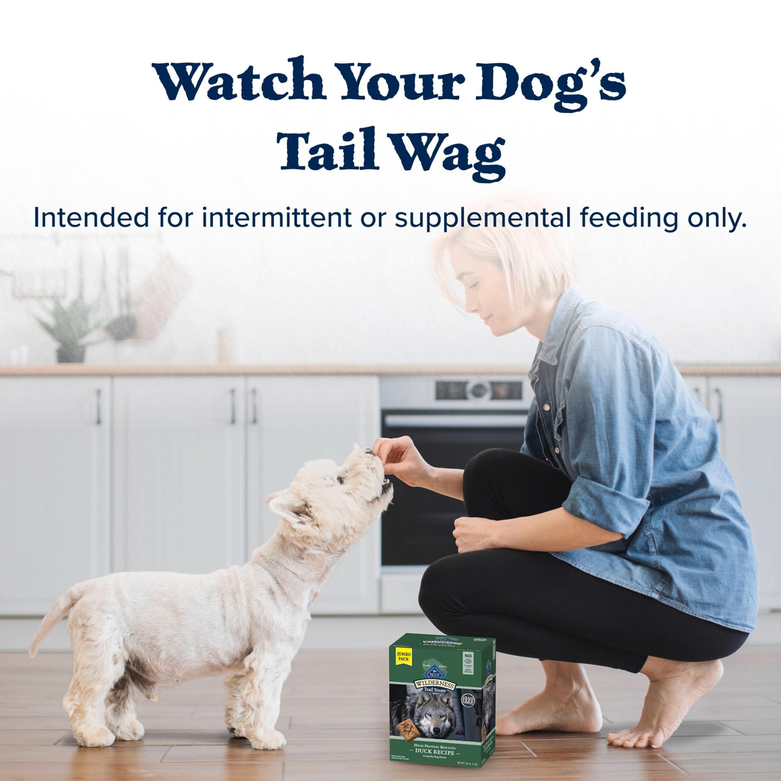 Contains: One (1) 36-oz bag of BLUE Wilderness Trail Treats High-Protein Dog Biscuits, Duck Recipe