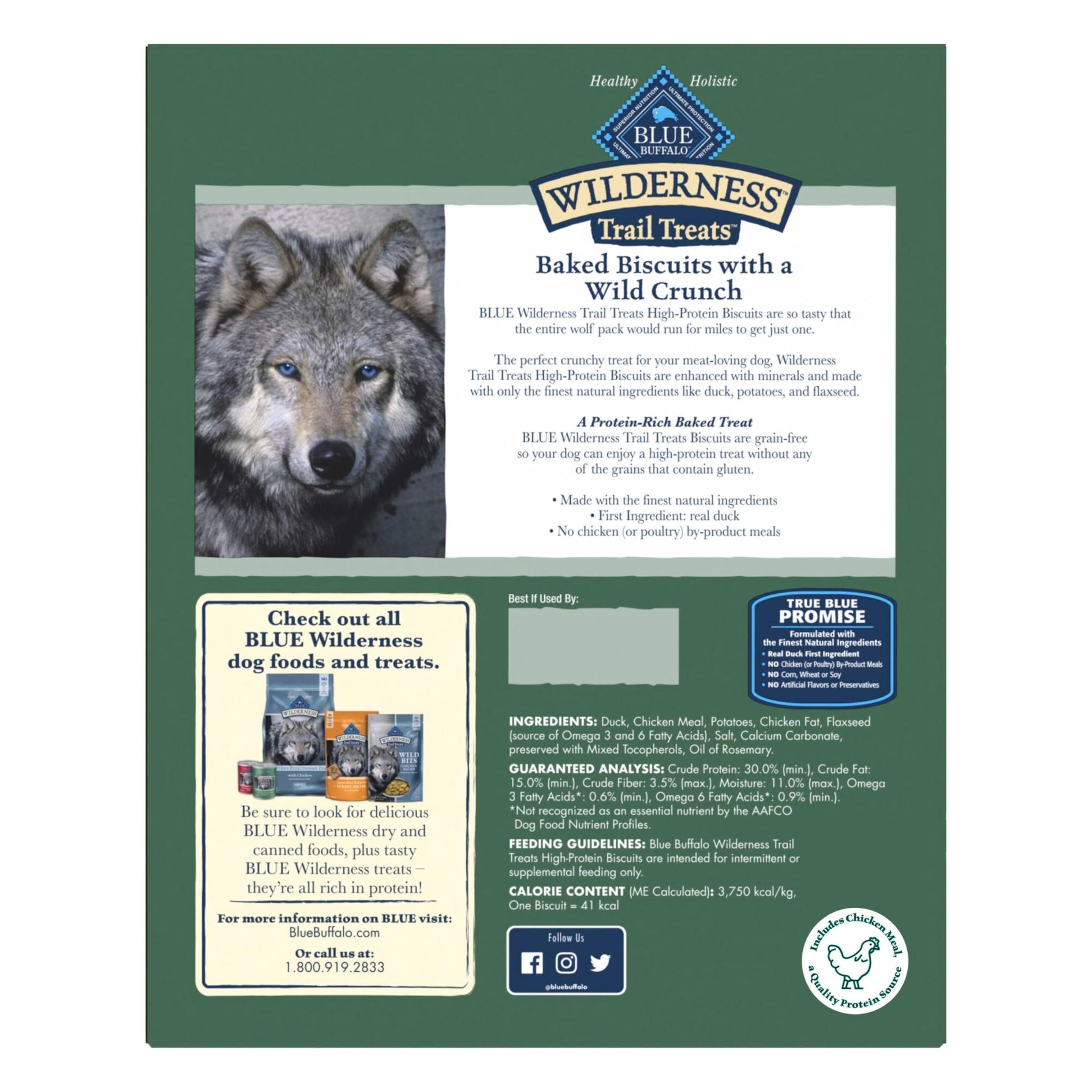 A perfectly crunchy dog treat for meat-loving dogs, BLUE Wilderness Trail Treats High-Protein Crunchy Dog Biscuits feature real duck as the first ingredient. These High-Protein and grain-free dog treats are made with the finest natural ingredients. Bring out the wolf inside your dog with tasty duck, potatoes, and flaxseed packed into every bite. Like all Blue Buffalo dog treats, these treats for dogs don't contain chicken (or poultry) by-product meals, corn, wheat, soy, artificial flavors, or preservatives. Watch your dog's tail wag when you reward them with BLUE Wilderness Trail Treats High-Protein Crunchy Dog Biscuits.