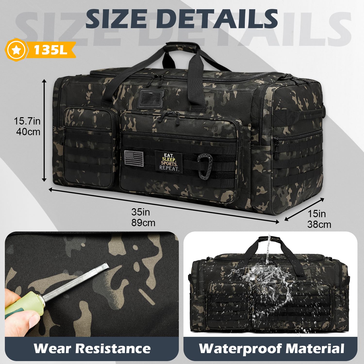 MOLLE Webbing : This tactical duffle bag includes 2 patches and 1 carabiner. You can also personalise the bag by replacing the patches with different ones according to your preference. Designed with MOLLE webbing on the front, you can hang frequently used accessories or pouches for extra capacity. The removable padded shoulder strap makes it easier on your shoulders so you can go further and enjoy longer activities