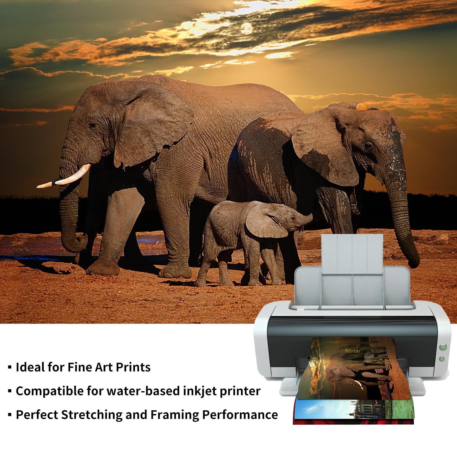 Décor Matte Canvas 340g is a fine woven fabric specially coated for inkjet printing. This special-coated fabric has an excellent color saturation with deep black density and fast-drying and water-resistant properties suitable for fine art reproductions. It can be stretched over wooden frames with no cracking or flaking.