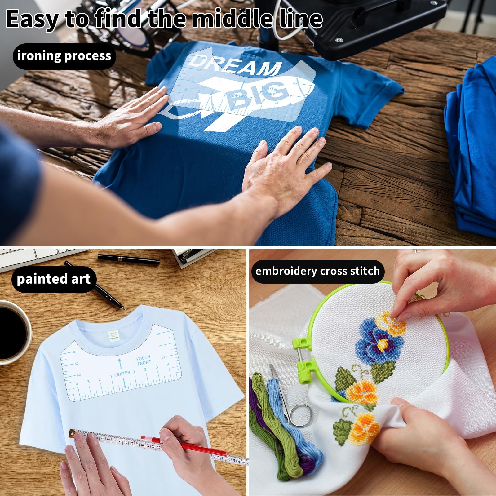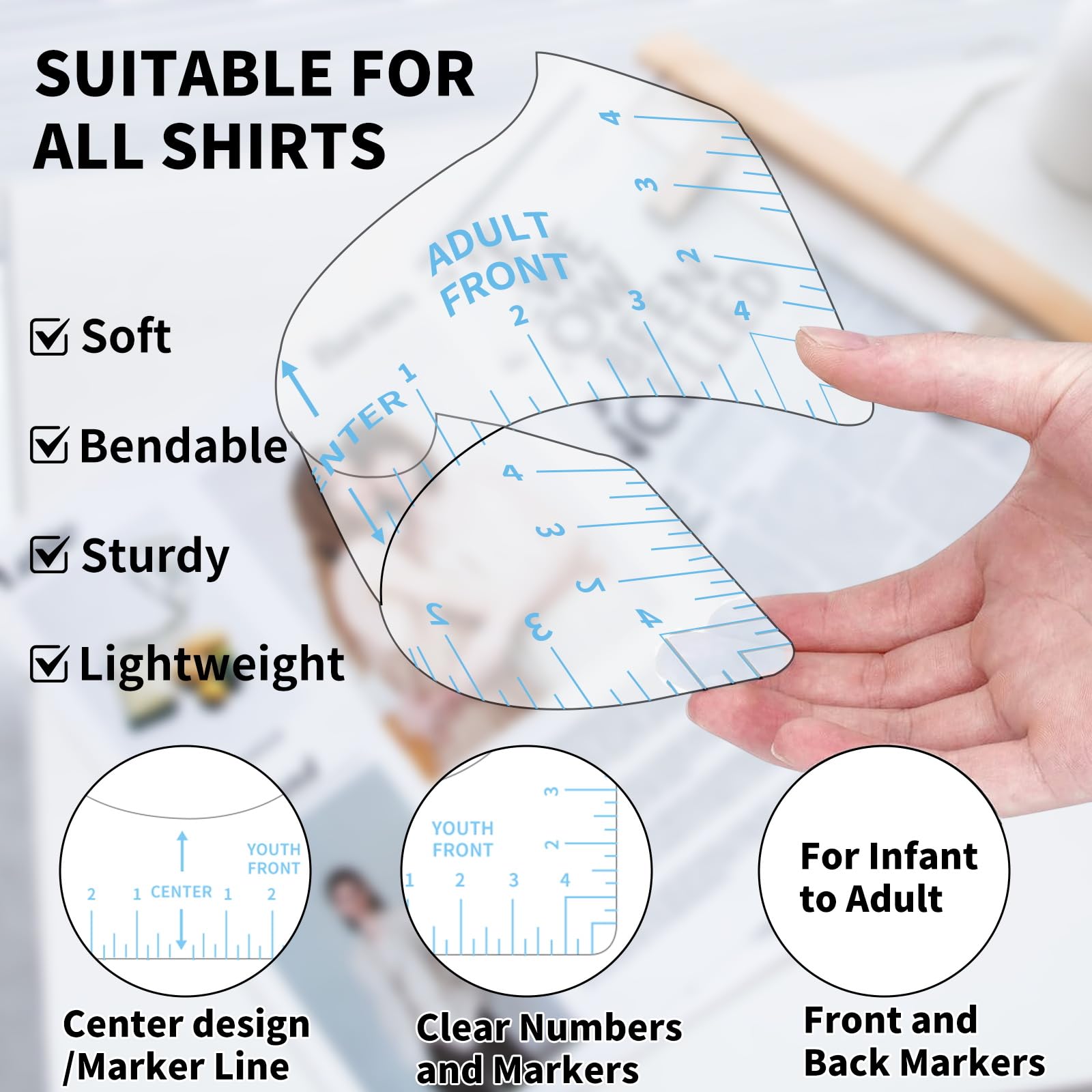 T-shirt Ruler is a quick, and easy way to try out the t-shirt alignment tools in various sizes ăFour Kinds Ruleră Numbers and markers are clearly on the T Shirt Ruler Guide that is easy to read against any shirt color. 4 sizes(childrenăyouthăadultăV-neckďźof T-Shirt Alignment Tool to meet your various production needs for all kinds of clothes! ăSturdy Soft RulerăT-shirt Alignment Rulers can be twisted at will and can be reuse. Never worry about pvc ruler being broken! ăSHIRT GUIDE TOOLă Help you to make left, center or right alignments and save time on center your designs. This Ruler is very compact and easy to carry on. ăPractical Giftsă T-Shirt Centering Rulers are designed for sewing projects and handmade projects, for you to make your own t-shirts, you can prepare some finished products as birthday or Christmas gifts for your family, relatives or friends