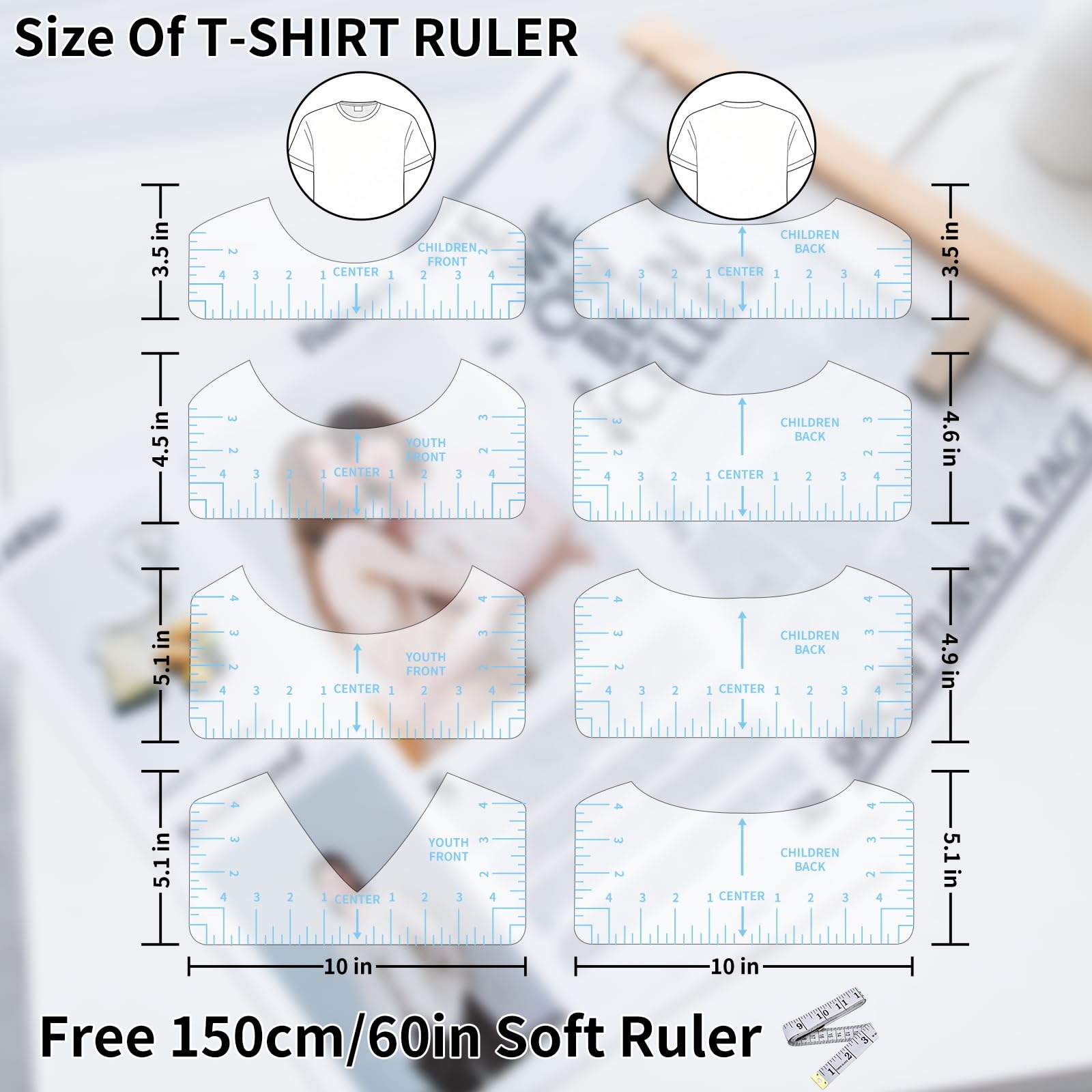 đăT-Shirt Alignment Tool Set ăT shirt ruler guide include 8pcs different sizes rulers, the size are: Adult: 10"x 4" / Youth: 10"x 3.5" / V-neck: 10"x 4" / Children:10"x 2.5". Both includ front and back rulers. Help you to make alignments and save time on center your designs.