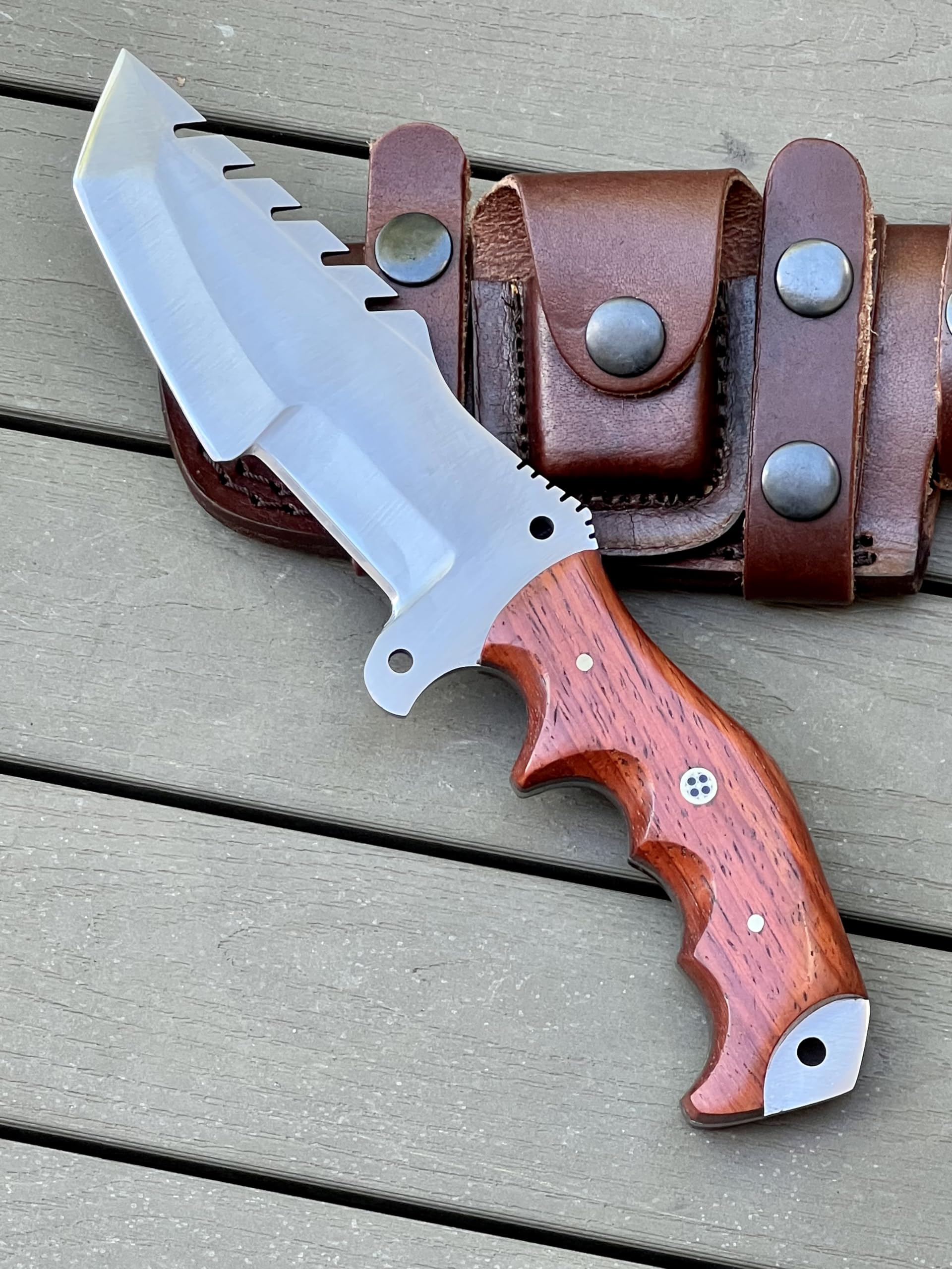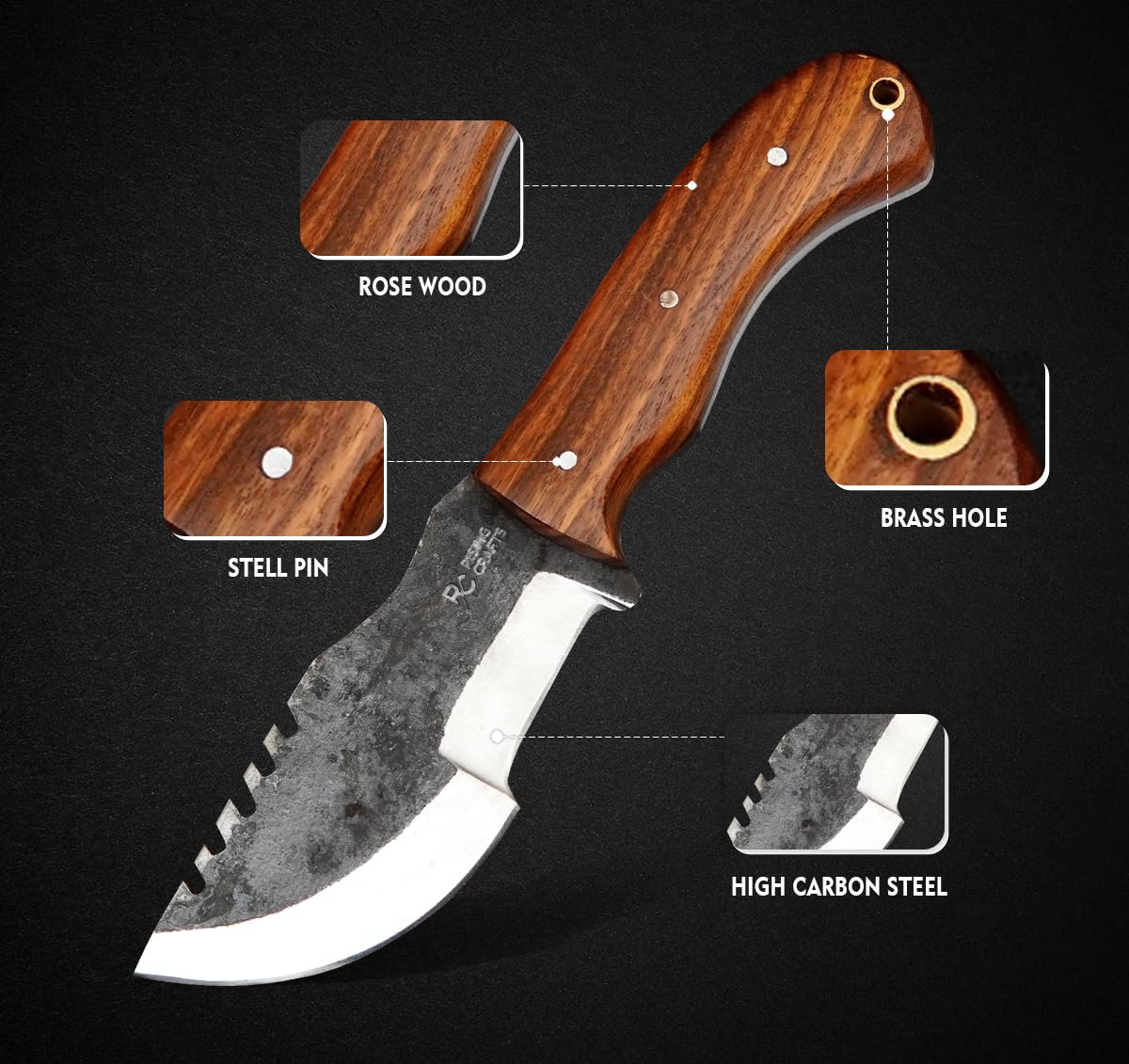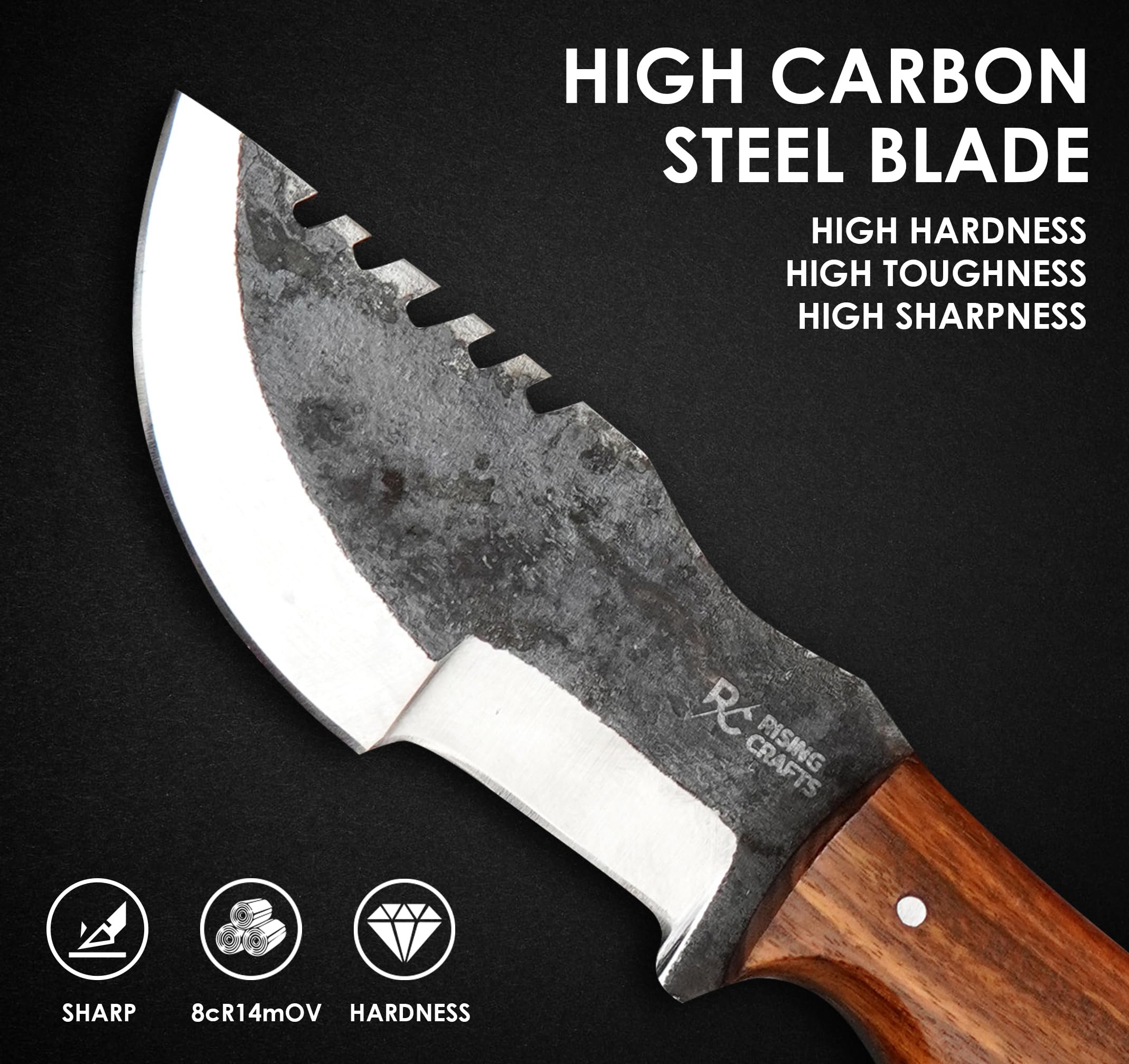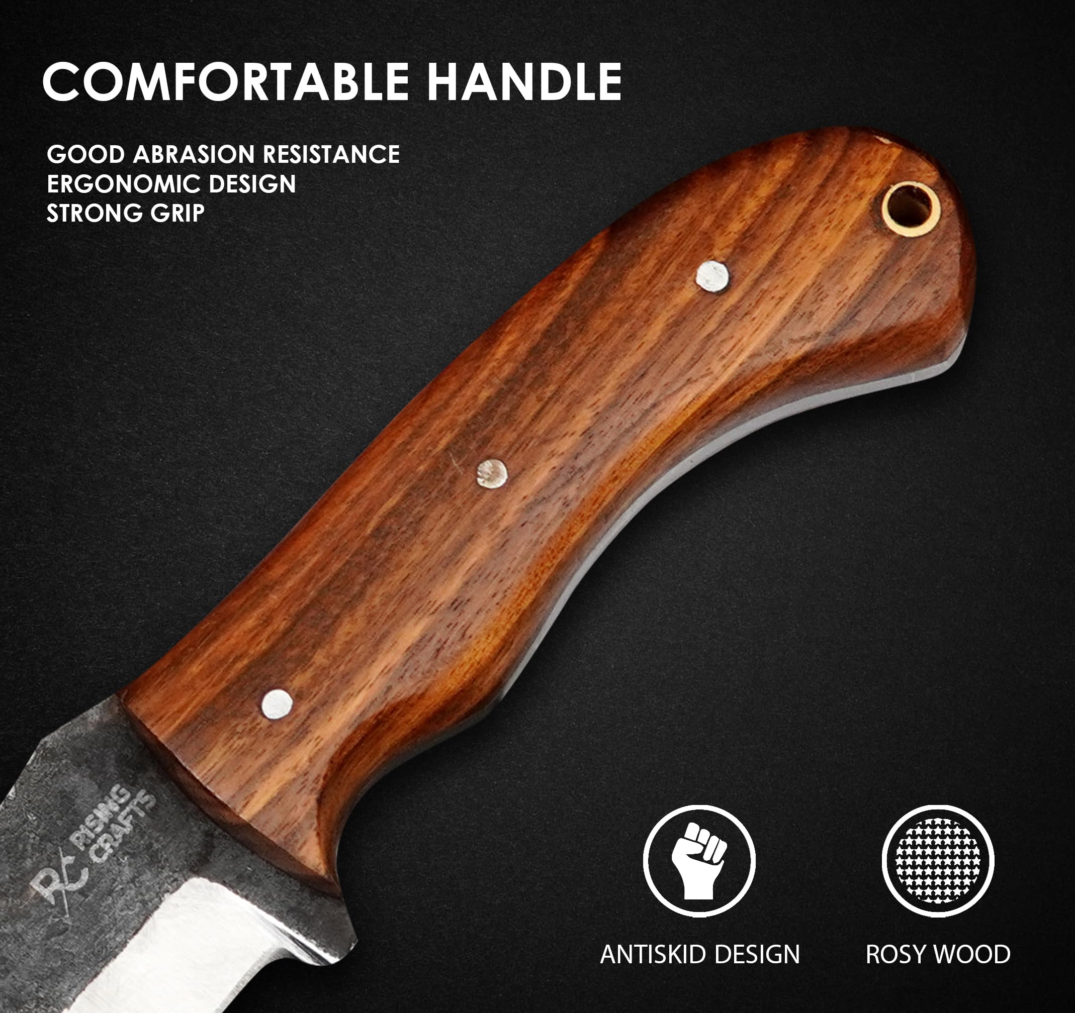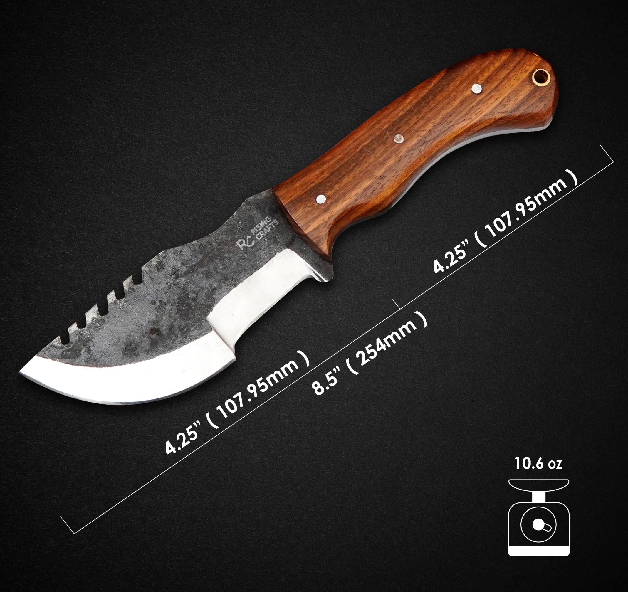 ✅ RISING CRAFTS This Full Tang High Carbon Steel Tracker Knife is designed as a Hunter! It is best as a Hunting, Camping, Tracking, Survival, Skinning, Bushcraft, Tactical, And For Outdoor Camping a complete solution of an Outdoor Camping Knife. 8.5-inch total length, 4.25-inch handle and 4.25-inch blade. When You're Not Using Your Knife, You Can Put This Beautifully Handcrafted Piece of Art For Display.