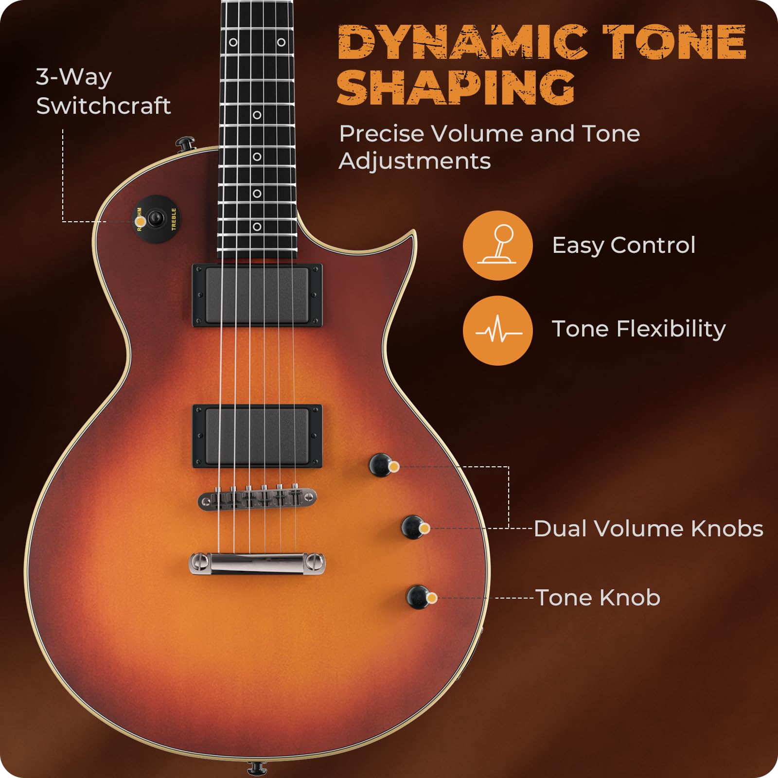 EXCEPTIONAL PAF-STYLE FIDELITY: Experience the warmth and versatility of dual humbucker pickups, delivering smooth lows, complex mids, and sweet highs. Perfect for both clean and overdriven tones, the 3-way toggle switch and three control knobs (two volume, one tone) provide precise sound control for any playing style.