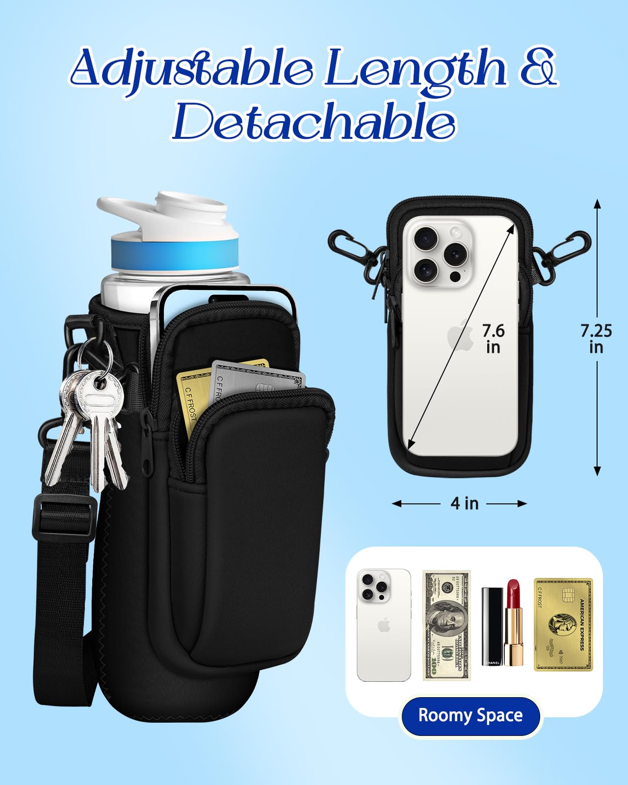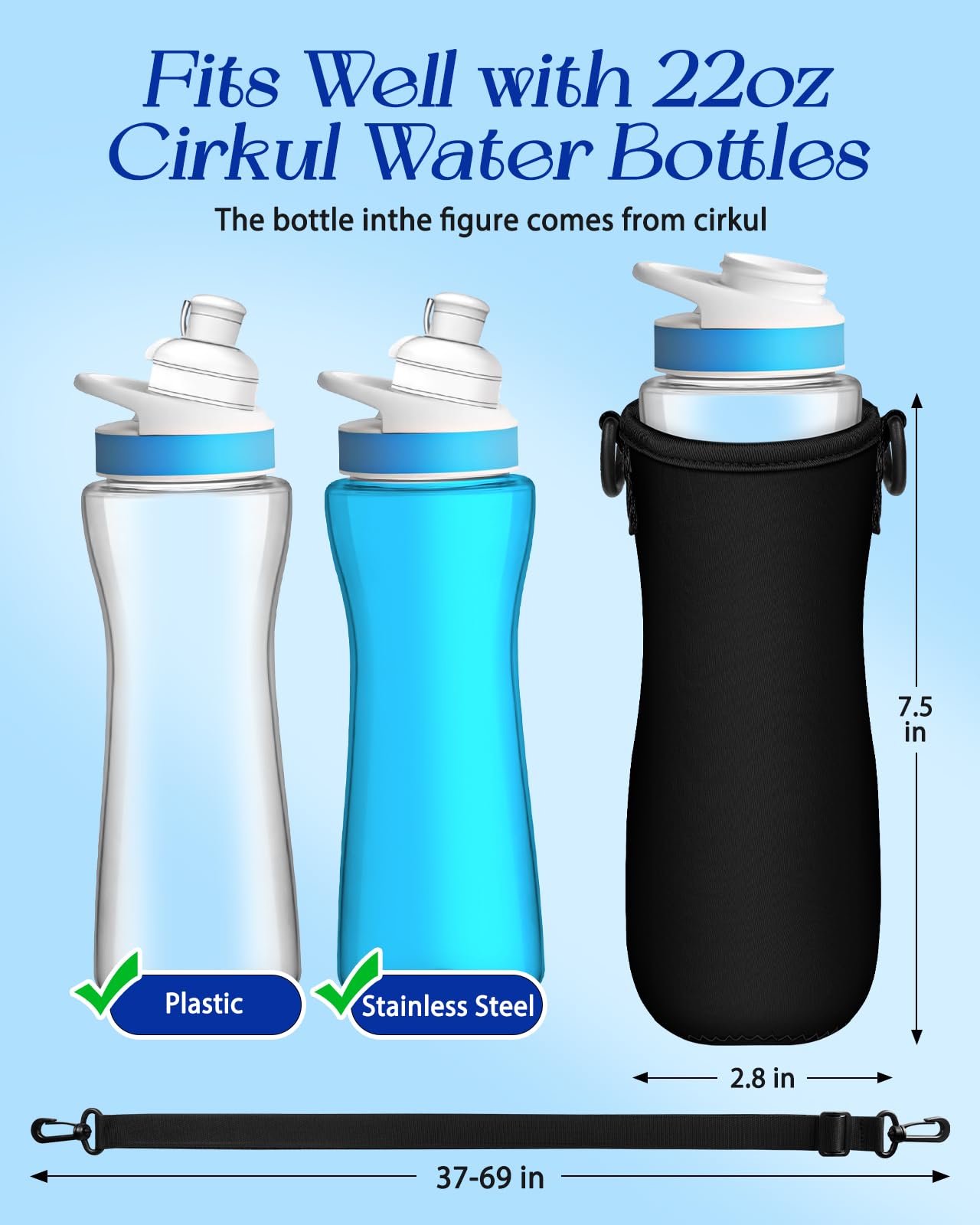 Compatible with Cirkul 22 oz with Crossbody Shoulder Strap and Detachable Phone Pouch: It is suitable for both plastic and stainless steel bottles. The strap is adjustable, allowing you to carry it easily either crossbody or over the shoulder.