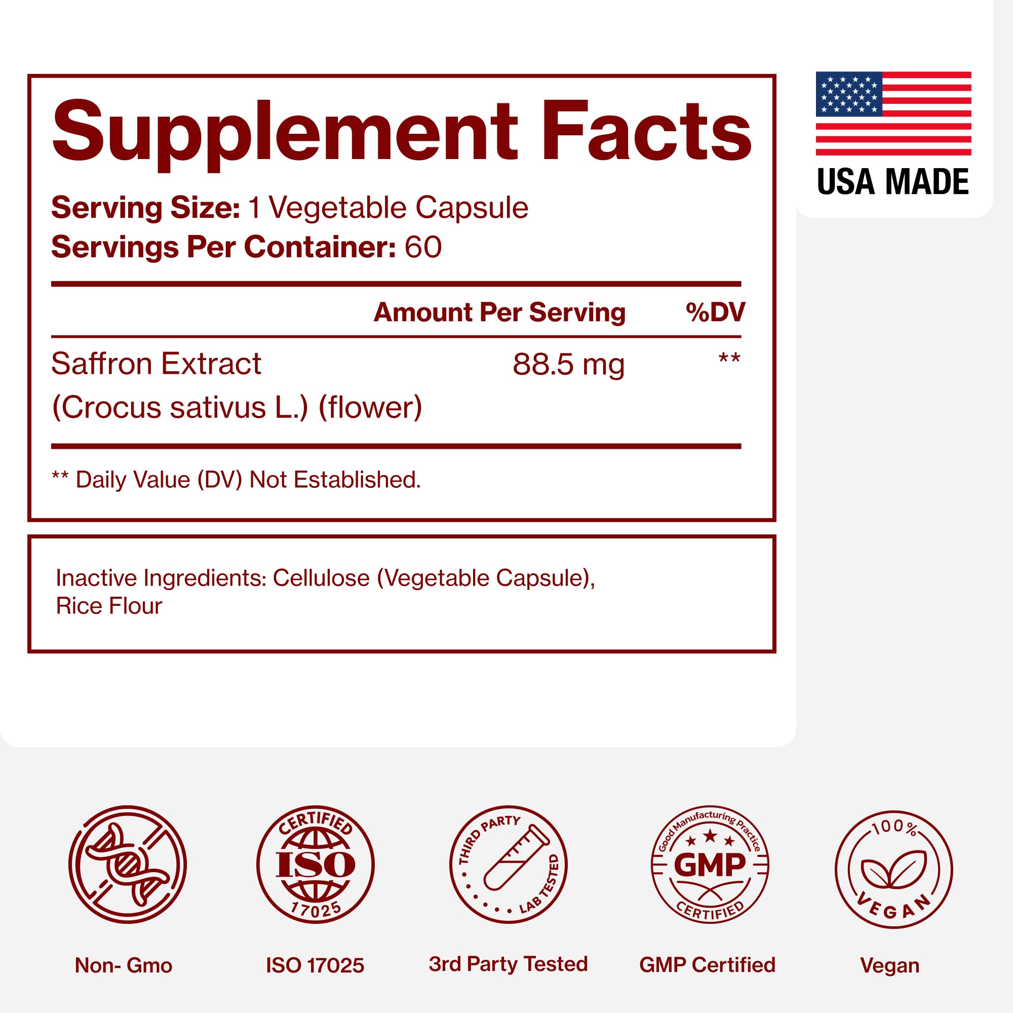 PURE, NATURAL & TRUSTED - Pure Saffron is natural, it contains no Magnesium Stearate, caffeine, GMOs, gluten, dairy, soy, preservatives, artificial colors or flavors. Made with Kosher & Halal ingredients. So you can reap the benefits without any of the Nasties. Practitioner Grade, USA Made, NSF Certified, Third Party Tested with a Satisfaction Guarantee.