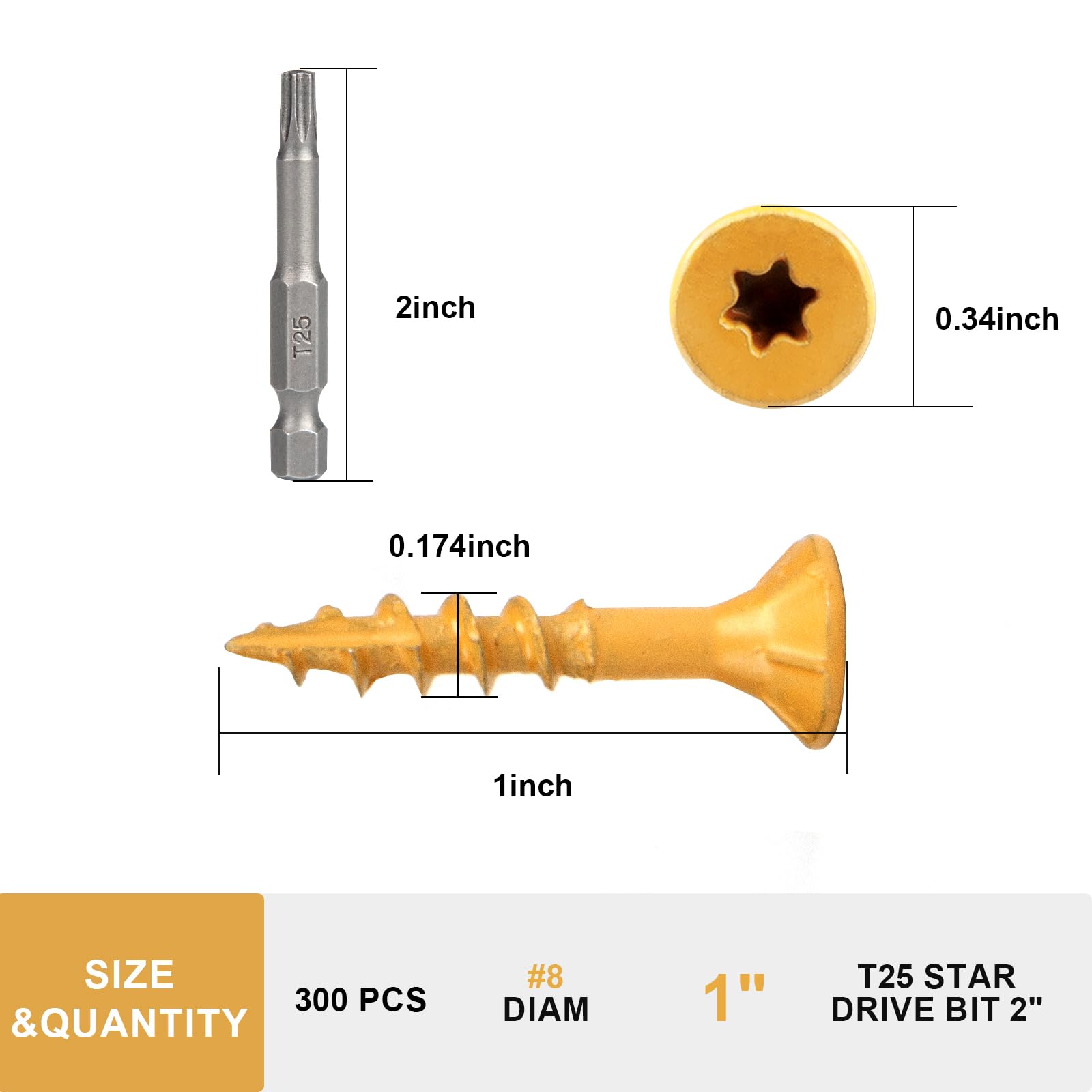 Product Packaging: #8x1 inch high-quality carbon steel deck screws, 300 pieces, With T-25 star drive drill bit. Fmjdnls Deck Screws are arranged in a beautiful container box for convenient storage, Easy identification