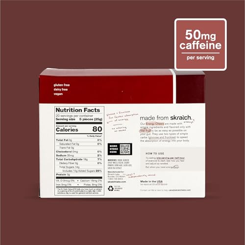VERSATILE ENERGY SOURCE: Skratch Labs Energy Chews are a great alternative to traditional energy gels and blocks, with 80 calories and 19g of carbohydrates per serving, along with both glucose and fructose to speed up the absorption of energy in your body. Perfect for quick energy during any activity.