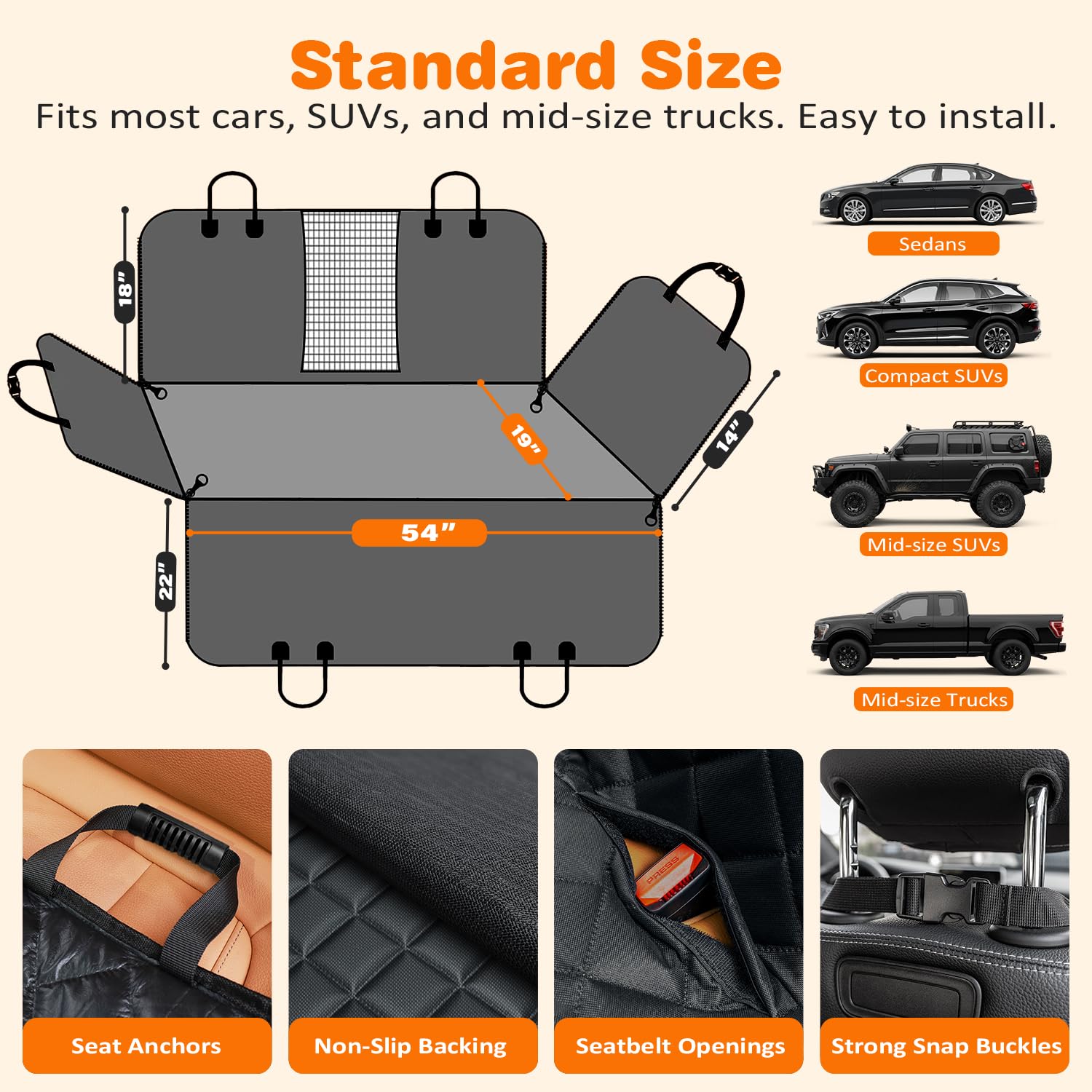 Fits Sedans, SUVs, Compact &Mid-size Trucks: Before ordering, please confirm whether your backseat length is close to 54 inch. The Standard size fits Sedans, SUVs, and Compact & Mid-size Trucks. It can cover the entire back seat for ultimate protection and hassle-free rides. Now you can enjoy family excursions without damaging your car!