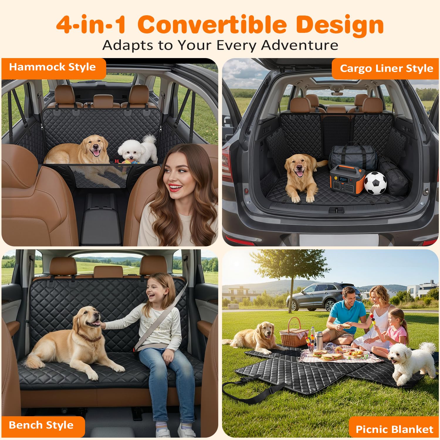 4 in 1 Dog Car Seat Covers: It can be converted into different styles, including Dog Hammock for Car, Bench Back Seat Cover, Trunk Cargo Liner, and Picnic Mat. Whether you're going on a camping trip, beach day, or just a quick ride to the vet, there's a style that suits your needs