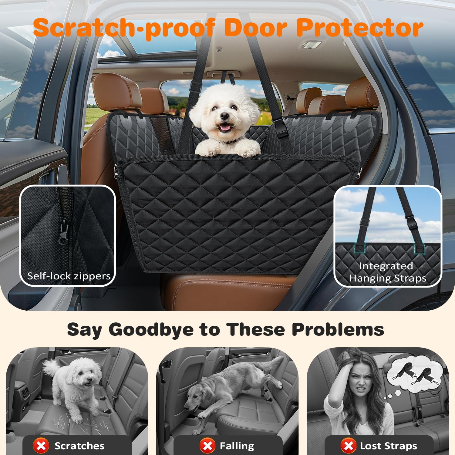 Safety First: The dog car seat cover for back seat features zippered side flaps to prevent dogs from falling onto the floor while protecting your car door and seat. Adjustable straps, seat anchors, 2 velcro seatbelt openings and non-slip backing keep pets from sliding around while keeping the seat cover in place