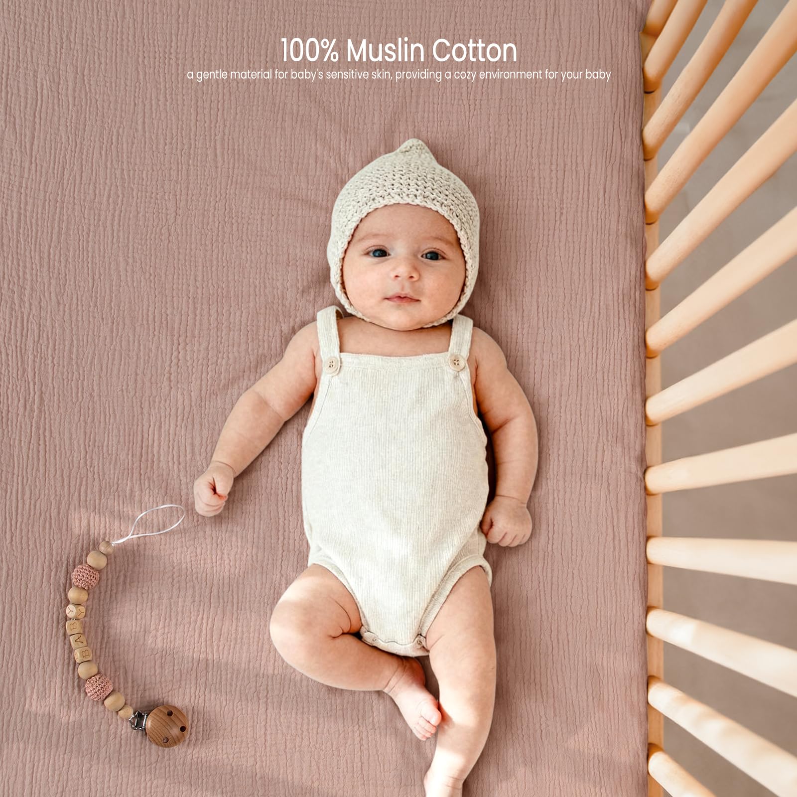 SOFT AND COMFORTABLE - The crib sheets is made of 100% muslin cotton, super soft, comfortable, and won't irritate your baby's delicate skin. Lightweight, breathable muslin crib sheets stay cool even in warm weather.
